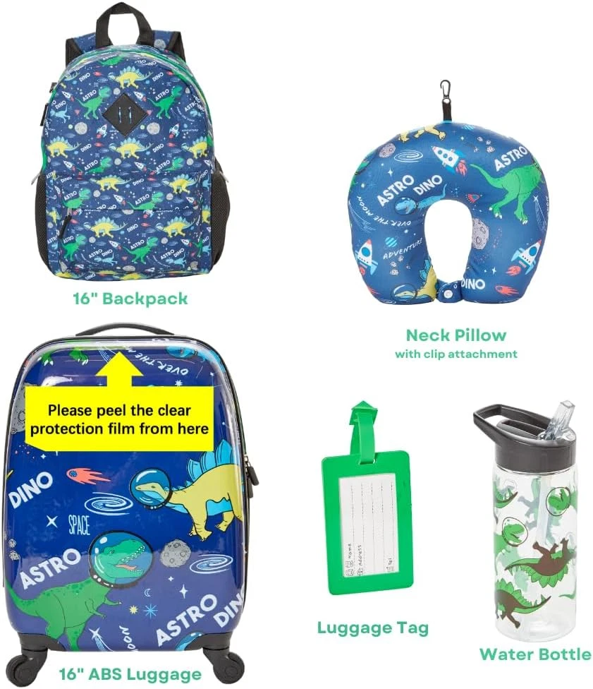 Store New Arrivals Add to Favorite View Feedback Contact 5 Pc. Boys’ Dinosaur Space Rolling Suitcase Set with Backpack, Neck Pillow, Water Bottle, and Luggage Description Item model number RF10023 Style Dinosaur Space Capacity Total 1 Centiliters Product Dimensions 16 x 12 x 8 inches Country of Origin China Item Weight 5.49 pounds Department Boys CARRY ON BOYS LUGGAGE SET WITH WHEELS – Boys will love the dino astronaut print, and parents will love the practical and durable design. The roomy interior of the 16 inch hard side suitcase holds all he needs for weekend trips and sleepovers, with interior mesh pockets and secure strap closures. COMES WITH A 16 INCH DINOSAUR BACKPACK - The matching printed backpack has a special band that easily attaches it to the extended luggage handle. It has padded adjustable straps, a front zip pocket, reflective strips, and side mesh pockets. INCLUDES TRAVEL ACCESSORIES - The set comes with a matching dinosaur printed BPA free water bottle, luggage tag to be personalized (4” x 2.5”), and neck pillow with snap closure (12” x 4” x 10”). RETRACTABLE HANDLE – For easy travel, the telescopic handle can be safely stored. This set makes it easy for kids to pack and manage their own luggage. IDEAL FOR TRAVEL WITH KIDS 5+ and Up – The 16 inch suitcase fits in plane overhead compartments. High quality wheels that rotate 360 degrees make it easy to pull, and it’s lightweight so kids can maneuver it easily. Product Description Travel Accessories Luggage Tag Neck Pillow Dino Printed Water Bottle Luggage Key Features Double Zipper Closure Height Adjustable Handle 4 Wheels that Rotate 360 Carrying Handle Backpack Attaches to Luggage For Easy Travel ABOUT US We offer the best prices around on high quality products. Our E-store includes media such as books, movies, music and games while offering electronics, toys, sporting apparel, clothing, tools, general home, garden items and more. SHIPPING We are always working hard to ensure your package arrives as soon as possible. Please understand that some factors like weather, high postal traffic, and the performance of shipping companies are outside of our control. We offer free shipping to the lower 48 states and ship within 2 business days of payment, usually sooner. We do not accept P.O. Boxes. Please provide a physical address. For shipping outside of the continental USA, we only use eBay's Global Shipping Program.The item is shipped to KY and then sent to the rest of the world. International customers are responsible for all duties and taxes. Continue to check out in order to calculate costs for shipping the item to your country. Messages regarding eBay's Global Shipping Program MUST be directed at eBay EXCLUSIVELY. RETURNS We offer a 30-Day Return Policy on items which you are not completely satisfied with. You have the option for a full-refund or an exchange of the item. No returns are available on items shipped outside of the USA. PAYMENT We accept PayPal. CONTACT US This page content is yet to come Please ad us to your favorite seller and visit again later Thank You CUSTOMER SATISFACTION We try our very best to make sure every customer is completely satisfied. If there's a problem, message us! We're happy to help. WE ACCEPT Copyright © 2021 AutoDS. | All Rights Reserved