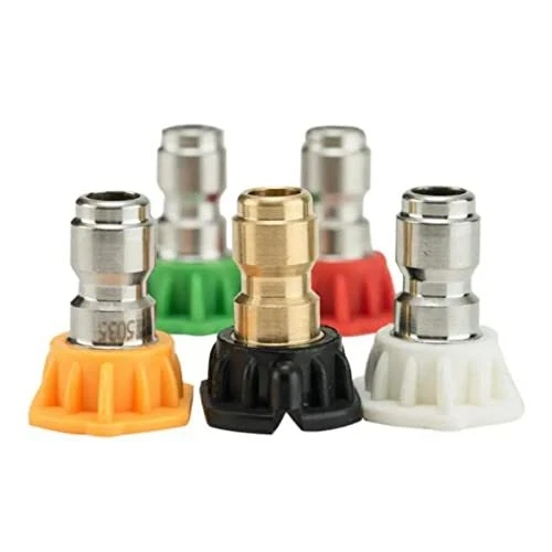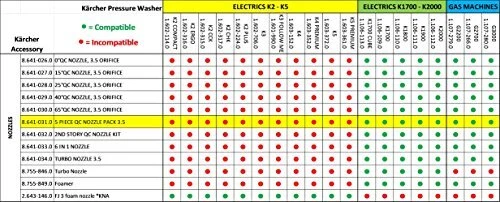 This 5 Piece Spray Nozzle Kit from Karcher includes, 0 Degree, 15 Degree, 25 Degree, 40 Degree and Soap-65 Degree Nozzle. The most common spray patterns for most pressure washers. The nozzles are color coded for easy use. Fits pressure washers to 4000 PSI and equipped with Quick Connect spray wands. Works will all residential gas pressure washers, as well as many other brands (nozzle orifice size 035 – please check your pressure washer manual for compatibility information). Complete or replace your set of spray tips with this industry-standard five piece Quick Connect nozzle set. The Karcher Promise: Cleaner. Quicker. Includes 0°, 15°, 25°, 40° and Soap Nozzles 0° - red, concentrated pencil jet. 15° - yellow, high performance. 25° - green, multi-purpose. 40° - white, sensitive surfaces. 65° - black, low pressure detergent application. Fits most gas pressure washers up to 4000 PSI rating