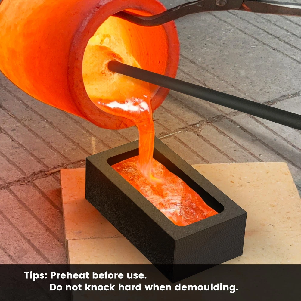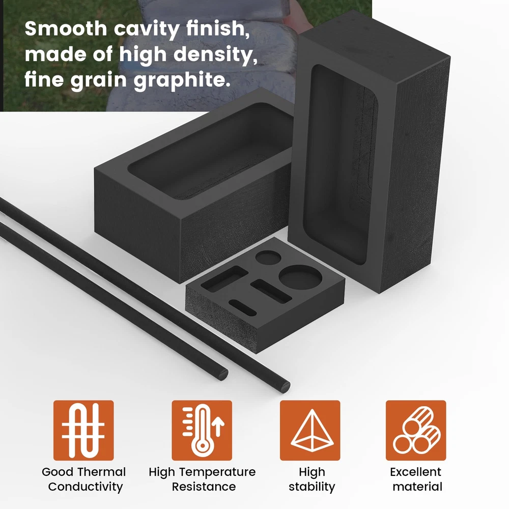Discover the perfect combination set for all your DIY metal melting, casting, and refining needs. Our 5-in-1 Graphite Casting Ingot Mold Set includes everything you need to get started. Product Composition: 5-in-1 Graphite Casting Ingot Mold: 2.83" x 2.24" x 0.47" with 3 rectangular slots and 2 round holes; 1kg Graphite Ingot Crucible Molds: Outer - 4" x 2" x 1" (100 x 50 x 25 mm), Inner - 3.5" x 1.6" x 0.8" (90 x 40 x 20 mm); Graphite Stir Rod Sticks: 12" long, 0.47" diameter Premium Graphite: Crafted from premium graphite for enhanced durability and excellent heat resistance, ensuring long-lasting performance and superior results in metal casting Versatile Usage: Perfect for experiments and smelting of non-ferrous metals such as gold, silver, copper, aluminum, and more; Ideal for use as an ingot mold, graphite crucible melting, test analysis, and other purposes Convenient Combination Set: A comprehensive 4-piece set designed to meet all your DIY needs for melting, casting, and refining metal jewelry;The set's dimensions are perfect for small-capacity metal melting projects, offering precision and efficiency Important Reminder: Please carefully check the dimensions provided in the product details before making your purchase to prevent any inconvenience caused by ordering the incorrect size Buyer : Enjoy peace of mind with our 24-hour ;If you have any questions, please get in touch with us through buyer messages for prompt assistance