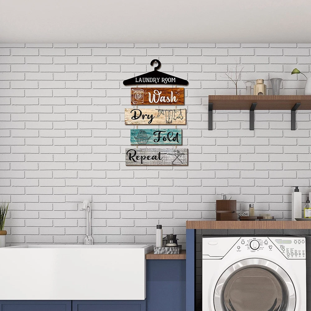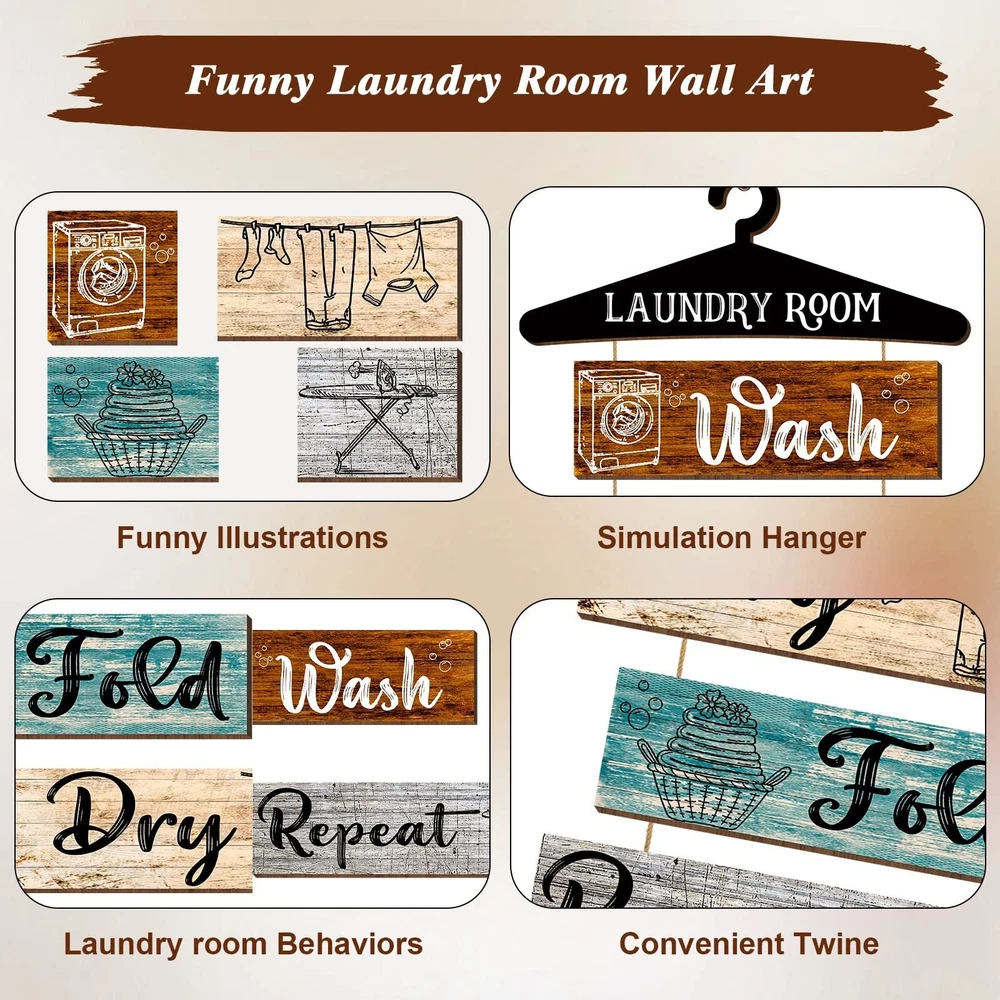 Features: Convenient to hang: These laundry wall decor signs are equipped with fixed twines on the back, which are convenient for you to hang on the wall, door and wherever you want, will not scratch the places where you hang. Funny laundry rules sign: Printed with wash dry fold repeat signs and many cute elements, these laundry room decors for wall can easily attract people's attention, moreover, they can remind people to wash clothes and tell them the right steps of washing. Also they can work as nice gifts for your friends or families. Specifications: Material: wood Color: as pictures shown Size: 30 x 11 cm/ 11.8 x 4.3 inches, 24 x 7 cm/ 9.4 x 2.7 inches, 28 x 7 cm/ 11 x 2.7 inches, 24 x 7 cm/ 9.4 x 2.7 inches, 28 x 7 cm/ 11 x 2.7 inches Package includes: 5 x Laundry wall decor sign Notice: Manual measurement, please allow slight errors on size. The color may exist slight difference due to different screen displays. Set of 5 laundry room decor: you will receive 5 pieces of laundry room wall decorations in total, which are rustic and attractive and can add a funny atmosphere for your laundry room or bedroom Rustic and interesting: these laundry room rules signs are designed with wood background, which take on rustic and farmhouse style, besides, printed with many cute elements, such as washing machine, pants and more, match well with the theme of laundry room Sturdy material: these laundry signs are made of wood, which is sturdy and not easy to break, also they are not easy to fade or deform, also they are lightweight for your decorative needs Detailed information: these laundry wall decor signs measure 30 x 11 cm/ 11.8 x 4.3 inches, 24 x 7 cm/ 9.4 x 2.7 inches, 28 x 7 cm/ 11 x 2.7 inches, 24 x 7 cm/ 9.4 x 2.7 inches, 28 x 7 cm/ 11 x 2.7 inches respectively, with fixed twines on the back, convenient for you to hang wherever you want Decorative and functional: these antique laundry room decors are suitable for bathroom, laundry room, bedroom and more, delicate and , moreover, the laundry wall decor sign can work as a friendly reminder in your daily life