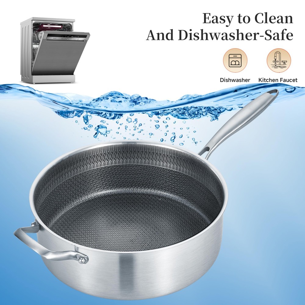 5 Quarts Hybrid Non Stick Tri-Ply Stainless Steel Sauté Pan with Lid,12 Inch Deep Frying Pan,Large Skillet,Induction Cooking Pan, Oven Safe and Detachable Handle.Ceramic Coating,PFOA & PFOS Free. Tri-Ply Clad Structure:Made with a responsive aluminum core bonded together with 2 layers of durable, stainless steel all the way around for maximum durability and fast, even heat distribution Hybrid Ceramic Coating Design:The new hybrid pattern ceramic coating forms a stunning and durable non-stick surface,Under medium heat cooking conditions, it can achieve perfect non-stick performance,we made it PFOA & PFOS Free Cool Touch Long Handle:Screw fixation detachable convenient storage stainless-steel long handle to ensure a safe grip while providing a comfortable grip and cool touch handle when cooking on the stovetop Suitable for All Stoves:Works on all cook stovetops, include induction stove. The high quality stainless steels and the aluminum core make it dishwasher-safe and oven-safe up to 500°F Your Reliable Partner:All the Cookware from is PFOA-Free,SGS Certified. Each pan and pot from heats quickly and spreads heat evenly because of our High-Control level of materials