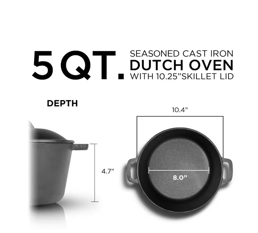 Pre-Seasoned Cast Iron Dutch Oven – 5 Qt. Capacity with Lid About This Product This 5-quart cast iron Dutch oven is a versatile and durable addition to any kitchen. Suitable for both indoor and outdoor use, it performs well over a campfire, grill, stovetop, or in the oven. The pot features integrated side handles for easy lifting and control, while the heavy-duty cast iron construction ensures excellent heat retention and even cooking. Pre-seasoned with oil for a natural, easy-release finish, this Dutch oven is ready to use right out of the box. Ideal for searing, sautéing, baking, broiling, braising, frying, and grilling, it’s built to handle a wide variety of cooking tasks. Cleanup is simple—just handwash with mild detergent, dry thoroughly, and store in a dry place. Highlights 5 Qt. capacity; dimensions: 11.1 in. x 5.3 in. x 10.75 in. Pre-seasoned cooking surface for easy food release and rust prevention Excellent heat retention and even heating Integrated handles for safe, secure lifting and storage Suitable for oven, stovetop, grill, and campfire use Great for cooking meats, stews, risottos, beans, and more Handwash only; dry thoroughly before storing Return Policy Shipping Policy FREE SHIPPING within the 48 states! We do not ship to Alaska, Hawaii, Puerto Rico, Guam, Virgin Islands. We do not ship to APO/FPO/DPO addresses and P.O. BOXES - please provide a physical address! Your order will be processed within 3-5 business days once the payment has been received. Standard shipping typically takes 3-10 business days depending on the item. We do not offer combined shipping services. Return Policy We offer a 30-Days Return Policy on items which are damaged in transit or defective products from the manufacturer. You have the option of a full refund or an exchange of the item. All returns must be in its original condition as when it was received (include all of the original accessories or items that came with it). Feedback & Contact Us Customer satisfaction is very important to us. If you have any problem with your order, please contact us and we will do our best to make you satisfied. If you have any queries, please contact us via eBay. We usually respond within 24 hours on weekdays. Thank you for shopping with us!