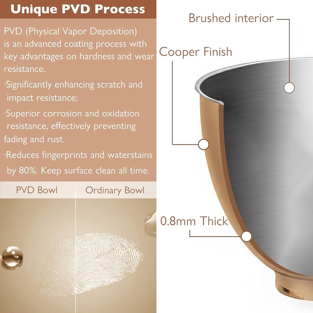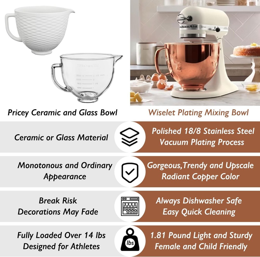 Free eBay listing template designed by dewiso.com 5 Quart Stainless Steel Mixer Bowl for Kitchenaid Classic&Artisan Tilt Head Mixer, Fit for KSM75, KSM90, KSM150, Radiant Copper, 1.75Lb, 0.8MM Thick, Heavy Duty, Dishwasher Safe, Ergonomics Handle FREE AND FAST SHIPPING! About this item ⭐【Perfect for Kitchen Aid】This colored mixing bowl compatible with Kitchen Aid Classic and Artisan Series stand mixer(not fits Artisan Mini Series). You can choose it for most of 4.5 to 5 quart stand mixer like K45SS, KSM75, KSM85, KSM90, KSM100, KSM150, KSM160. ⭐【Advanced PVD Process】 Elevate your kitchen's aesthetic with our cutting-edge PVD Vacuum Plating. This industrial-grade coating reduces visible fingerprints and water spots by up to 80%, ensuring your bowl maintains a flawless, mirror-like luster even during the messiest baking sessions. ⭐【Heavy Duty and Stability】Precision-engineered at a heavy duty 1.75 pound with an industry-leading thickened design. The extra mass and thickness provide exceptional stability, effectively dampening vibrations and keeping your mixer rock-steady while kneading heavy dough or mixing high-density ingredients. ⭐【Luxury Polished Copper Surface】Transform your stand mixer into a sophisticated kitchen centerpiece. The brilliant, polished copper-tone finish exudes timeless elegance, adding a high-end "designer" touch to your countertop that perfectly complements both modern and classic home decors. ⭐【Always Dishwasher Safe】unlike ordinary electroplated bowls, our PVD finish has passed a rigorous 400-hour dishwasher durability test. The vibrant copper color is bonded at a molecular level, ensuring it will not peel, chip, or fade over time, providing you with hassle-free maintenance. ⭐【Premium Food-Grade Material】 Crafted from high-quality, food-safe stainless steel, the interior is 100% non-reactive and resistant to rust, odors, and corrosion. It provides the exquisite look of copper on the outside with the uncompromising safety and hygiene of professional steel on the inside. ⭐【Wiselet Care】Wiselet will escort you through your baking experience. We offer every customer fast replacement. We'll solve all your problems quickly, properly and thoughtfully, making your every choice a wise one! Product We offer a 30-Day Return Policy on items which you are not completely satisfied with. You have the option for a full-refund or an exchange of the item. No returns are available on items shipped outside of the US . Shipping We offer Free Shipping to the US and ship within 2 business days of payment, usually sooner. We use UPS express shipping. That's why your products are usually delivered within 3 days . Contact We try our very best to make sure every customer is completely satisfied. If there's a problem , message us! We're happy to help. 24/7 live chat available.