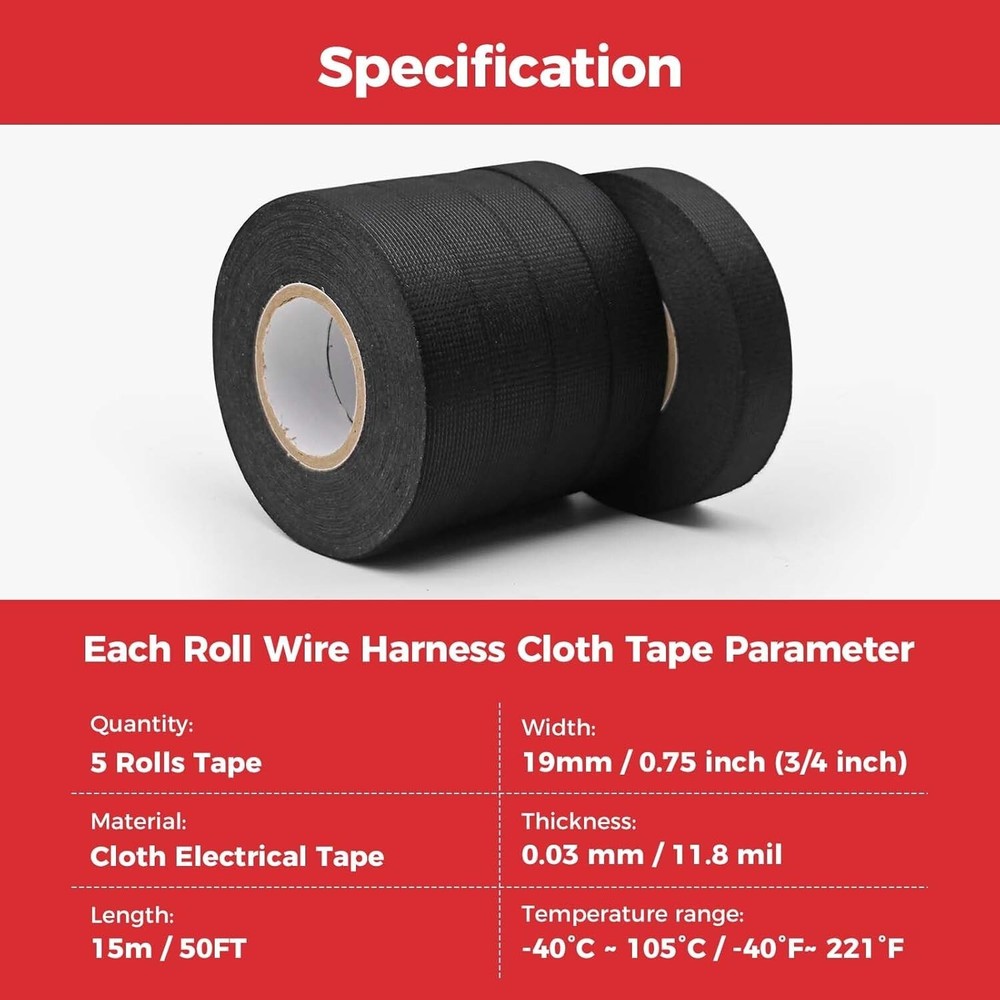 5 Rolls 3/4 Inch X 50 FT Premium Wiring Harness Tape High Temp Wire Cable Loom Color: Black Number of Items:; 1 Recommended Uses For Product:; Car, Indoor Product Dimensions: 600"L x 3.35"W x 0.75"Th The wire harness cloth tape is made of soft and corrosion-resistant material. It's suitable for use in the automobile interior for noise reduction, like for dashboard wire harnesses, main harnesses, wire joints, and wire fixing. It can also be used to organize appliance wiring and more. The wiring harness tape has high adhesive strength, good noise reduction, is hand-tearable, has heat insulation, and is wear-resistant. It's suitable for electrical automotive engine and circuit maintenance, helping achieve insulation protection. Flame retardation: extinguished naturally within 30s. Easy to Tear Just stick one end of the tape to the cable, then start pulling and wrapping the tape around the cable. You can gently tear it without needing scissors or other tools. You can decide the length of the wire cloth tape according to your needs. Professional Cloth Tape Material It's made of polyester non-woven fabric and strong acrylic pressure-sensitive adhesive. It has high viscosity, high temperature resistance (from -40°F to 221°F), good sealing, and excellent flexibility. This is a set of 5 rolls of wire harness cloth tape. Each roll of black electrical harness tape is 50 FT long and 3/4 inch wide, which can meet your different daily needs in various use scenarios. Return Policy: We offer a 30 day return policy from the receiving date. Please contact us for a Free Return Label. Please use our return label so it will go back to our supplier and we can do a refund or replacement afterwards. Feedback: Your satisfaction is very important to us! If you have any problem with your order, please contact us and we will do our very best to make you satisfied. As long as you are happy with your purchase, please leave a positive feedback for us. We will always leave you a positive feedback in return. If you have any problem with your purchase, please do not leave a negative feedback. Please Contact us ... and your issue will be solved quickly and positively We are a small family-owned business trying to make a living, not a huge company that does not care ... We will ALWAYS do our best for you!