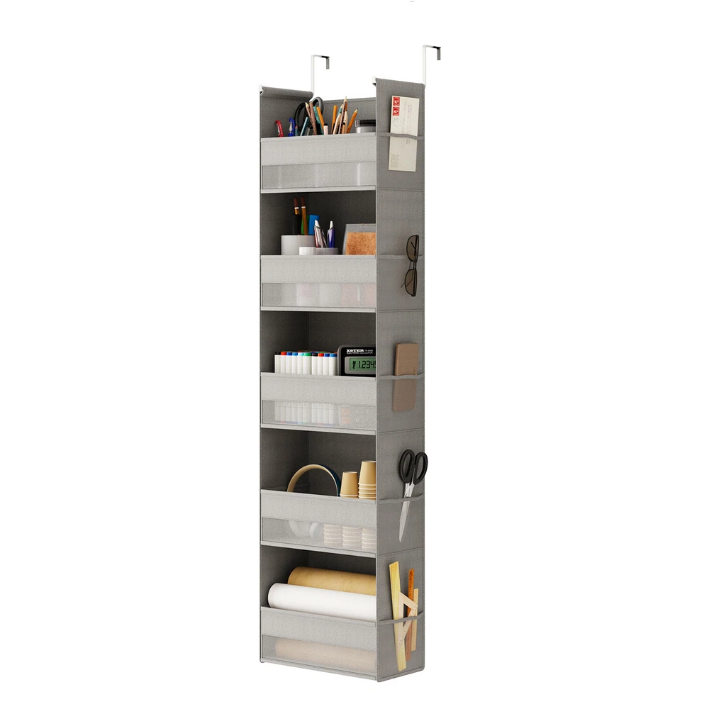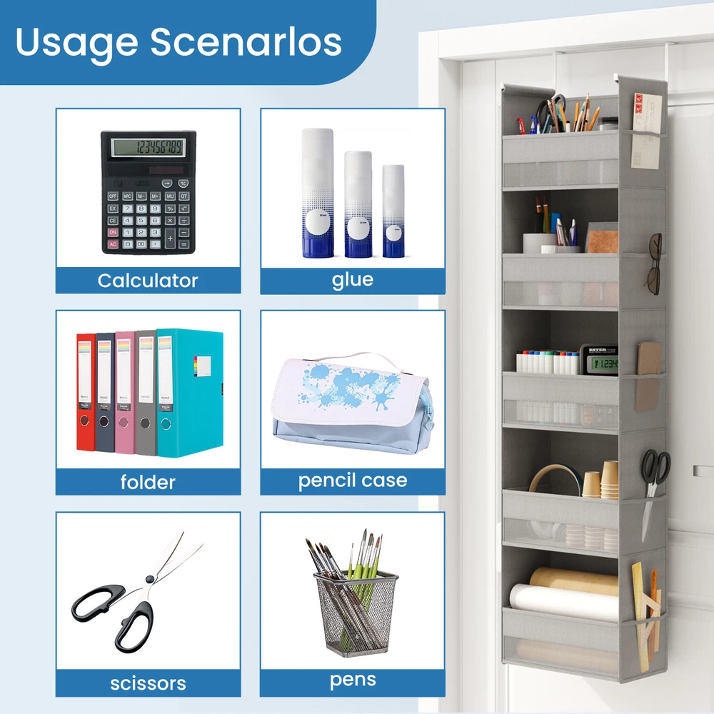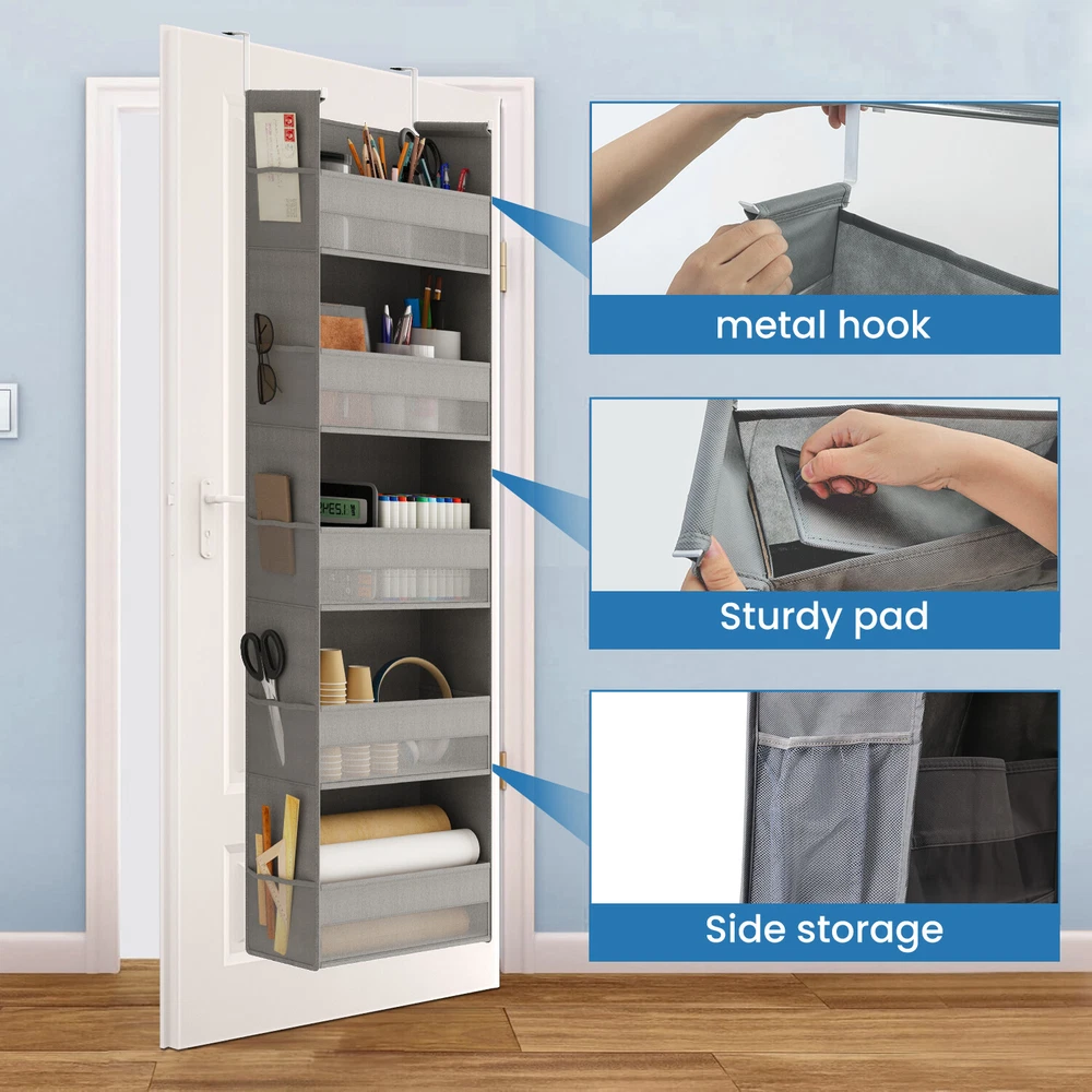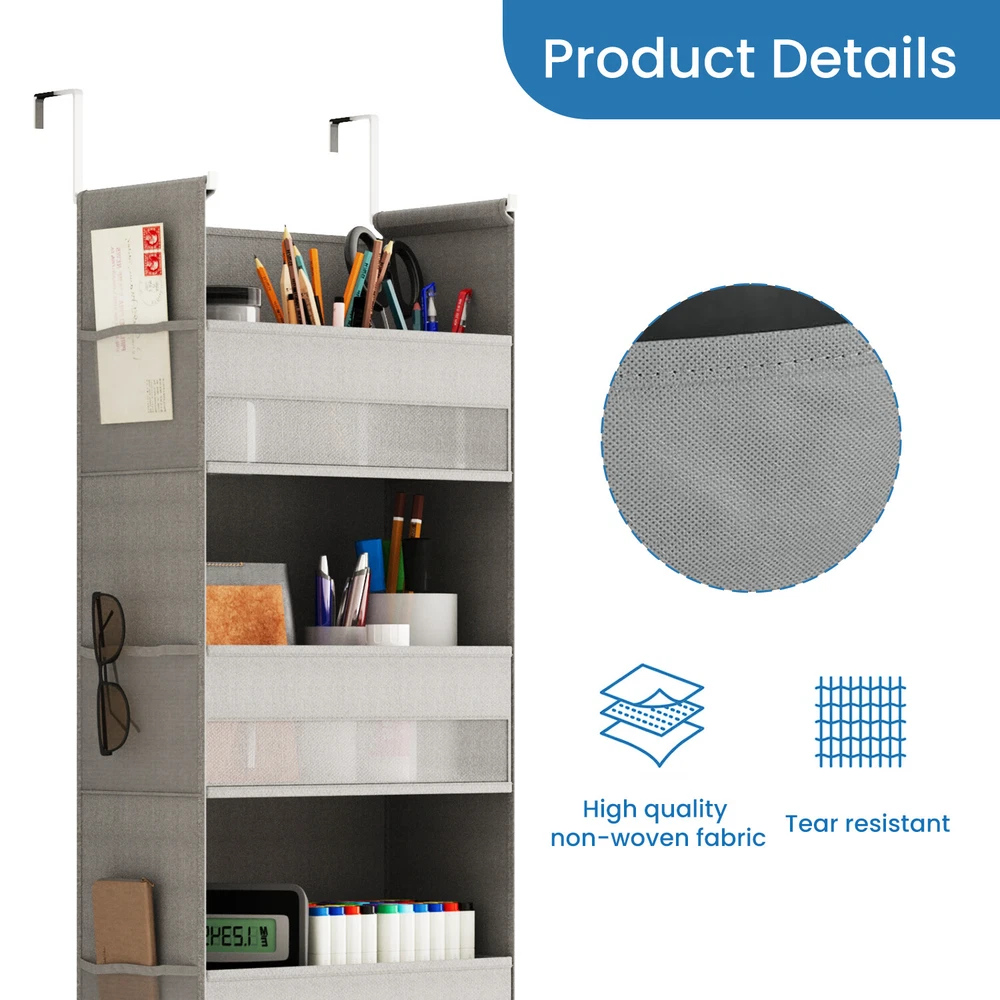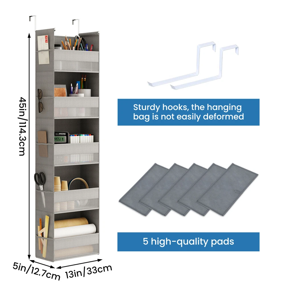 Large Capacity: This over the door organizer 5-shelf plus 10 mesh pockets would be great for cleaning your cumbersome things to free up more comfortable space for your family. high-grade & sturdy makings: Heavy Duty Fabric and thicker metal hooks, it's sturdy enough to completely fill up. The size of the product is 5"L x 13"W x 45"H. Multi-Purpose: It is a good storage for toys, purses, snacks, socks, scarves, gloves, yarn, accessories, bottles, cleaning supplies, clothes, and any other household items as you wish. Easy to Hang: We affirm that the size and the shape of this back door hanging storage are exactly what your family needs, 2 large exclusive steel hooks are adjustable better for your standard home-size doors, It supports the front bins decent not to sag or tilt forward. No More Tilting: Our over the door organizer is made of breathable non-woven fabric, which is safe for kids and family.