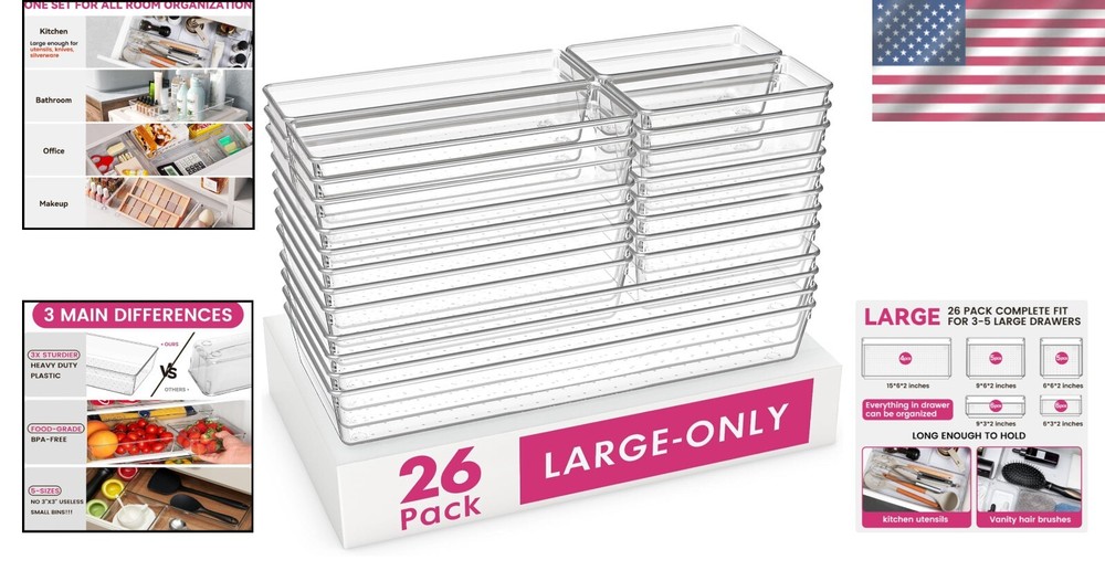 5 Size Heavy Duty Clear Storage Bins - 26 Pack for Ultimate Drawer Organization ‹ › ‹ › ‹ › ‹ › ‹ › ‹ › ‹ › ‹ › ‹ › 5 Size Heavy Duty Clear Storage Bins - 26 Pack Your ultimate solution for drawer organization awaits! This exquisite 26 pack of large-size organizers is designed to elegantly store and arrange all your essentials, whether in your kitchen, bathroom, office, or craft room. Features: LARGER SIZES: With 5 different sizes, this set includes: 4 pack large trays 15x6x2 inches 5 pack 9x6x2 inches 5 pack 6x6x2 inches 6 pack 6x3x2 inches 6 pack 9x3x2 inches FOOD-GRADE QUALITY: Crafted from premium BPA-free PET plastic, making it sturdy, resistant to cracks, and safe for food storage. Your items stay clean and organized without any unpleasant odors. MULTI-USE: Measuring just 2 inches high, these organizers expertly fit in various drawers—perfect for cosmetics, makeup tools, hair accessories, jewelry, office supplies, and much more. STACKABLE AND NON-SLIP: Designed with a wider base, these bins create additional storage space. Use the bonus silicone non-slip pads to prevent movement when opening or closing drawers. MAINTAIN TIPS: Effortlessly clean with a damp cloth to maintain their crystal clear appearance. (Please avoid dishwashers.) Benefits: Ultimate organization solution for any drawer at home or office. Durable and resistant to wear, ensuring longevity. Versatile for multiple uses across different rooms. Maximized drawer space through clever stacking and arrangement. Why choose our Heavy Duty Clear Storage Bins? Say goodbye to clutter and disarray with our Heavy Duty Clear Storage Bins. Designed to cater to your organizational needs, this set not only offers remarkable quality but also an elegant aesthetic, ensuring that your items are stored beautifully. Secure your set today and transform your space into a haven of order and elegance. Shipping Free & Fast Shipping - We offer free shipping to most of the USA with a normal delivery time of 3-7 days. However, due to the current situation, additional delivery time (up to 3 weeks) may be required for some items. Alternative Carriers - We may use alternative carriers (e.g. USPS, FedEx, UPS, etc.) to ensure your package arrives safely and on time. Due to the use of multiple carriers, we are unable to provide a tracking number automatically. Handling Time - Orders are processed and shipped within 1-2 business days of receiving cleared payment. Shipping Restrictions - Shipping to Alaska, Hawaii, Puerto Rico, Guam, and other US territories may incur shipping charges or delivery restrictions. Please contact us before ordering, or your order can be refunded/cancelled. State Restrictions - There may be restrictions based on your state of purchase. For example, certain items may not be shipped to California due to state regulations. Contact for Tracking Updates - If you require tracking updates or have any concerns about the delivery of your order, please feel free to contact us, and we will be happy to assist you. Return 30-Day Hassle-Free Returns - We want you to be completely satisfied with your purchase. If you are not, you can return the item within 30 days of receiving it for a full refund or exchange. Easy Return Process - To start a return, simply contact us and we will provide you with a prepaid return shipping label and detailed instructions. Restocking Fee - There are no restocking fees for returns. However, the buyer is responsible for return shipping costs if the return is not due to a seller's error. Refund Processing Time - Refunds will be processed within 5 business days of receiving the returned item in its original condition. Payment We accept all major credit cards, PayPal, and Apple Pay for your convenience. Your payment information is secure and encrypted to ensure a safe and seamless transaction. Please complete your payment within 3 days of purchase to avoid any delays in shipping. Feedback Your feedback is extremely important to us. We strive to provide the best products and customer service possible. If you are satisfied with your purchase, please take a moment to leave us a positive review. If you have any concerns or issues with your order, please contact us before leaving negative feedback. We are committed to resolving any problems and ensuring your satisfaction. Contact Us If you have any questions or concerns, please feel free to reach out to our customer support team. You can contact us through the eBay messaging system. We are available Monday to Friday, 9:00 am to 5:00 pm EST, and we will do our best to respond to your inquiry within 24 hours. Thank you for supporting our small family business! UPC: Not Set Unit Quantity: 26.0 count Material: Plastic,PET plastic Features: Stackable,BPA-Free,Crack Resistant,Scratchproof,Lightweight Mounting: Free Standing Theme: Not Set Brand: Unbranded Item Height: Plastic Drawer Organizer Bins Item Length: Plastic Drawer Organizer Bins Item Width: Plastic Drawer Organizer Bins Type: Drawer Box Size: Large Color: Clear Capacity: Not Set Item Weight: 6.82 pounds Number of Items in Set: Twenty-Six-Piece Item Depth: 2 in MPN: Not Set Model: Not Set Number in Pack: 26 Number of Compartments: 1 Shape: Rectangle Pattern: Not Set Style: Modern Country/Region of Manufacture: Not Set Original/Reproduction: Not Set Finish: None Unit Type: Unit Assembly Required: Not Set Personalize: Not Set