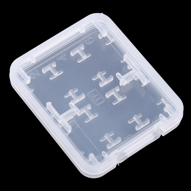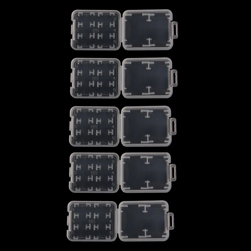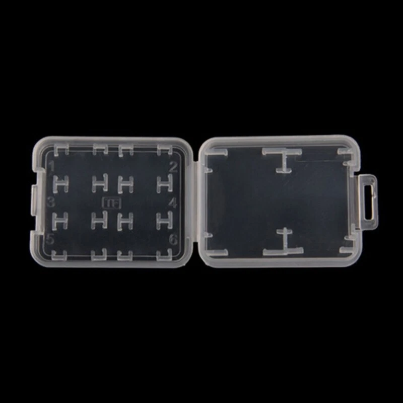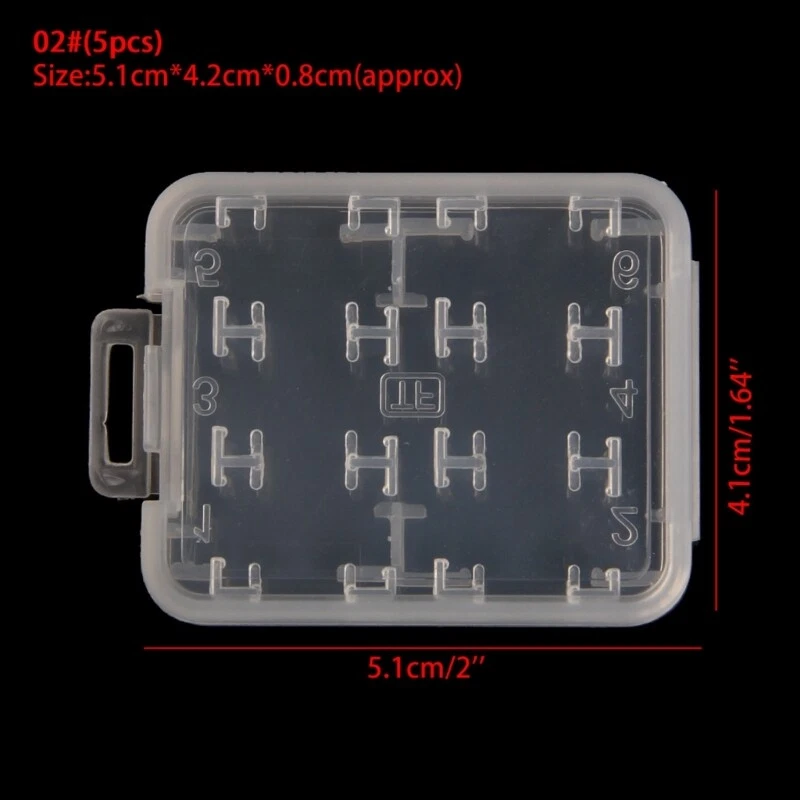 brand new and high quality 01# (10pcs):Carry Storage Box for Card Carry Storage Box for Memory Card Can be used for protecting Memory Card Anti-lost & Keep dry, convenient to store and carry Made of plastic, lightweight 02# (5pcs):8 in Plastic Memory Card Storage for Case Hard storage for case for /MS/Micro for Memory Card. This for case can hold 6pcs of Micro for Cards and memory card and for for Card. Prevent your cards from bending, extrusion damage or solarization. Durable and practical. Portable and light in weight. Size:5.1cm x 4.2cm x 0.8cm/2'' x 1.64'' x 0.31''(approx) Color:Transparent Quantity: 10pcs(01#)/5pcs(02#)(as your choose) Note: 1cm=10mm=0.39inch No retail package. Please allow 1-3mm error due to manual measurement. pls make sure you do not mind before you bid. Due to the difference between different monitors, the picture may not reflect the actual color of the item. Thank you!