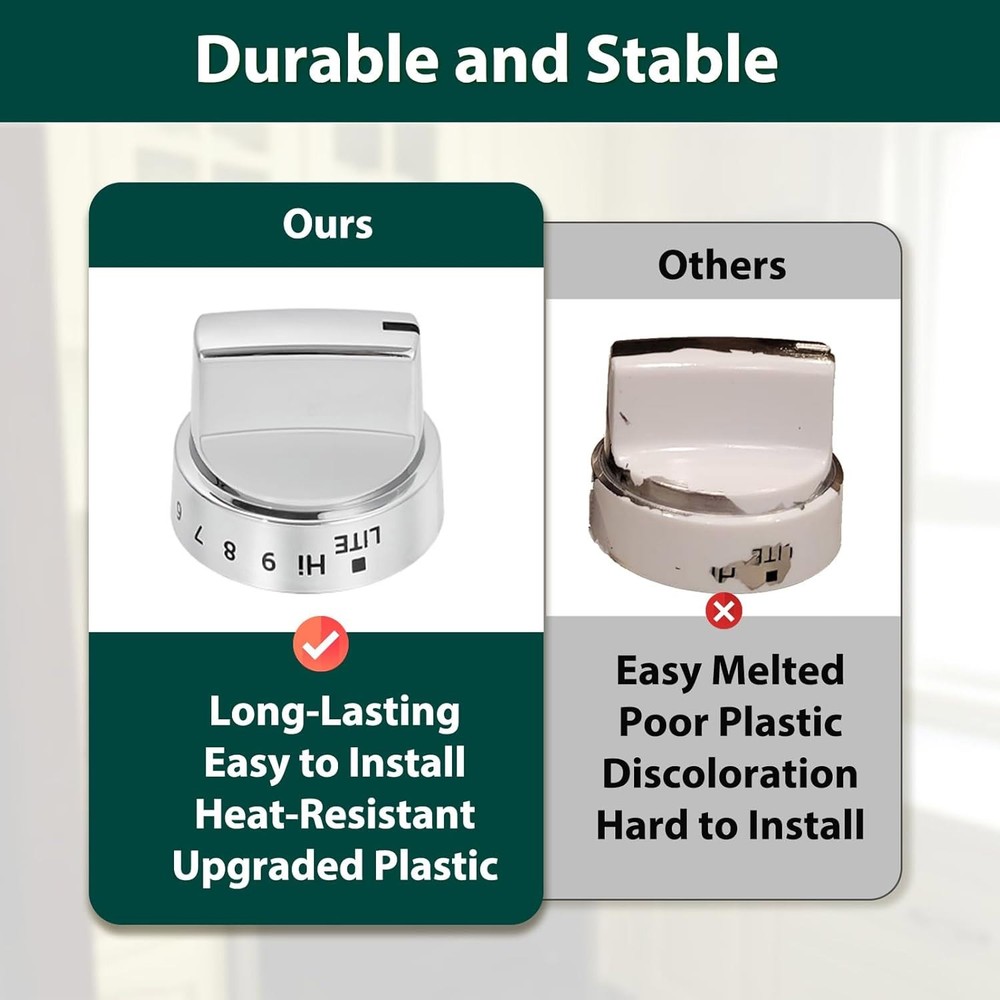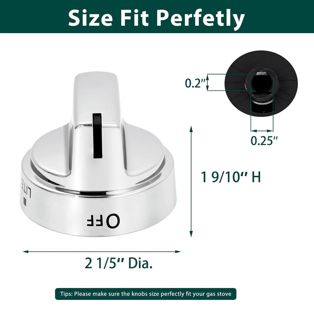 Description: Wide Application: Surface burner knob WB03X24818 lets you control the heat of the surface burner on the range. WB03X24818 Knob Replaces AP5989029, PS11729081 Compatible with ge gas stove. Applicable to the following models, not all: JGBS62REK1SS, JGBS66REK3SS, JGB860EEJ2ES, JGB860SEJ2SS, JGB860SEJ1SS, JGB720SEJ4SS, JGB720SEJ5SS, JGB645EEK2ES, JGB720EEJ4ES, JGB720EEJ2ES, etc. Check your furnace model and find out the part number of the knob that is campatible with it. Upgrade Quality: Our wb03x24818 gas stove knobs are made of highly durable materials, and the threaded mounting holes are reinforced with additional iron pieces, rigorously tested, compact & sturdy, heat resistance and wear resistance. After treatment, the surface of stainless steel has more texture and luster. Product Specification: Finish Type: Stainless Steel. Item Dimensions LxWxH: 2.25 x 2.25 x 1.9 inches. Shape: Round. This knob features bold markings for OFF, Lo, 1, 2, 3, 4, 5, 6, 7, 8, 9, Hi, and LITE. Our gas stove knobs which can help your stove look more uniform and beautiful. Easy Installation: Pull the knob directly from the column, remove it, and replace it with our knob. It is pretty easy to replace new parts on your model. Do not bend the knob up or down. If a handle is particularly stubborn, use pliers to remove it. Align the new knob holes and push them directly onto the shaft until they stop rotating. Repairing appliances by yourselves will save time and money. Please see Model Number fitment information at the bottom of this page before placing your order for this part. Package Included: 5 x Range Control Knob WB03X24818 Part Number WB03X24818 (AP5989029) replaces 4363588, PS11729081. Color: Silver On Jan 8, 2026 at 19:43:53 PST, seller added the following information: