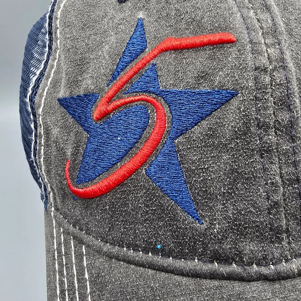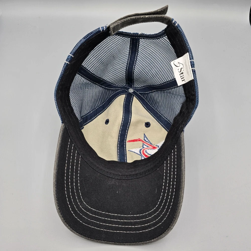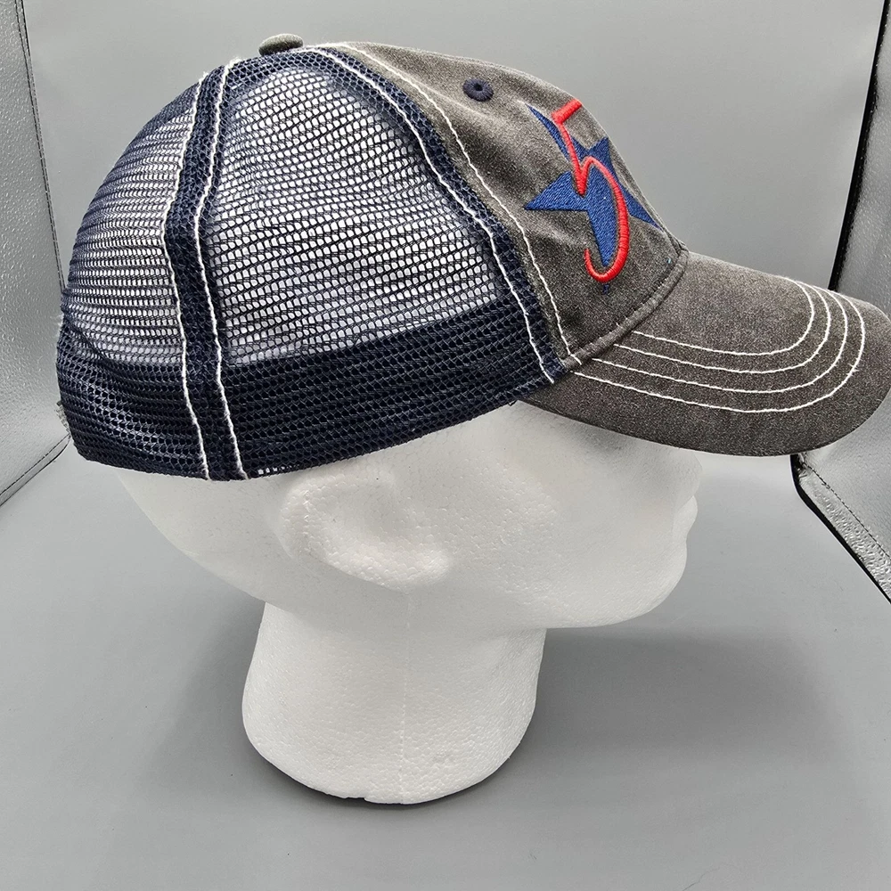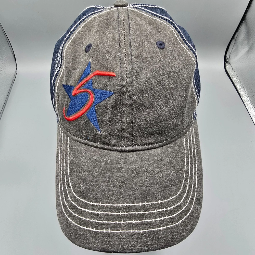 Condition Notes: Good used condition. Minor wear at hook and loop fastener. Minor wear to fabric. See photos. • Hat Brand: 5 Star • Material: Foam and Mesh • Country of Manufacture: China • Embroidered logo • Fabric Color: Gray • Mesh Color: Blue • Listed size: One Size Fits Most Returns Policy: Free Returns (60 days domestic, 30 days international). We will pay for any return shipping needed.