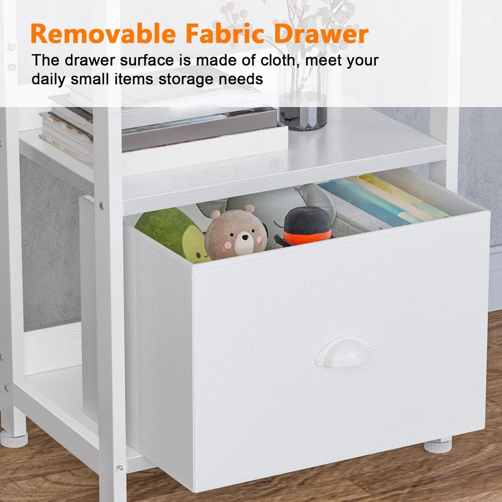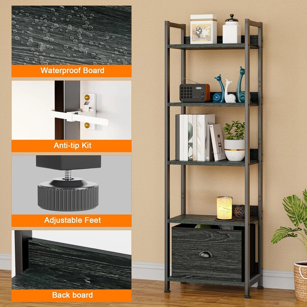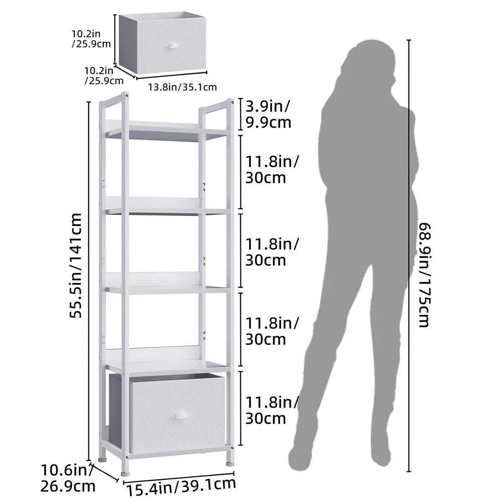 Shelf with Removable Fabric Drawer: This slender bookcase features a drawer with a fabric-covered surface, offering a light and soft touch. It can be paired with 2 to 4 tier shelves to customize your storage solution as needed. Space Efficient: This 5-shelf bookcase boasts a compact and lightweight design, taking up minimal floor space. Perfect for placing your favorite books, crafts, photo albums, and potted plants, it's a versatile storage and display option for your essentials and decorations. Multi-Purpose: The bookcase can serve multiple functions, such as a desk organizer, kitchen countertop organizer, display shelf, office bookshelf, plant stand, storage shelf, kitchen stand, and more. It's an excellent choice for decorating and organizing your living room, bedroom, home office, bathroom, kitchen, or entryway. Stable and Durable: Constructed from high-quality particleboard and a sturdy metal frame, this shelving unit includes a safety backboard, four adjustable feet, and anti-tip kits to ensure enhanced stability and durability. Each shelf can support up to 30 lbs, meeting your everyday storage needs. On Oct 26, 2024 at 01:47:10 PDT, seller added the following information: