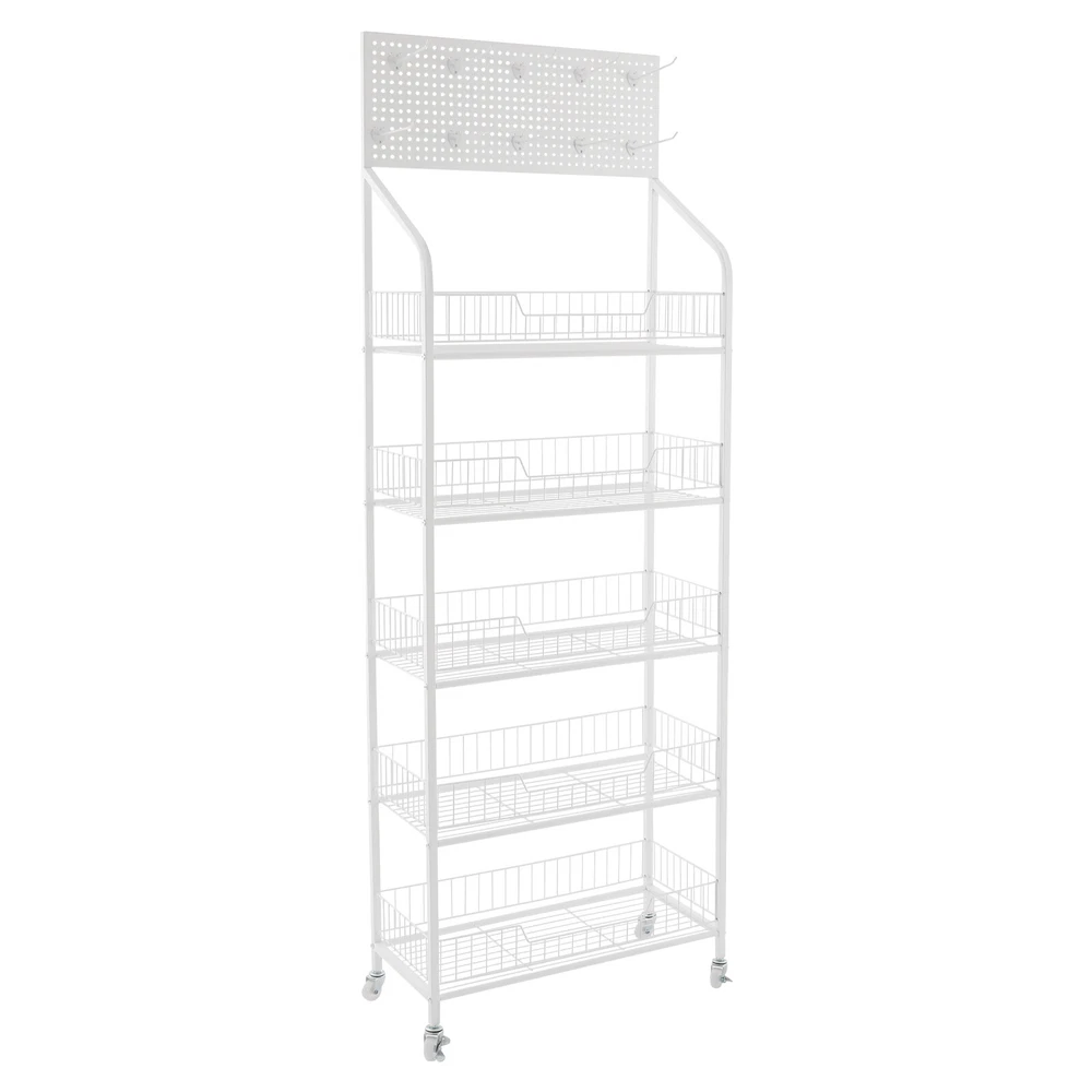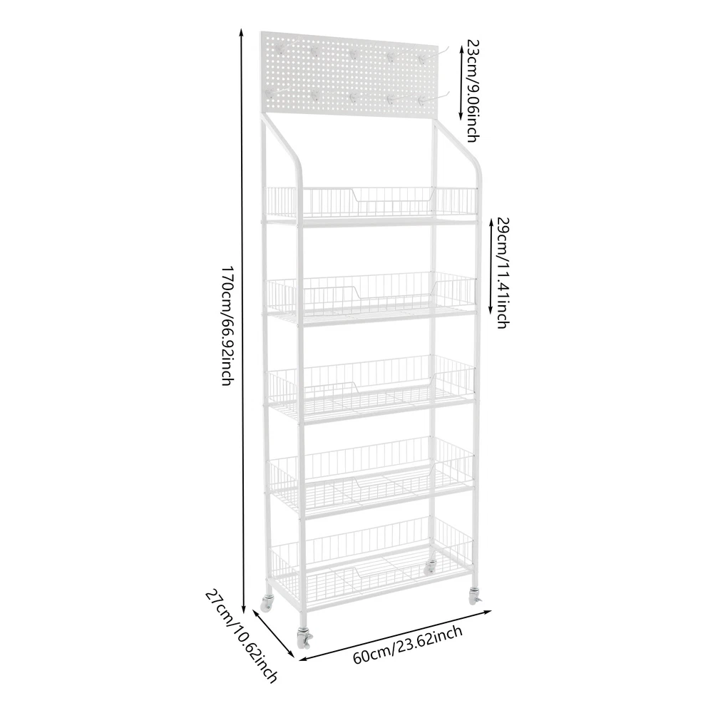 Specifications Material: Iron Process: Baking Paint Style: Modern Color: White Shape: Rectangular Mount Type: Free Standing Assembly Required: Yes Number of Tiers: 5 Number of Wheels: 4 (2 with Brakes) Each Tier Load-bearing Capacity: 20kg/44.09 lbs Each Hook Load-bearing Capacity: 1kg/ 2.2 lbs Tier Spacing: 29 cm/11.42 in Top Hole Hanging Plate Height: 23cm/9.06 in Product Size: 60*27*170 cm/23.62*10.63*66.93 in Package Size: 146*28.5*7.9 cm/57.48*11.22*3.11in Gross Weight: 9 kg/ 19.84lbs Net Weight: 8.55 kg/18.85 lbs Package Included 1* Retail Display Stand 10* Hooks 4* Universal Wheels All Accessories for Assembly 5 Tier Retail Display Cases Movable Snack Candy Display Shelf Snack Rack w/Hooks Specifications Material: Iron Process: Baking Paint Style: Modern Color: White Shape: Rectangular Mount Type: Free Standing Assembly Required: Yes Number of Tiers: 5 Number of Wheels: 4 (2 with Brakes) Each Tier Load-bearing Capacity: 20kg/44.09 lbs Each Hook Load-bearing Capacity: 1kg/ 2.2 lbs Tier Spacing: 29 cm/11.42 in Top Hole Hanging Plate Height: 23cm/9.06 in Product Size: 60*27*170 cm/23.62*10.63*66.93 in Package Size: 146*28.5*7.9 cm/57.48*11.22*3.11in Gross Weight: 9 kg/ 19.84lbs Net Weight: 8.55 kg/18.85 lbs Package Included 1* Retail Display Stand 10* Hooks 4* Universal Wheels All Accessories for Assembly Description In the retail industry, a good display can make goods stand out and attract customers' attention. Take a look at our well-designed retail display stand. It is not only rugged but also stylish. The multi-tier storage structure can meet your diverse display needs, and the hole-hanging plate at the top is a highlight. With its reasonable structural design, premium material, multi-functional applications, and convenient use experience, it has become an ideal choice for your store display. Key Features Build to Last : It is mainly made of high-class iron, with a baking paint process, which is impact-resistant, scratch-resistant, and not easy to deform, so it can be used for a long time. Stylish Appearance: The classic color scheme and smooth lines make it easy to blend into a variety of shop environments and can be paired well with most decorative styles to become a beautiful landscape. Excellent Load-bearing Capacity: The thick material, rectangular frame, and sturdy screw fixation allow each tier to hold up to 44.09 lbs and each hook to hold up to 2.2 lbs, thus providing greater stability for your supplies. Storage Assistant: The product has a total of 5 tiers, giving you enough space to put your toys, snacks, drinks, and other items, and the top of the hole hanging plate and 10 hooks also increase your storage space, which can be used to hang key chains, necklaces, bracelets, and other small ornaments. User-friendly: The spacing (tier spacing: 11.42 in) between each shelf is moderate, ensuring that the goods are neatly placed and easy for customers to browse. In addition, the hooks are removable, you can adjust the position of the hooks according to the type of goods and display needs, providing great flexibility. Space-saving: Adopting a vertical structure, this product occupies very little space (23.62*10.63 in ), which is very practical and space-saving. Easy to Move&Fix: Equipped with 4 universal wheels (2 with brakes) and handles, this product can be moved from one room to another smoothly and easily, or fixed stably in the corner. Thoughtful Design: Featuring an open wire frame design, it can effectively drain water, promote air circulation, keep your items dry, and provide convenience for you. Convenient to Assemble : The pre-drilled holes, simple structure, and complete accessories allow you to complete the assembly and start using it in a short period. Exquisite Gift : This functional and aesthetically pleasing product is an ideal gift for Christmas, birthdays, or housewarming for your friends, family, and colleagues. Simple Cleaning: With its open construction and smooth surface, you can simply wipe off surface dust with a damp rag (not included). Buy with Confidence: We stand behind all our guests and look forward to assisting you with your purchase. It is our pleasure to answer your confusion and questions. The end of the story between us is not "we sell and you buy". Details Elevated Guardrails: They allow you to better showcase your products vertically and also prevent your display items from falling off. Practical Handles: The two carrying handles on the top make it easy for you to carry the whole product. Raised Bottom: This design prevents your items from directly touching the floor and also makes it easy to sweep the floor. Smooth Edges : The smooth and round edges make it safer for you to assemble, use, and clean the product. Application It is suitable for grocery stores, supermarkets, bakeries, snack shops, movie theaters, hotels, convenience stores, cosmetics stores, stationery stores, jewelry stores, kitchens, bedrooms, laundry rooms, game rooms, offices, dormitories, and other places. It can be used to store and display fruits, drinks, vegetables, towels, toys, snacks, craft supplies, cookies, condiments, and other items. Notes Please check the size carefully before ordering. This product does not include other items. Please use within the load-bearing range of the product. Please allow the slight color difference caused by the shooting light and 1-3cm error due to manual measurement, and make sure you do not mind before you order. Payment Delivery details Terms of sales About us Contact us Payment We accept ebay payment 。 Fees such as import duties, taxes are not included in the item price or shipping costs. These charges are the buyer's responsibility. Delivery details Shipping: 2-9 working days to: USA Terms of sales We maintain high standards of excellence and strive for hundred percent customer satisfaction. Feedback is very important to us. We hope that you contact us immediately before you give neutral or negative feedback, so that we can ad