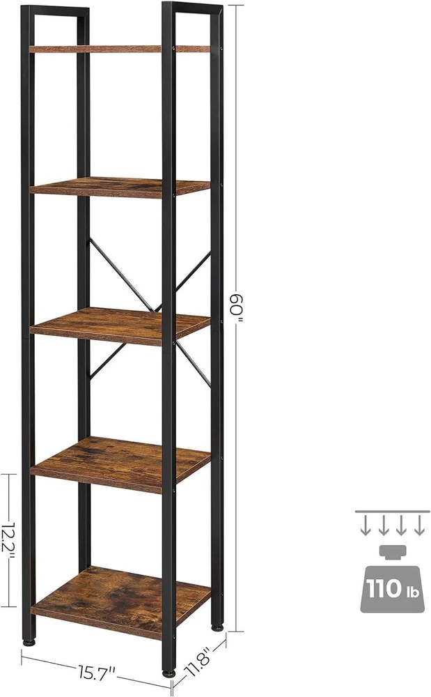 You may also like The College Cube Computer Desk Bookshelf Beech Color Durable Home Study Decor US 90.24 USD 94.99 USD Free shipping 5% off 4-Shelf Bookcase W/ 4 Doors Storage in Cherry Finish Versatile & Stylish Home US 58.15 USD 61.21 USD Free shipping 5% off Room Type Hallway Number of Shelves 5 Special Feature Durable Product Dimensions 11.8"D x 15.7"W x 60"H Style Industrial Age Range (Description) Adult Finish Type black Product Care Instructions Wipe with Dry Cloth Size 5 Tier(11.8 x 15.6 x 60.6 inches) About this item Particleboard, Steel [Fits Everywhere] With 5 open shelves, this bookshelf can display your favorite books, decorations, and plants in the living room, bedroom, bathroom, or hallway; you just need to decide which room to place it in [Long-Lasting Materials] Crafted with a robust steel frame and quality particleboard, this bookcase will hold your valuable collectibles (max. load 22 lb each tier) and last as long as they do [Stability Matters] Decorations shattered because your cat jumps on top and the rack tilts over? Relax. It won’t happen to this 5-tier shelf, as the included anti-tip kit will help you fix it to the wall for greater stability [Easy-Peasy Assembly] Why make things more complicated than they should be? With a simple structure and detailed instructions, you'll have this slim bookshelf assembled before you know it [What You’ll Receive] A 5-tier industrial storage rack from VASAGLE, a stage to display your treasured collectibles, and a great way to spruce up your room