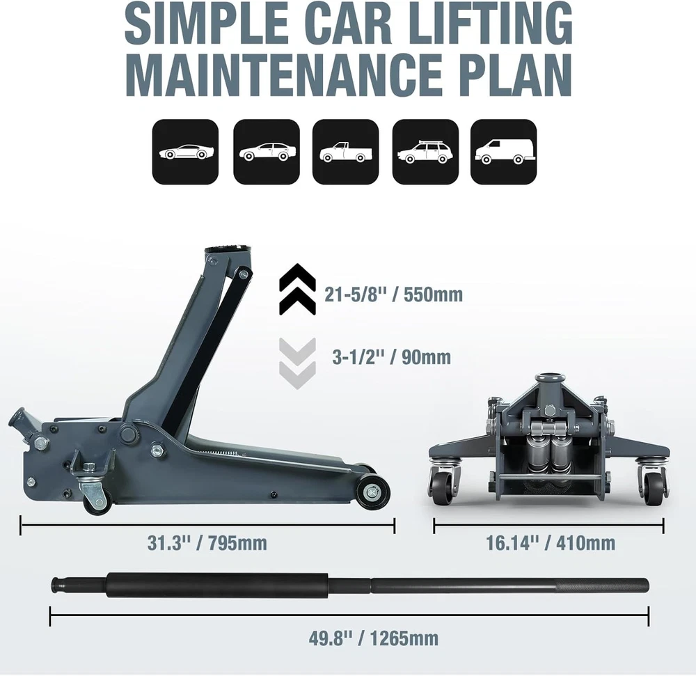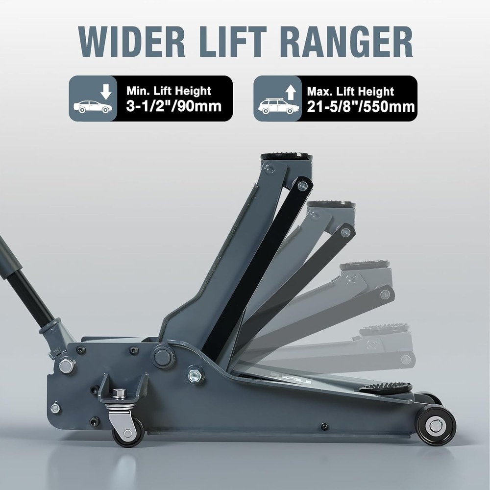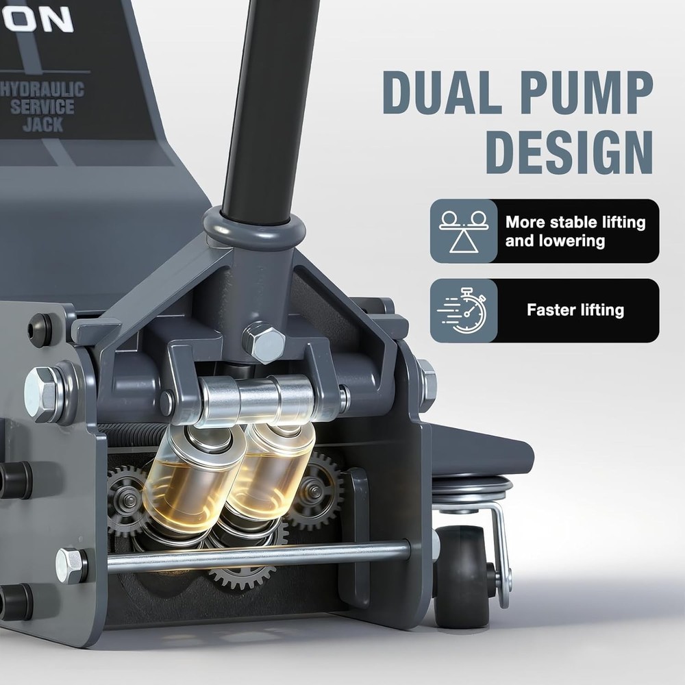5 Ton Floor Jack Hydraulic Low Profile Floor Jack with Dual Piston Quick Lift Pump, Home and Workshop Car Maintenance for Various Vehicles, 5 Ton (10,000 lbs) Capacity, Grey Product description 5-Ton (11,000 lbs) Lifting Capacity: Designed to tackle heavy-duty lifting needs effortlessly, this hydraulic floor jack boasts an impressive 5-ton (11,000 lbs) load capacity. It offers a versatile lifting range that accommodates a wide variety of vehicles, including cars, trucks, SUVs, and other large automotive models. Whether for professional garage repairs or DIY maintenance projects, it delivers safe, stable, and efficient lifting performance every time. Dual-Piston Hydraulic Quick Lift Technology: Equipped with an advanced dual-piston pump system, this floor jack revolutionizes the lifting process by minimizing the time and effort required. The innovative dual-piston design enables faster lifting speeds, drastically reducing the number of pumping strokes needed to reach the maximum height. Say goodbye to tedious, time-consuming lifting and enjoy a more efficient workflow for all your automotive tasks. Extra-Long Ergonomic Handle for Optimal Leverage: Featuring an extra-long handle, this hydraulic jack provides exceptional leverage, allowing you to lift heavy vehicles with minimal force. The ergonomically shaped grip ensures a comfortable and secure hold, reducing hand fatigue during extended use. Its thoughtful design also enables precise control and easy maneuverability, making automotive repairs and maintenance more convenient than ever. Heavy-Duty Steel Build for Long-Lasting Durability: Constructed from high-strength, industrial-grade steel, this 5-ton floor jack is built to withstand the rigors of professional use and frequent operation. The heavy-duty steel frame offers superior sturdiness and resistance to wear and tear, ensuring reliable performance even in demanding garage or workshop environments. Invest in a jack that’s designed to last, providing consistent value for years to come. Comprehensive Safety Features for Worry-Free Use: Safety is a top priority with this hydraulic floor jack. It comes equipped with a built-in safety valve that prevents overloading, safeguarding both the jack and your vehicle from potential damage. The anti-slip saddle ensures a secure grip on the vehicle’s undercarriage, preventing slippage during lifting. Additionally, the rubber padding on the saddle protects your vehicle’s finish from scratches or dents, offering peace of mind with every use. On Jan 29, 2026 at 01:42:27 PST, seller added the following information: