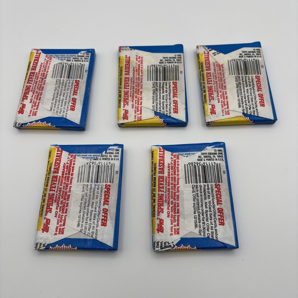 This product is a set of five unopened 1986 Topps baseball card wax packs, sealed in excellent condition. Each pack contains standard-sized trading cards featuring players from the Major League Baseball (MLB) season of 1986. Manufactured by Topps in the United States, these packs offer collectors the opportunity to find rare and collectible cards from that era. A must-have for any baseball card enthusiast looking to add some nostalgia to their collection.