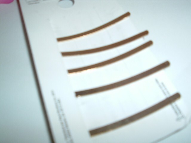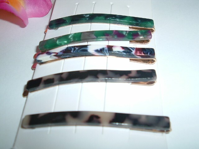 A set of 5 goldtone bobby pins, each with multi-colored marbled lucite measuring 2" long. Never worn, still on original "Bijoux" card. We combine ship.