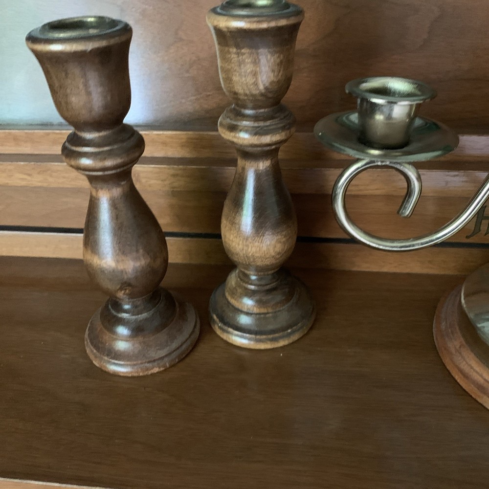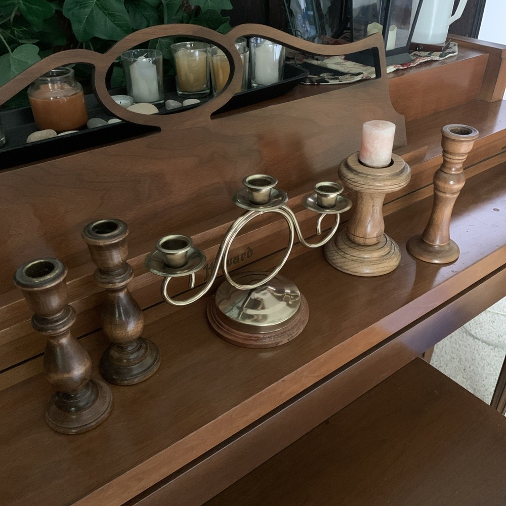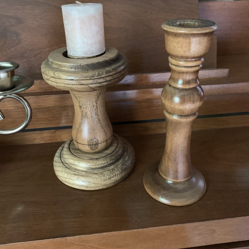 This lot of 5 wood candle holders features a vintage style with a wood grain pattern in a brown color. These natural-vibe candle holders are perfect for home decor or wedding accents. Made of wood and finished with a typical stained and varnished finish, they add a touch of cottage charm to any space. Perfect for creating a warm and inviting ambiance, these candle holders are a stylish addition to any collection of decorative candleholders.