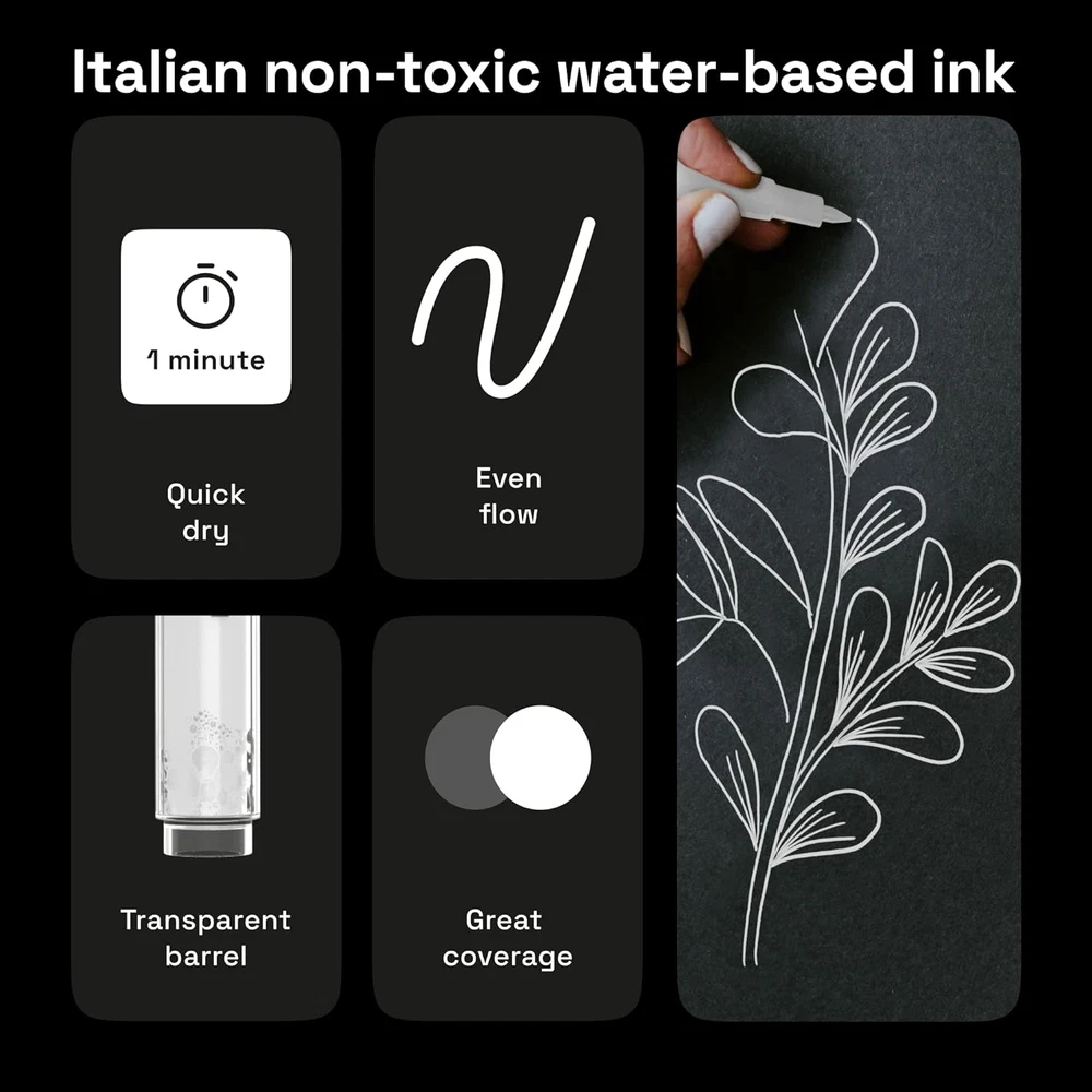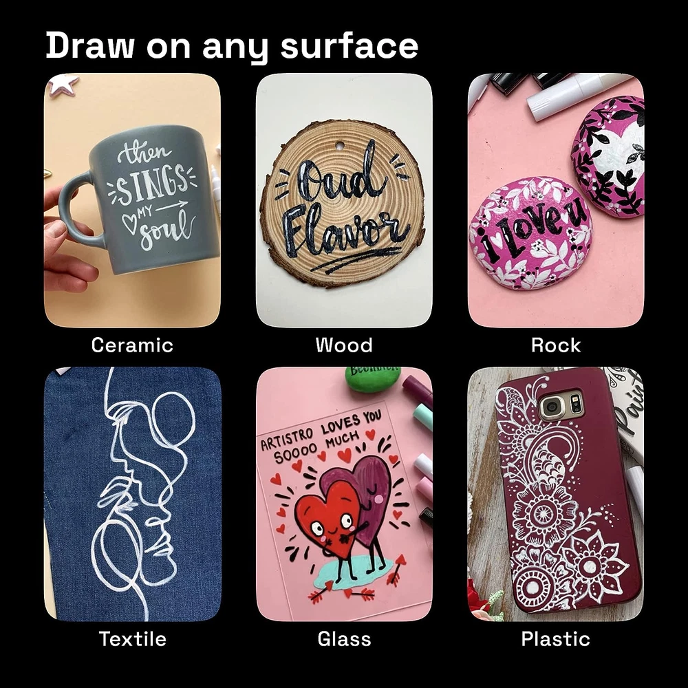 Store New Arrivals Add to Favorite View Feedback Contact Fast deliveries to the customer's home Quality customer service John Make the customers happy! 5 White Paint Pen for Rock Painting, Stone, Ceramic, Glass, Wood, Tire, Fabric, Metal, Canvas. Set of 5 Acrylic Paint White Marker Water-Based Extra-Fine Tip Description Premium Quality: Artistro white paint markers utilize vivid, acrylic ink that dries quickly to produce a very durable opaque and glossy finish on almost all surfaces. These white ink pens are equipped with Italian ink and a Japanese nib to provide the upmost quality to any professional or beginner. Any Surface: Use these white paint pens for wood, metal, or plastic. Draw with white paint for tires, terracotta, window, or vinyl. Use as a leather marking pen or as chalk markers white fine tip. The nibs are made to be solid, even on rough rocks, so the possibilities are endless! Non-toxic: Our white paint pens conform to ASTM D-4236 safety standards. Kids and adults can enjoy drawing with this white art pen. These white magic markers are ready for any project, no matter the event! Create art for Christmas, a birthday, or for wedding decorations. 0.7 mm Extra Fine Tip: Use our fine tip paint pen to highlight details in your art. The white paint pen fine tip is great for touch ups. Create masterpieces with these white pens for art. Create Vivid Art: This is the best white paint pen for DIY projects. This is a real painted by me marker. The only limit to what you can draw with this white paint pen is your imagination! Product Description 1 Surfaces 2 Benefits The video showcases the product in use. The video guides you through product setup. The video compares multiple products. The video shows the product being unpacked. Add to Cart Add to Cart Add to Cart Add to Cart Add to Cart Add to Cart Add to Cart Customer Reviews 4.3 out of 5 stars 4,231 4.6 out of 5 stars 3,498 4.6 out of 5 stars 3,498 4.7 out of 5 stars 9,324 4.6 out of 5 stars 13,408 4.5 out of 5 stars 1,133 4.6 out of 5 stars 2,686 Price $9.99 $ 9 . 99 $16.99 $ 16 . 99 $16.99 $ 16 . 99 $19.99 $ 19 . 99 $15.99 $ 15 . 99 $29.99 $ 29 . 99 $12.99 $ 12 . 99 Tip Extra-fine 0.7mm Medium 3mm Medium 3mm Brush Medium tip 3mm Fine tip 1mm Brush tip Water-based / Oil-based Water-based Water-based Water-based Water-based Water-based Water-based Water-based Acrylic ink ✔ ✔ ✔ ✘ ✔ ✔ ✔ Surface Multisurface Multisurface Multisurface Watercolor paper Multisurface Multisurface Multisurface Colors 5 white markers 12 black markers 12 white markers 48 colors 12 colors 30 colors 16 colors What types of surfaces can be these paint pens be used on? Artistro paint pens are multisurface. They can be used on rocks, glass, wood, ceramic, porcelain, metal, paper, canvas, rubber, fabric, board, epoxy resin, and more. Are they water-based or oil-based? This set of paint pens are acrylic water-based. We have oil-based markers in the Artistro collection as well. Check our store to see them. How can I properly bake glass, ceramic, or porcelain after painting? When you finish drawing, let your project air dry for 24 hours before baking. Then place it in an unheated oven, set the oven for 310–350F (155–180C), and let it go for 25 minutes. When you turn the oven off, leave your art there until it cools. How can I properly use the paint pens on fabric? After the paint has completely dried, heat set it for permanency with an iron (without steam) for 3–5 minutes. Place a cotton cloth between the iron and item of clothing. Handwash the item in cold water 3 days after applying the paint. Are Artistro paint pens vegan? Yes, these paint pens are vegan, non-toxic, and were not tested on animals. Item Weight 2 ounces Number of Items 5 Is Discontinued By Manufacturer No Product Dimensions 2 x 1 x 5 inches Country of Origin China Ink Color White Recommended Uses For Product Calligraphy, Writing, Painting Point Type Extra Fine ABOUT US We offer the best prices around on high quality products. Our E-store includes media such as books, movies, music and games while offering electronics, toys, sporting apparel, clothing, tools, general home, garden items and more. SHIPPING We are always working hard to ensure your package arrives as soon as possible. Please understand that some factors like weather, high postal traffic, and the performance of shipping companies are outside of our control. We offer free shipping to the lower 48 states and ship within 2 business days of payment, usually sooner. We do not accept P.O. Boxes. Please provide a physical address. For shipping outside of the continental USA, we only use eBay's Global Shipping Program. The item is shipped to KY and then sent to the rest of the world. International customers are responsible for all duties and taxes. Continue to 'check out' to calculate costs for shipping the item to your country. Messages regarding eBay's Global Shipping Program MUST be directed at eBay EXCLUSIVELY. RETURNS We offer a 30-Day Return Policy on items in which you are not completely satisfied with. You have the option of a full-refund or an exchange of the item. No returns are available on items shipped outside of the USA PAYMENT We accept PayPal. CONTACT US This page content is yet to come Please ad us to your favorite seller and visit again later Thank You CUSTOMER SATISFACTION We try our very best to make sure every customer is completely satisfied. If there's a problem, message us! We're happy to help. WE ACCEPT