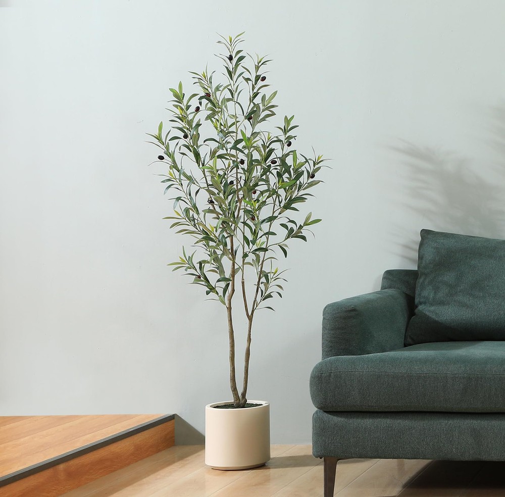 Bring nature indoors with this lifelike and realistic artificial olive tree that complements any home or office decor Easy to clean and maintain, this low-maintenance plant is perfect for busy individuals who want to enjoy the beauty of nature without the hassle of watering or pruning. The branches and trunk of artificial olive tree are expertly reinforced with a metal structure for unparalleled strength and durability.Tool-less and easy to assemble A 5 ft-tall olive tree comes with an 8.6 inch matte white planter that adds a touch of elegance to its overall design. Ideal for a variety of spaces, this artificial olive tree is perfect for your living room, bedroom, office, or any other space that needs a touch of greenery.