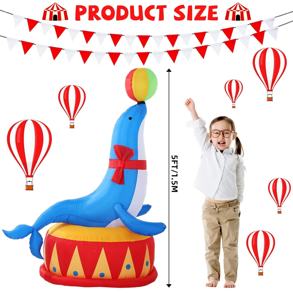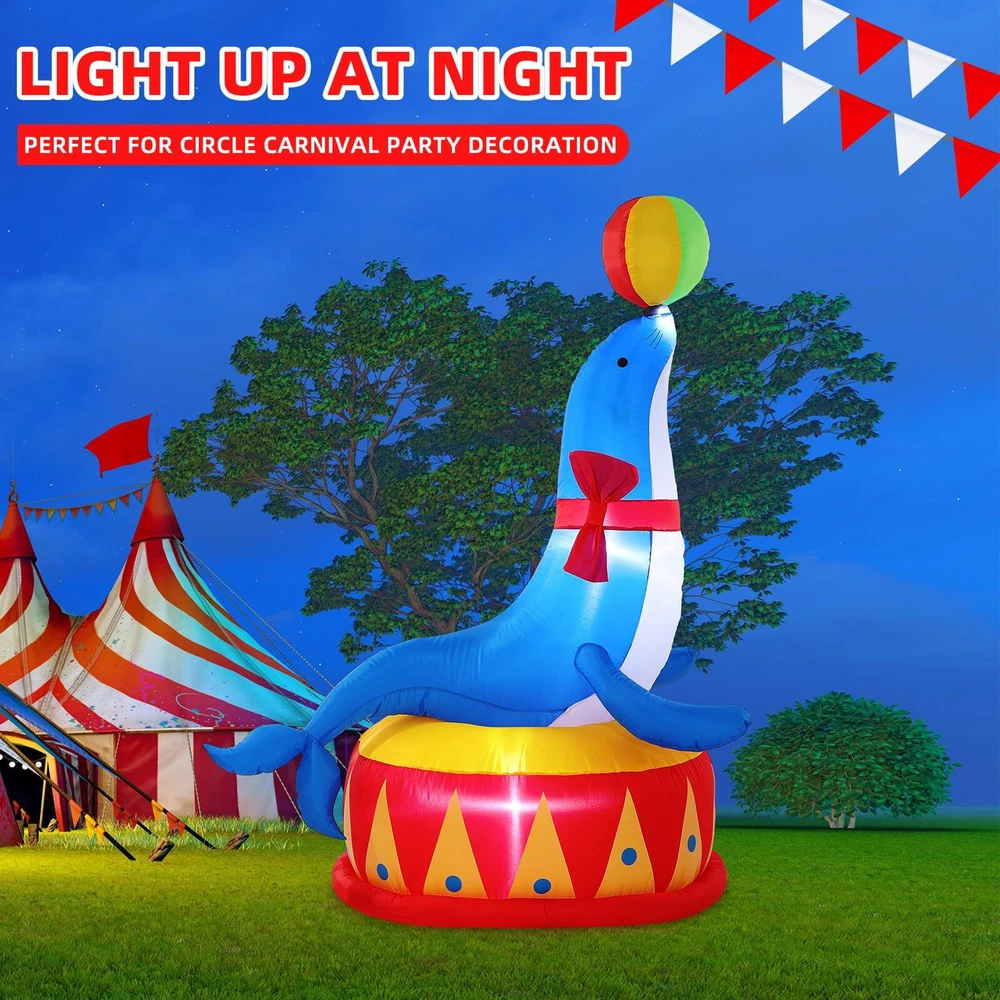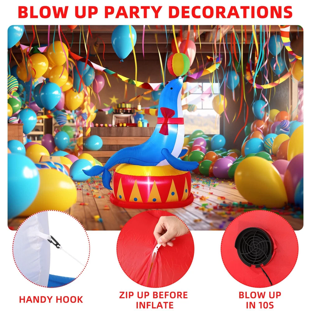 Product Description: Our 5 ft LED inflatable seal is an extraordinary addition to your party decorations. Crafted for both indoor and outdoor setups, it's ideal for any occasion, be it a circus carnival, birthday party, or a summer pool gathering. Features: Versatile Party Decor: this inflatable seal makes a delicate addition to all sorts of gatherings. Ideal for circus carnivals, pool parties, birthday celebrations, backyard summer parties, and more. LED Lighting: integrated with LED lights, this outdoor decoration captivates everyone's attention, creating a lively atmosphere regardless of day or night. Easy To Use: the inflatable seal effortlessly inflates and deflates, making it convenient to set up and store. Your party can be ready in no time with our efficient decor. Quality Material: constructed with quality material, it is designed to withstand the harshest outdoor conditions. Ensuring sustainability and long term use, it's a valuable addition to your decoration. Size: with its 5ft size, it is large enough to be noticeable but not overwhelming. It's ideal for both spacious backyards and compact indoor settings. Notes: Manual measurement, please allow slight errors on size. The color may exist a slight difference due to different screen displays. Inflatable Seal Design: 5 ft circus carnival theme inflatable seal animal with LED lights; The unique design and large size of the inflatable seal is great for adding a more festive atmosphere to your holidays and attracting your kids' or guests Indoor and Outdoor Inflatable Decoration: the blower in inflatable seal animal yard decoration has been designed to provide a strong airflow that can inflate the product within a minute while maintaining a steady airflow, ensuring your inflatable carnival decoration looks its best throughout the whole festive season Durable Material: well sewn outdoor blow up decoration is made of quality polyester that is lightweight and durable, windproof, fade resistant and waterproof with an IP44 rating; As an inflatable lawn decoration, it comes with a powerful built in fan and plug to ensure you have a wonderful birthday party or pool party experience LED Lights: bright LED lights make the inflatable seal animal decoration more attractive; Inflatable decorations with stunning LED lights will surely light up your yard or garden; It's ideal for the circus, carnival, birthday party, summer pool party, sea animal themed party, baby shower, and also for home decorations, toys, pool decorations, and gifts Safety and Stability: we provide 6 sturdy ground stakes, 4 tie down ropes, and a plug for quick and easy setup; The bottom zipper opening provides extra space for adding some weight; Further, a water bag is included, which can be filled with water and placed inside for added weight, ensuring the inflatable decoration's safety and stability during windy conditions; Please zip up the bottom opening during inflation and open it when deflating