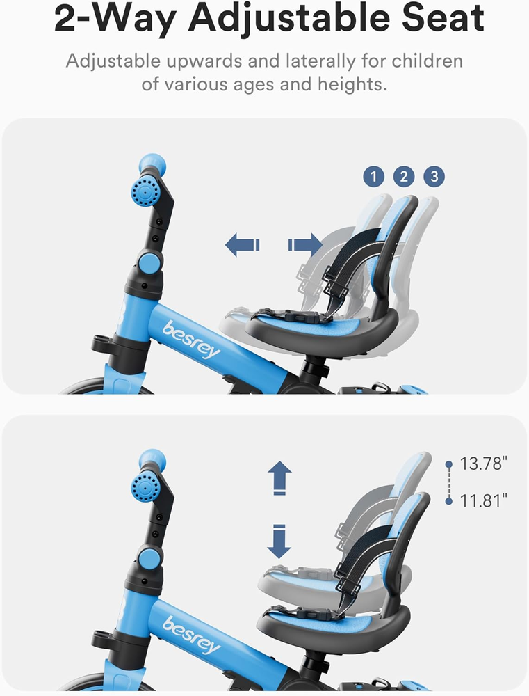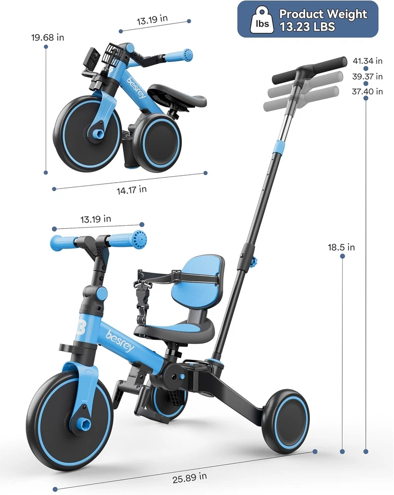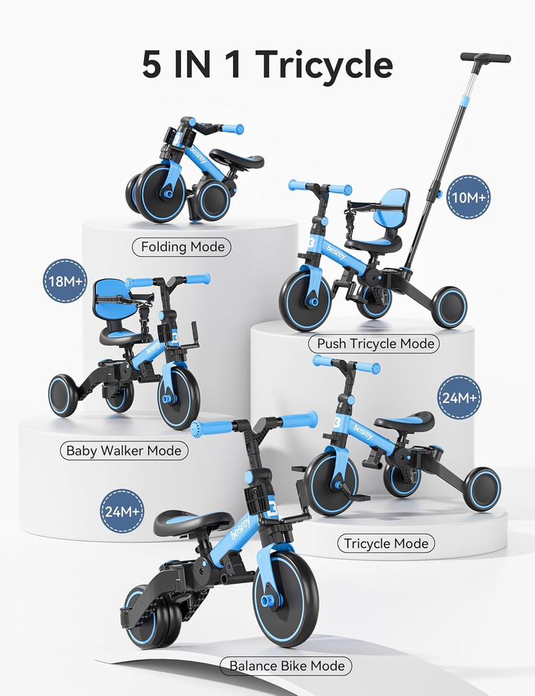 5-in-1 Modes: Easily transitions between folding, balance bike, sliding, push tricycle, and tricycle modes, accommodating every stage of your child's growth. Safety-Focused: Features a detachable backrest and three-point harness to protect against accidental falls or slips. Durable carbon steel frame and enclosed wheels for enhanced safety and long-term use. Adjustable Features: The push handle extends up to 41 inches to fit parents of all heights, while the adjustable handlebar and seat ensure a comfortable fit as your child grows. Easy Assembly: Assembles effortlessly with no complicated tools required. Clear instructions are included, making it simple for first-time users to put together quickly. Ideal Toy Choice: Perfect for boys and girls aged 1-3 years, this toddler bike provides lasting fun and support throughout their early development. Product Description Adjustable Handlebar 5 adjustable angles (45° forward/backward) provide optimal comfort during every ride. Adjustable Seat Allows this tricycle to grow with your toddler from ages 1 to 3 years. Detachable Backrest Allows for customizable seating options and added comfort. Convert Button Enjoy effortlessly switching between multiple modes with just one press of a button! Push Tricycle Mode Parent-controlled handle to guide and teach children as they learn to steer. Baby Walker Mode Provides support and mobility for your little one's first steps. Tricycle Mode First tricycle for your kids to inspire confidence and joy on initial rides. Balance Bike Mode Develops balance, steering, and coordination while increasing self-confidence. Quick & Easy Assembly Refer to the attached manual, you can easily assemble it in a few minutes. Foldable & Lightweight Designed to be portable and compact for a perfect companion to enjoy outdoors. Fold-away Design Effortlessly folded into a more compact shape to easily store in the trunk or room without taking up too much space. Have Fun with besrey Kids Tricycles. Add to Cart Add to Cart Customer Reviews 4.3 out of 5 stars 175 4.5 out of 5 stars 7,782 4.2 out of 5 stars 115 4.5 out of 5 stars 161 4.5 out of 5 stars 161 Price $71.99 $ 71 . 99 $55.99 $ 55 . 99 — — — Foldable ✔ ✘ ✔ ✔ ✔ Bearing 2 2 6 6 6 Included Tricycle&Push Handle&Belt Tricycle Tricycle&Push Handle Tricycle&Push Handle&Canopy Tricycle&Push Handle&Backrest Adjustable Seat adjustable upward&laterally Vertical adjustment Vertical adjustment front and rear adjustment front and rear adjustment Recommended Age 1-3 Years Old 1-4 Years Old 1-5 Years Old 1-3 Years Old 1-3 Years Old Height of Push Handle 41.34 Inch / 41.34 Inch 40.15 Inch 40.15 Inch