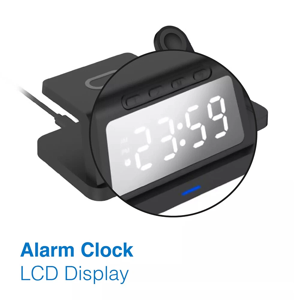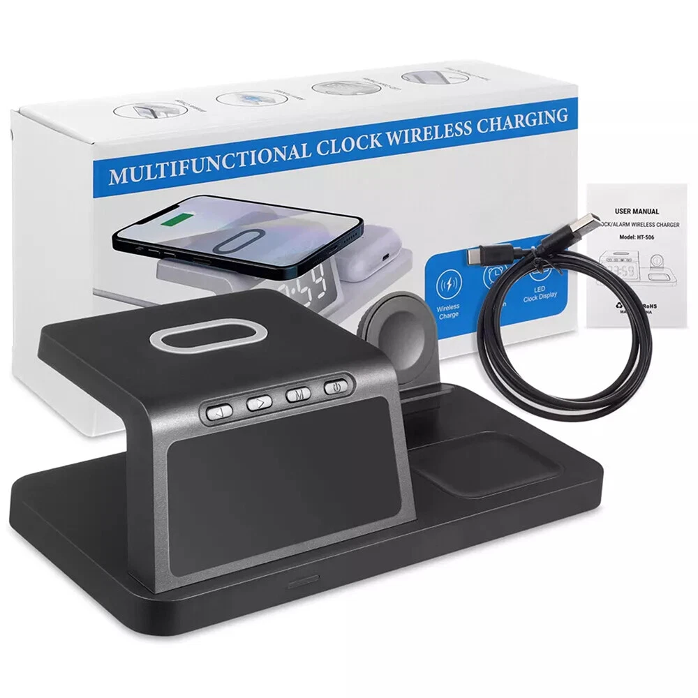 Features: [5-in-1]:The 5-in-1 wireless charger can wirelessly charge up to 3 devices, you can also connect 1 device for wired charging. It includes night light and alarm clock. LED Clock Display】:Equipped with time display and alarm clock, this charger is very useful to keep on your desk. [Widely Used]:The 5-in-1 charging cradle can be used in the bedroom, kitchen, office and anywhere you like. 5-in-1 Design】: The wireless charging station can charge your phone, Apple Watch, and headphones at the same time, leaving your desk and bedside table tidy and organized without messy cords. For better charging experience, please use QC 3.0 power adapter (QC 3.0 adapter not included). 【Safe Charging】:The cordless phone charger provides temperature control and voltage protection as well as short circuit prevention to ensure safe and stable charging. This wireless charger provides you with a safe experience. Anti-slip silicone pads on the base and bottom protect your device from scratches and slips while charging. 【Universal Compatibility】:Apple charging cradle for most Apple devices. Compatible with iWatch series 8/7/6/SE/5/4/3/2/1; Compatible with AriPods Pro/3/2/1; Compatible with iPhone series. (Not compatible with Samsung watches). Compatible with iPhone 8/X/11/12/13/14 series, Samsung S10/S20/S21/S22; Note8/10/20/21 series; other Samsung series that support wireless charging and all other cell phone brands that support wireless charging. Attention: 1.For a fast charging experience, please use a 9V-3A or 12V-2A power adapter (adapter not included). 2.The watch charger is only for Apple Watch, it can't charge Samsung Watch or other brand watches. Specifications: *Product name: 5-in-1 wireless charger *Mobile phone output: 5W/7.5W/10W/15W *Watch output: 2.5W (max) *Headphone output: 3W (max) *Charging distance: 1-8MM *Charging efficiency: ≥75% *Product Material: ABS *Product color: black Package List: 1*5-in-1 wireless charger 1*Type-C cable 1*User Manual Attention: 1.Not included not include the power adapter! 2.Item is limited to charger only, excludes headphones, watch! 3. Due to manual measurement, please allow a difference of 1 cm error! 4. may vary according to light color or monitor tint! On Dec 4, 2024 at 23:13:55 PST, seller added the following information: