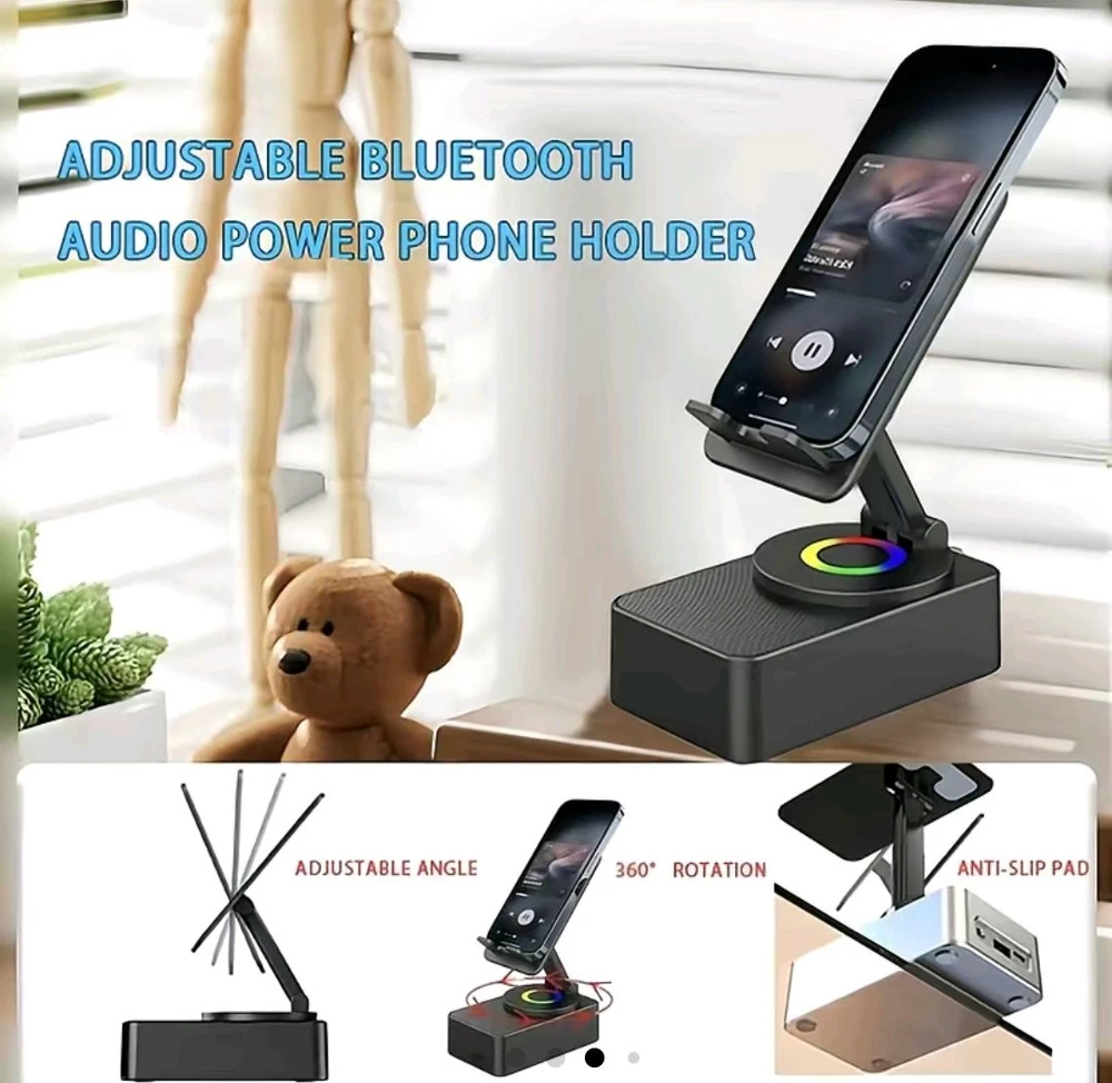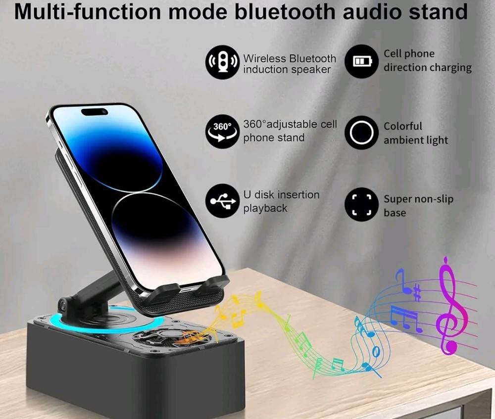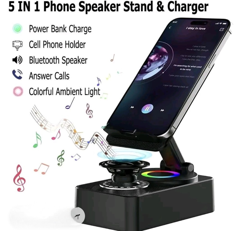El soporte para teléfono con altavoz Bluetooth de audio de inducción inalámbrico 5 en 1 es un sistema de altavoces portátil versátil con un soporte plegable de 300 °. Cuenta con conectividad Bluetooth y entradas de audio, con una potente salida de potencia de 30W RMS para un sonido de alta calidad. El elegante diseño negro y el diseño plegable compacto hacen que sea fácil de usar sobre la marcha. Este altavoz destaca por su compatibilidad universal y características innovadoras, ofreciendo una solución conveniente y elegante para disfrutar de la música y recibir llamadas en movimiento.