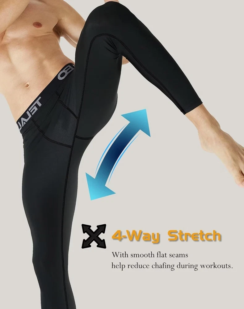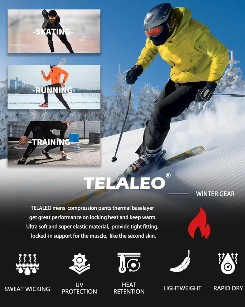 85% Polyester, 15% Spandex Imported [Ultra Soft & Warm]-The micro fleece inside helps to keep the body warm against the cold weather, multi-layer material blocks out the cold while preventing heat loss [Stretchy compression & Durable ]-These thermal compression pants for men have superior elasticity and durability, four-way stretch, slim cutted design like a second skin [Moisture Wicking and No Odors]- Men's thermal base layer are made of wicking fabric, which features quick-dry and does not roll up. Both at home and at work, these thermal tight leggings will keep you dry and odor-free [Multi-Versatile] - Thermal pants are suitable for indoor and outdoor activities such as running, fitness, cycling, snowboarding, basketball, football, baseball, hiking, hunting, weight training, skiing [Easy Care]-Machine Washable, no shrinking issue after washings, with great durability. DON'T Bleach! DON'T Iron! Tumble dry LOW! Product Description Thermal Material Fleece lined inner, ultra soft and lock the heat in, keep warm the whole day Breathable Fabrics Quick drying and breathable, moisture wicking and no odor Flatlock Stitching Increase durability and prevent chafing. Professional Winter Sports Gear Suiuable for various indoor and outdoor activities Keep body temperature in balance while exercising four-way stretch has superior elasticity and durability, keep dry and no odor Men's Thermal Compression Pants TELALEO men' thermal compression pants are made of special micro fleece material and made of high quality fabric Our winter compression pants for men are designed to regulate body temperature and insulation