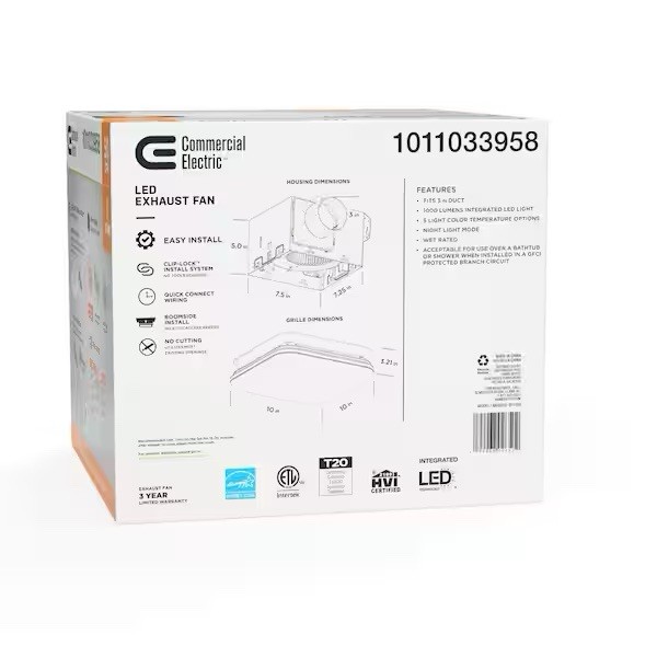 About This Product This Commercial Electric ultra quiet bathroom exhaust fan features a square design. This ventilation fan is quiet at 1.0 Sone, ENERGY STAR qualified 50 CFM fan, making it perfect for your small room areas. Ease of installation with the room side design for spaces with no attic access and quick template for drywall applications. Features a patented unique clip lock installation system attaching the bath fan securely to your ceiling dry wall. This bathroom exhaust fan is compatible with most dimmer switches and is equipped with a unique color temperature (CCT) changing technology. Now you can select your color temperature depending on your needs or preferences with the flip of a switch located on the back of the bath fan. Test different color temperatures before installation and never be dissatisfied with CCT again. The color temperature ranges from Warm White (2700K) to Daylight (5000K), with 3 options in between: Soft White (3000K), Neutral White (3500K) and Bright White (4000K) plus night light (2200K). 50 CFM, powerful ventilation to remove moisture in small spaces (up to 50 sq. ft.) 1.0 sones for quiet operating performance 10 in. square bath fan with 3 in. duct size and 7.5 in. housing High-performance LEDs produce 1,500 lumens with main light, 100 lumens night light controlled by wall switch 5-color temperatures available to select your preferred one: 2700K / 3000K / 3500K / 4000K / 5000K Built-in energy-efficient DC motor engineered to save more energy 3-year limited manufacturer warranty Input-voltage 120-Volt Ideal for managing odors and moisture removal in small rooms Damp location rated suitable for high humidity environments Click here for more information on Electronic Recycling Programs Return Policy Product Information Internet # 329101556 Model # BF1103 Store SKU # 1011033958