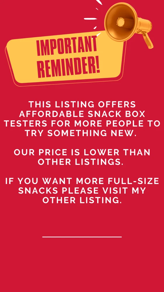 PLEASE READ BEFORE YOU PURCHASE Contains rotates weekly, pic is always for references only We change contains often to bring freshness for our customers! 🧡💛Free shipping across the USA with extra pieces included in every package. Over 3 years of experience selling on other platforms!🧡💛 🎊Explore a World of Snacks🎊 Delightful assortment of Asian treats that may include chocolates, cookies, chips, crackers, traditional Asian desserts, breads, and exotic candies. ✨Why Us? We offer the broadest selection on the platform due to regular trips to Asia. We shop three times a week to maintain freshness, ensuring our snacks rotate quickly. Each bag provides a unique mix for a varied experience, and of course, ALWAYS getting more pieces than what you bought ! 📌Important Details:📌 ❗ Manufacturing Dates: Some products may display manufacturing dates for freshness. ❗ Illustrative Purposes: Images shown are for illustration only. Actual products may vary due to our rotating stock. ❗Variety: Photos are examples of what may be included as some snacks in our rotation may change. ❗Size Variation: Please note that snack sizes vary. While some snacks are small yet premium (like many Japanese snacks), others may be larger. We focus on flavor and quality over size. ❗You will get a mix of sweet & savory snacks/ candies, if you have preference, please contact me! Also please note there will be repeat items. ❗❗You will receive snack samplers individually packed for freshness, not full packages of snacks. Our selection prioritizes flavor and quality over size. If you prefer large, budget-friendly snacks, we suggest exploring alternatives like cotton candy. 🎈🎇🎈🎇Seller's Note🎈🎇🎈🎇 Please respect diverse cultural foods; personal taste varies widely. Let's appreciate cultural diversity and understand that taste is subjective. Please avoid low ratings based solely on personal preference. My goal is to offer affordable opportunities for everyone to explore different cultures and foods. Again, please DO NOT purchase if you have low tolerance of different flavors and having trouble being respect to other cultures. No food is "nasty", people grew up and live with these foods, so please behave like a cultured and educated person, you don't like it doesn't mean it is nasty, other people like it. 🛑Shipping Disclaimer🛑 Please note that while we label all packages as fragile and hand-pick each item for quality, occasional mishandling by shipping carriers may result in damaged or open snacks. If you encounter any issues, please contact your local postal service for assistance. Feel free to reach out to us directly as well, and we'll work to find a solution for you CLICK ME FOR MORE BUNDLES Disclaimer Product packaging, specifications, and prices are subject to change without notice. All information about the products is provided for information purposes only. Please always read labels, warnings, and directions provided with the product before use. Shipping We will ship all orders within 2 business days of payment, we provide free upgrade USPS shipping service up to 2-DAY Priority if Urgent Contact We can be contacted at any time through eBay messages if you have any questions, comments or product requests. We will respond to you within 24 hours and do our best to help you out! Further details CONTAINS MILK, SOY, WHEAT, CASHEW. MAY CONTAIN TRACES OF EGG, PEANUT, ALMOND. PLEASE DO NOT PURCHASE IF YOU HAVE ANY FOOD ALLERGY
