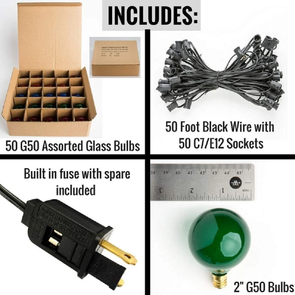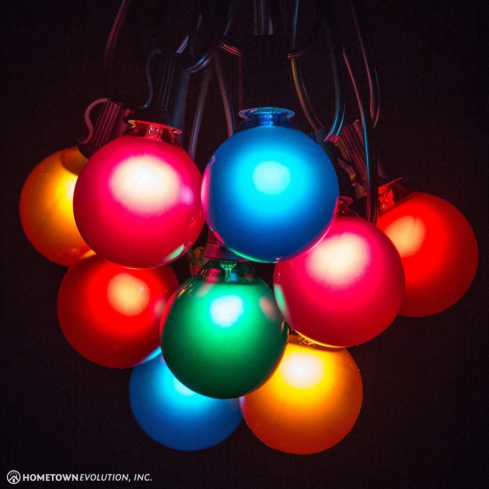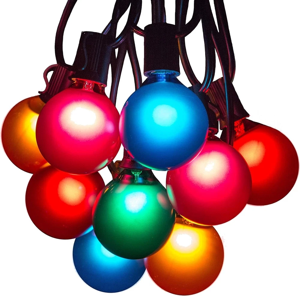 50 Foot Outdoor Colored String Lights - G50 Assorted Satin Pearl 2 Inch Globe Bulbs - Black Wire + 2 Free Spares for Patio Backyard Deck Tree and Party Lighting This G50 outdoor patio string lights set includes one 50 ft Black light string and 52 Assorted Satin Pearl glass light bulbs. The outdoor black light string has C7 E12 sockets spaced every 12". The length from the plug to the first light bulb is 6". Our colorful G50 assorted globe light bulbs are 7 watts each and 2" tall by 2" wide. The ASSORTED SATIN color mix includes Red, Orange, Green, Blue, and Pink. Manufactured with UL listed heavy duty 18-gauge SPT-1W wire and rated for up to 959 watts (8 amps)-commercial quality durable light string. Long-life dimmable bulbs last for 3,000 hours. They feature a high-quality nickel base and use 130 volts. These waterproof plug-in lights are for indoor and outdoor use -round. If one bulb burns out, the rest will stay lit. This 50 ft set is connectable. You can plug up to 2 sets end to end or combine them with one of our shorter string light use -round. If one bulb burns out, the rest will stay lit. Using G50 7-watt bulbs, you can connect up to 125 feet for long outdoor string lights! Perfect colorful lighting for your home, patio, party, backyard, trees, celebration, or even a Christmas tree! We want to make sure you are 100% satisfied with your purchase. is an American business. We strive for excellent customer service provided by real people. Please get in touch with us if you have any questions or concerns.