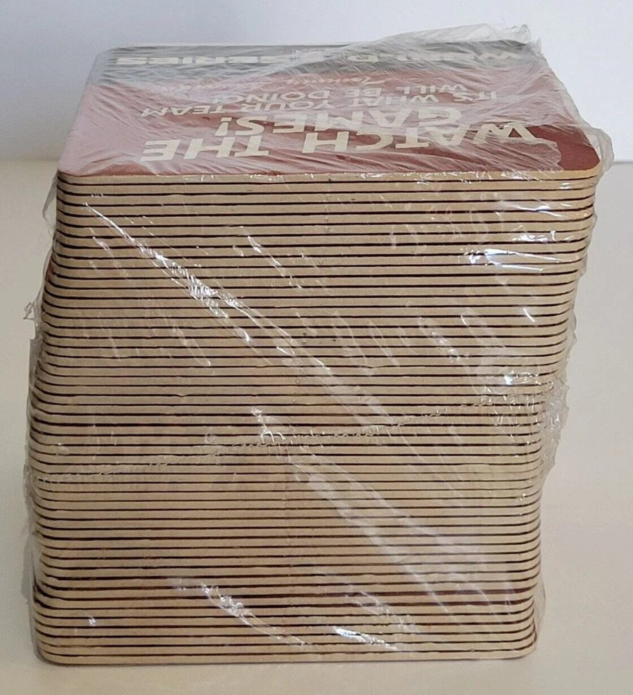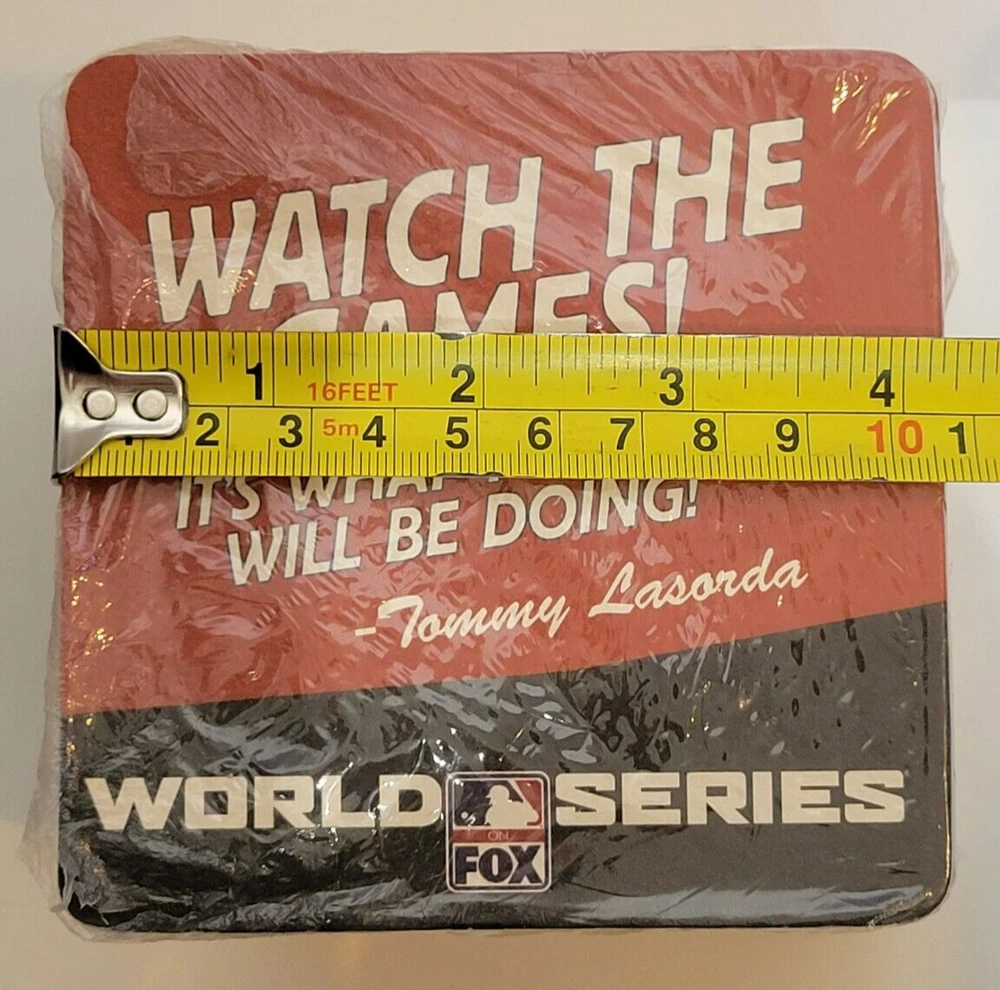 50 Fox World Series Cardboard Coasters NEW Tommy Lasorda Baseball MLB. There are some tears in the plastic (see pics). Coasters measure approximately 4 1/4" x 4 1/4". Double sided. Pack contains 50 coasters. Please see all photos for further condition details as they are also part of the description. Sold as is.