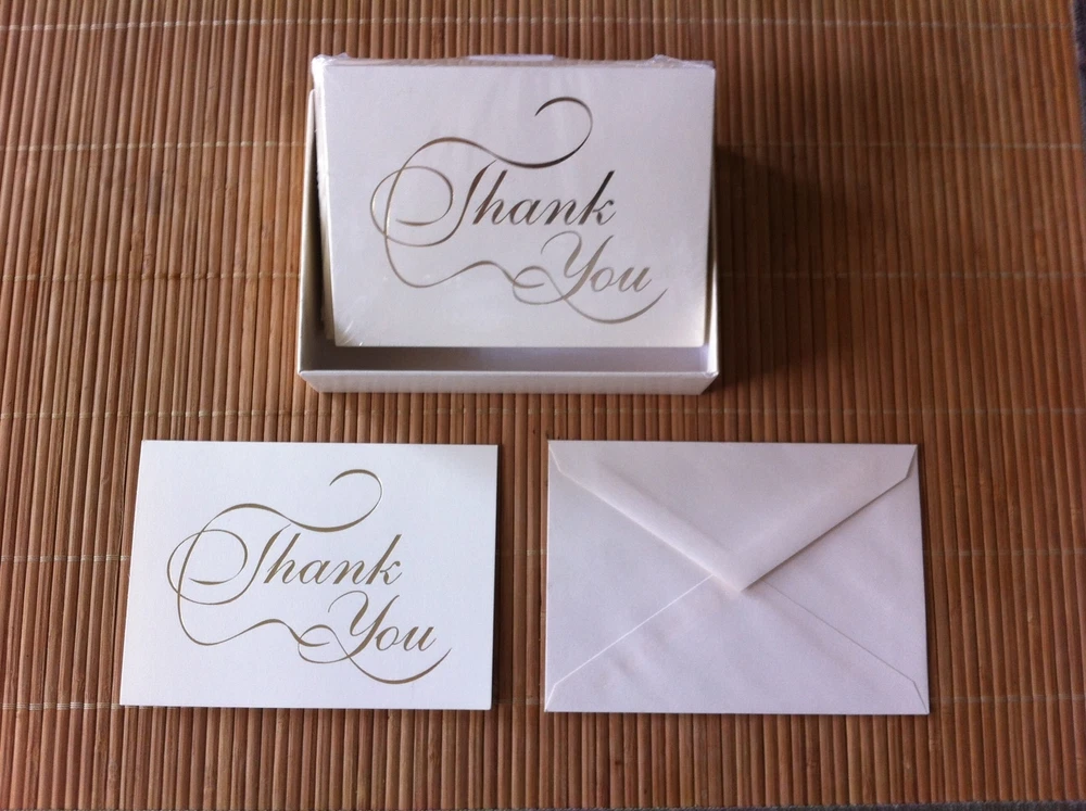 2 BOXES OF 25 CARDS EACH (50 TOTAL) WITH MATCHING ENVELOPES (50 TOTAL) CREAM / IVORY COLOR WITH METALLIC GOLD IMPRINTED “THANK YOU” ON FRONT – BLANK INSIDE HIGH QUALITY CARD STOCK CARD MEASURES 4-7/8” X 3-1/2” FOLDED (4-7/8” X 7” OPEN) NEW IN ORIGINAL MANUFACTURES CELLO WRAP SMALLER / LARGER QUANTITIES AVAILABLE - PLEASE E-MAIL FOR PRICING ********************************************************************************************** PLEASE NOTE: ALL ITEMS ARE SOLD "AS IS" AND ARE NOT RETURNABLE WE DO OUR BEST TO ACCURATELY DESCRIBE OUR ITEMS, SO PLEASE READ THE ENTIRE DETAILED DESCRIPTION CAREFULLY ALSO PLEASE EXAM ALL PHOTOS CLOSELY; (A PICTURE IS WORTH A THOUSAND WORDS) ALL PHOTOS ARE OF THE ACTUAL ITEM LISTED; WE DO NOT USE STOCK PHOTOS