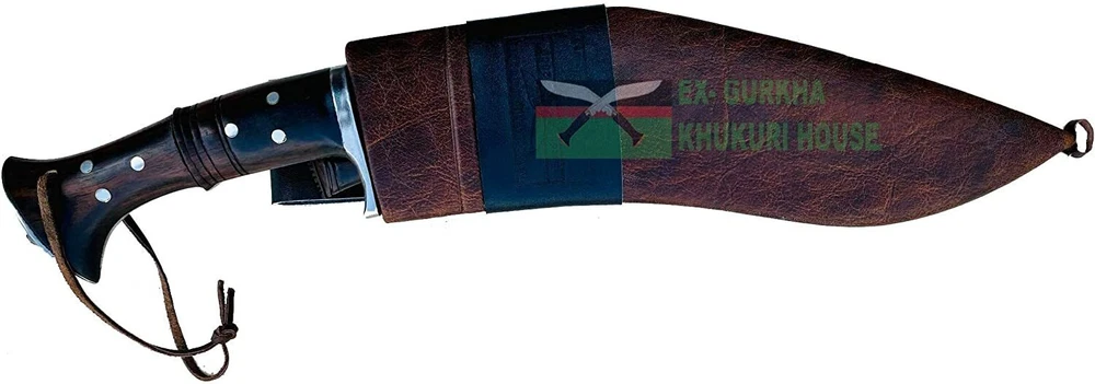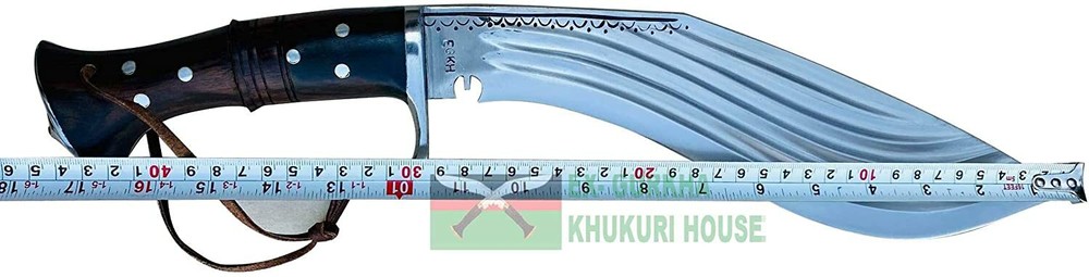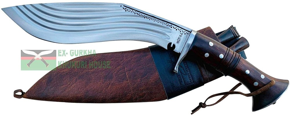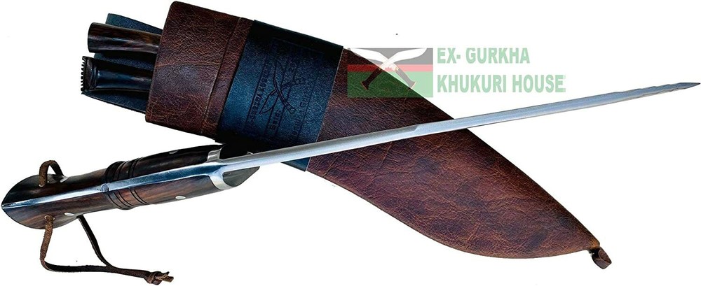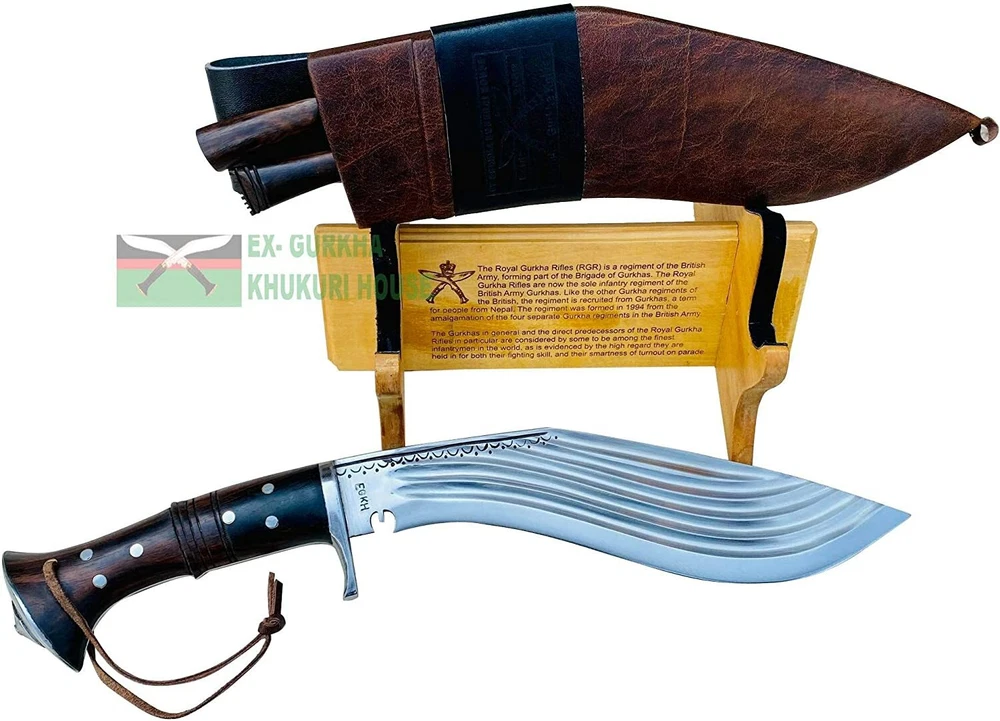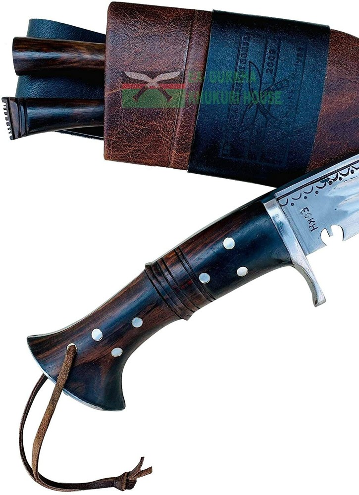 WELCOME TO EX-GURKHA KHUKURI HOUSE Ex-Gurkha Khukuri House is the finest and largest Khukuri /kukri maker/Manufacturer/Retailer in Nepal. Please contact us for wholesale kukri pricing. Dealing in The Genuine Gurkha Kukri directly from the Home Land Of The Gurkhas! CLEARANCE SALE 50% OFF 12” 5 fullers Blade Full Tang Khukuri, Farmers Working Knife :- About 12” 5 fullers Blade Full Tang Khukuri, Farmers Working Knife : - This is a 12" panawal full tang ganjawal 5 fuller Kukri is one of the latest product of EGKH . The "fuller" minimize the unnecessary weight of the blade and demonstrate of pure skill and expertise that makes kukri not only beautiful home decor but also the best working tools by equally distributing the impact/pressure felt by the edge when slammed against an object, timber, firewood, cleaning bushes, and chopping bones, etc. The notch (kaura or kaudi) in the blade near the hilt of most khukuri serves as a conduit for the blood on the blade to drip out as well as a device for catching and neutralizing any enemy blade. The handle is made from a mixture of rosewood. It has a full flat tang blade which means that the metal of the blade fully goes through the handle to the end for maximum strength and horn and Water Buffalo bones are glued to the handle part and further riveted with white metal to strengthen the whole fixture. The blade is made from highly graded carbon steel. A metal hand guard is attached just above the handle at the bottom of the blade of the kukri which is known as Kabjawal for the safety of the user. The sheath is an artistic ganjawal design made from refined mountain yak leather. This is a handcrafted kukri therefore please note that each one might have slight variations in measurement. Blade Size and Type: 12-inch (30.48) unpolished blade, Handle Size and Type: 5.5 inches (13.97 cm) Rosewood full Tang. Overall: 17.5 inches (44.45 cm) thickness: 11 mm Material Used: Highly Graded Carbon Steel for the blade mountain yak leather in ganjawal design for the sheath bone and horn for the Handle, and Pinewood for the Scabbard (inside). Where this Kukri is Made? The origin of the Kukri is in Nepal. Dharan is a small Gurkha town that is located in eastern Nepal. Dharan is a very famous and important place for Gurkha recruiting. We have our own factory in Dharan, there are over 200 blacksmiths (metal smiths, Kamis). And all the Kukri they made by hand. This is a handcrafted kukri therefore please note that each one might have slight variations in measurement * Material Used: Highly Graded Carbon Steel 5160, water Buffalo Leather for Scabbard(outside) and rosewood for the Handle, Pinewood for the Scabbard (inside), Brass, and "Laha" ( Nepali Traditional Glue). * Place Of Origin: EGKH Factory in Dharan (East Nepal) * Steel Hardness : spine=22-25 RC, belly=45-46 RC, edge=58-60 RC * Karda & Chakmak: These are small knives that come with Kukri. Karda is a small knife used for skinning animal hairs. And Chakmak is used of sharpening the Kukri blade in its blunt. When you bid or buy this In order you will also get these two unique knives. * Wooden Stand: The wooden display stand shown is made of Rosewood and very smooth finishing. If you wish to get a wooden display stand, it cost you an additional $ 10.00 and will ship in a single shipment with Kukri with NO additional. * Please note: Please contact us before your payment so that you can make one single payment for a kukri & wooden display stand. * For Foldable wooden Display Stand $10 additional charge. Please Note: We listed The Kukri Stock clearance 50% OFF Sale price so we will not accept returns or exchanges for this product, The kukri is brand new very good condition, Scabbard, and two small Utility Knives are included in the Sale price. Problems........??? please, before leaving negative feedback, contact us and allows us to try to correct the problem. If you have any queries please don't hesitate to contact us . Strictly for Over 18?s Only We may request a copy of your ID to verify your age before we ship the item EGKH since 1999 in Nepal Genuine Gurkha Kukri Knives From the Homeland Of Gurkha In Nepal. Buy with Confident, the Quality & Authenticity are 100% Guaranteed THANK YOU VERY MUCH FOR VISITING