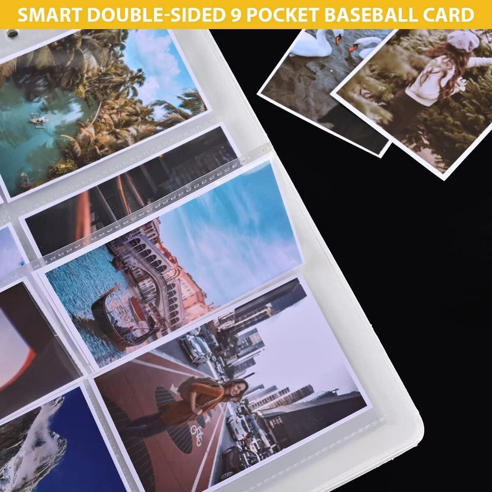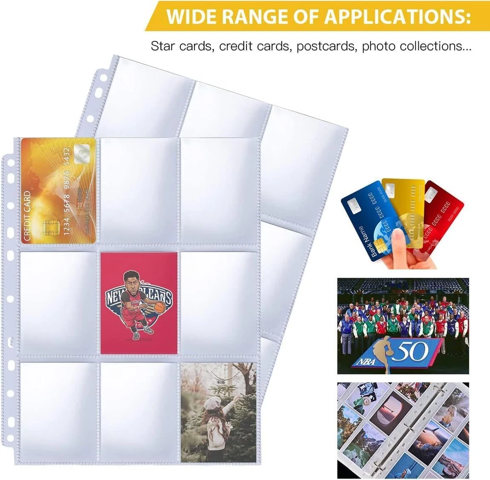 DOUBLE-SIDED DISPLAY: Each page protector has 9 pockets, double sided display can display 18 pieces,50 pages, you can put two cards in one sleeve, can display 900 long cards, suitable for card stock for 2/3/4 binder, organize and properly protect your card. THICKENED 9 POCKET CARD SLEEVE: Our trading card sleeve pages is made of transparent high-quality plastic, acid-free, non-toxic, PVC-free, high transparency, can be used for a long time without bending. Thickness 0.06MM. FITS STANDARD SIZES: Page Size: 9" x 11.2". Pocket Size: 2.75 x 3.55 inches.Great for standard size cards, Pokemon cards, coupons, game cards, business cards/trading cards/baseball/soccer cards. TOP LOADING DESIGN : Convenient and Fast - Very easy to reach,Cards will not fall as long as you keep the card protector flat or upright, perfect for card storage and display. QUALITY SERVICE: We provide 120 days after-sales service. Any questions, please feel free to contact us. Card sleeves are also ideal gifts for your child's monster game cards, gift cards, game stamps, and more. Take the card holder binder home with you.