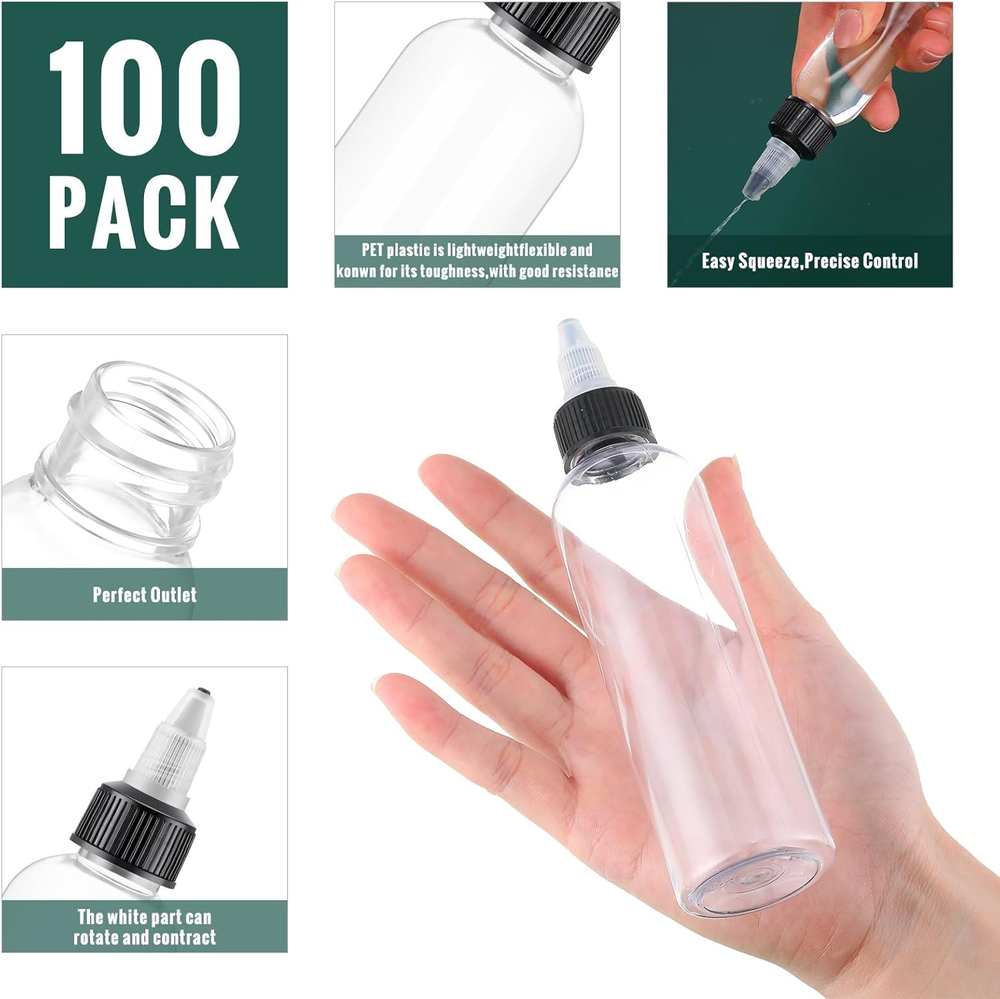 Rich Package: you will be provided with 50 pieces of 4 oz/ 120 ml condiment squeeze bottles in a package, adequate quantity can fully meet your daily needs, also you can share with intimate mates and family members PET Material: made of low density PET plastic material, 4 oz plastic bottles are sturdy yet squeezable, feature good flexibility and high temperature resistance, which will not deform in most solvents, and can be widely applied to tattoo, industrial, scientific laboratory Twist Cap Spout Design: empty squeeze bottle is designed with a twist cap spout, twist the upper cap and the dropper can be well controlled, thus convenient for you to apply a small amount of product to the targeted area, such as applying for cakes, candies, cookies etc., effectively controlling flow, avoiding spills due to over squeezing, and performing well in anti leaking Easy to Use: adopting clear color, plastic squeeze bottles for liquids are easy for you to see the level of contents in the bottle, keeping your items organized and reminding you to replenish the bottle solution in time Wide Application: twist top applicator bottle is indispensable for storing and dispensing a wide variety of liquids and thinners, including oils, solvents, also ideal for white and yellow glues for crafting and woodworking, even to store inks, paints Product description Made of low-density PET plastic material, strong and easy to extrude, good flexibility and high temperature resistance. Screw lid has good sealing, leak-proof performance, suitable for most liquid. Designed with a screw lid nozzle, screwing the top lid gives you good control of the dropper, making it easy for you to apply a small amount of product to the target area.