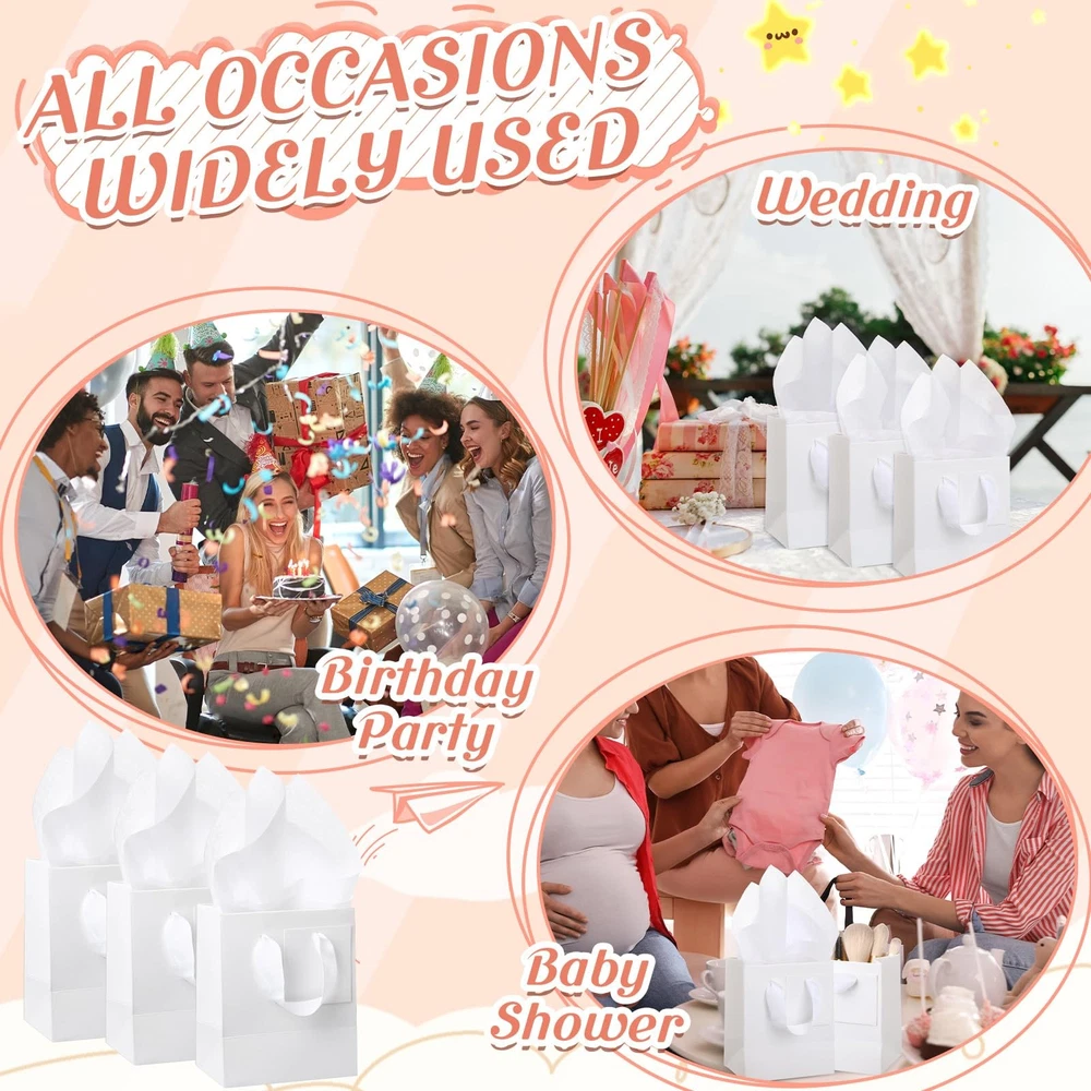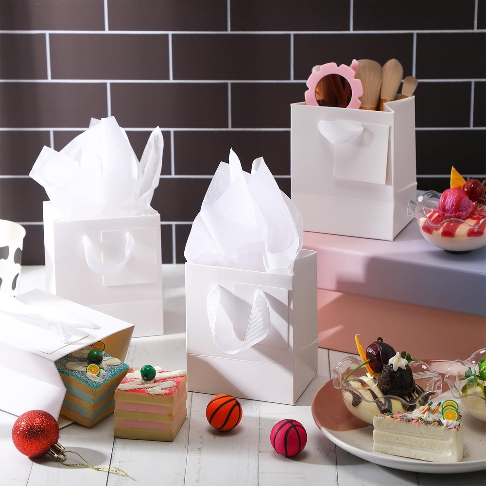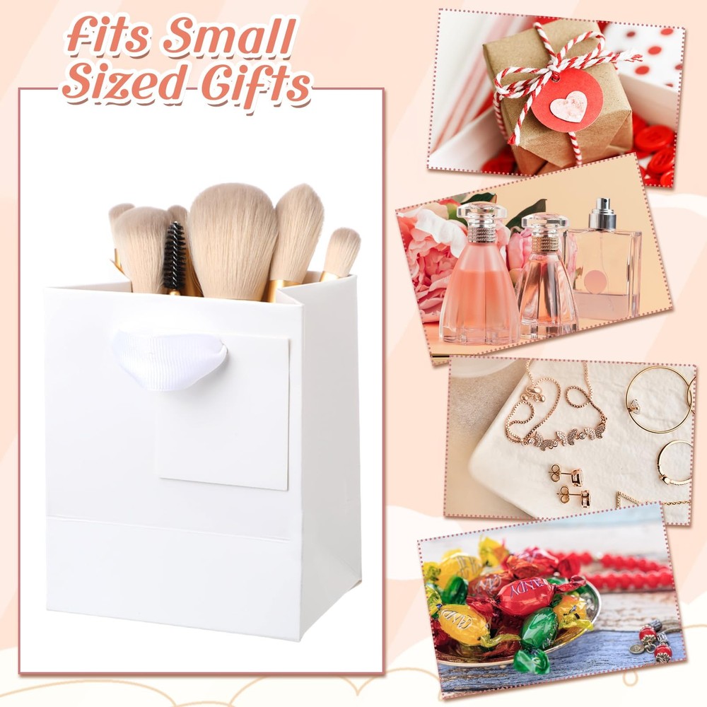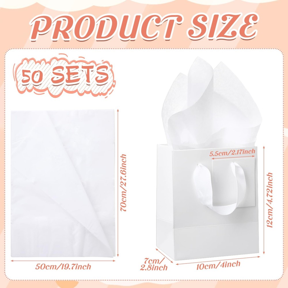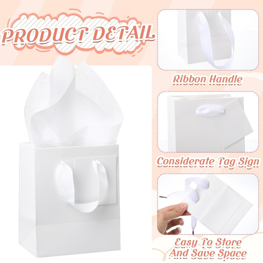 Features: These small white gift bags with handles are lightweight and portable, making them easy to use and carry. No matter where you go, you can put the small items you want to take with you in the bag. These gift bags with handles and tags are reusable and foldable, allowing for easy storage. The blank surface of the gift bags allows for DIY options, providing more creative possibilities. Specifications: Main material: white cardboard Color: white Size (about): Gift bags with handles: 4 x 2.36 x 4.7 inches/ 10 x 6 x 12 cm Tissue paper: 27.6 x 19.7 inches/ 70 x 50 cm Tags: 2 x 2 inches/ 5 x 5 cm Package includes: 50 x Gift bags with ribbon handles and hang tags 50 x Tissue paper Notes: Manual measurement, please allow slight errors on size. The color may exist a slight difference due to different screen displays. Sufficient Quantity for Gift Wrapping: the package includes 50 pieces of white gift bags with handles and gift tags, as well as 50 pieces of white tissue paper, providing enough quantity for gift wrapping; Each gift bag is made of quality white cardboard and measures approximately 4 x 2.36 x 4.7 inches/ 10 x 6 x 12 cm, which is good for most small items; The tissue papers measure approximately 27.6 x 19.7 inches/ 70 x 50 cm, which is large enough to wrap most Easy to Grip: these gift bags with handles are easy to grip and carry, providing a convenient using experience; The sturdy bottom allows the gift bags to stand on their own, keeping the contents safe and contained; The handles are sturdy and long lasting, ensuring that the gift bags can be carried without breaking Quality Material and Suitable Size: the small white gift bags are made of quality white cardboard, which is sturdy, smooth, and will not fade, deform, or break easily; The material is odorless and safe, ensuring a pleasant using experience; The suitable size of these gift bags can fit most small items, such as small gifts, candies, snacks, toys, and more Hang Tags for Writing: these hang tags on the white small bags provide ample space for writing, allowing users to express themselves fully; The size of these hang tags is approximately 2 x 2 inches/ 5 x 5 cm, which is large enough to write a message or label; Users can write down something special, such as a thank you note, a message of love, or a gift description Wide Application: these small gift bags with handles are suitable for most occasions and parties, making them practical and thoughtful gifts for guests; They are good for gift wrapping, party favors, wedding shower favors, bouquets, and more; With their simple yet elegant design, they can be applied to the occasions you want