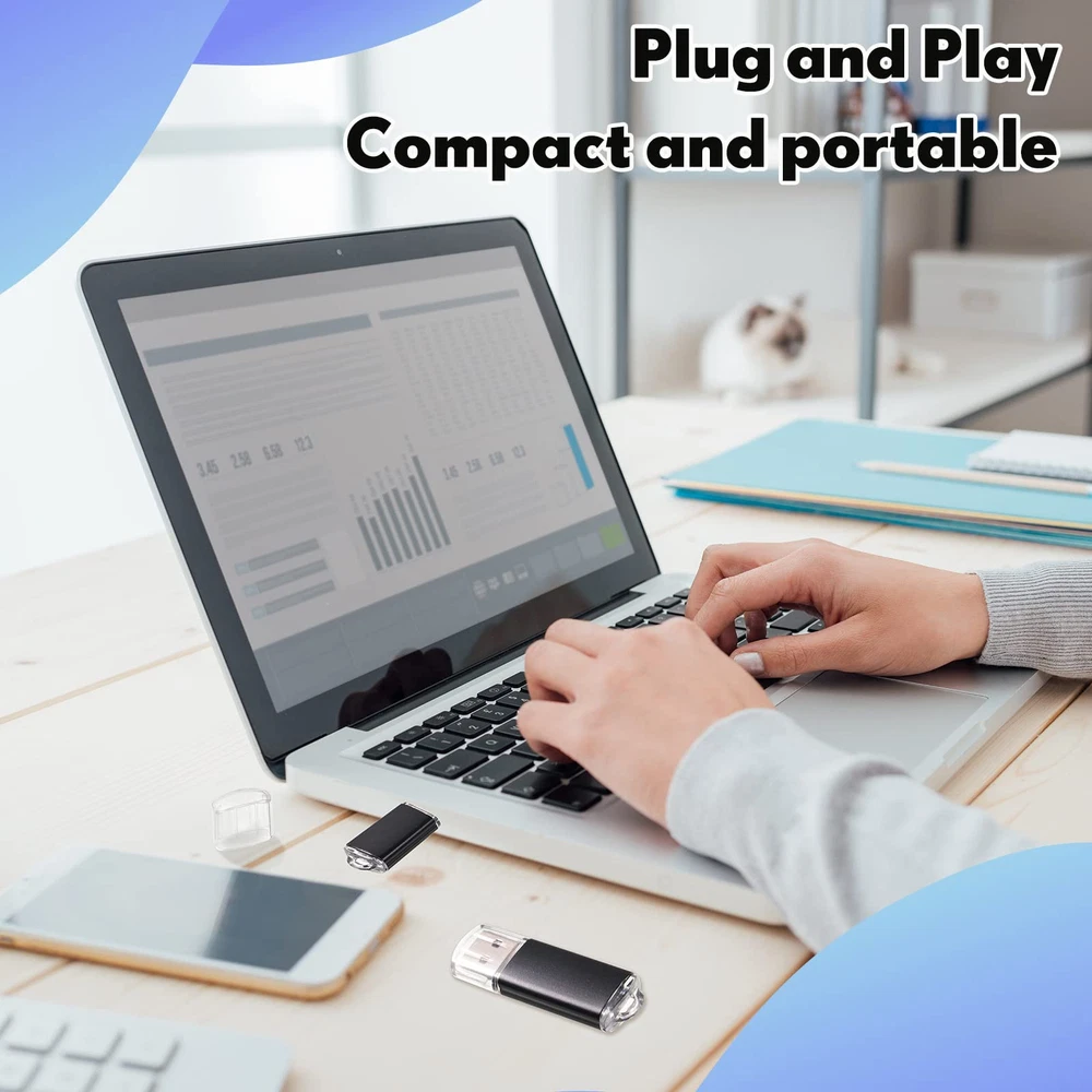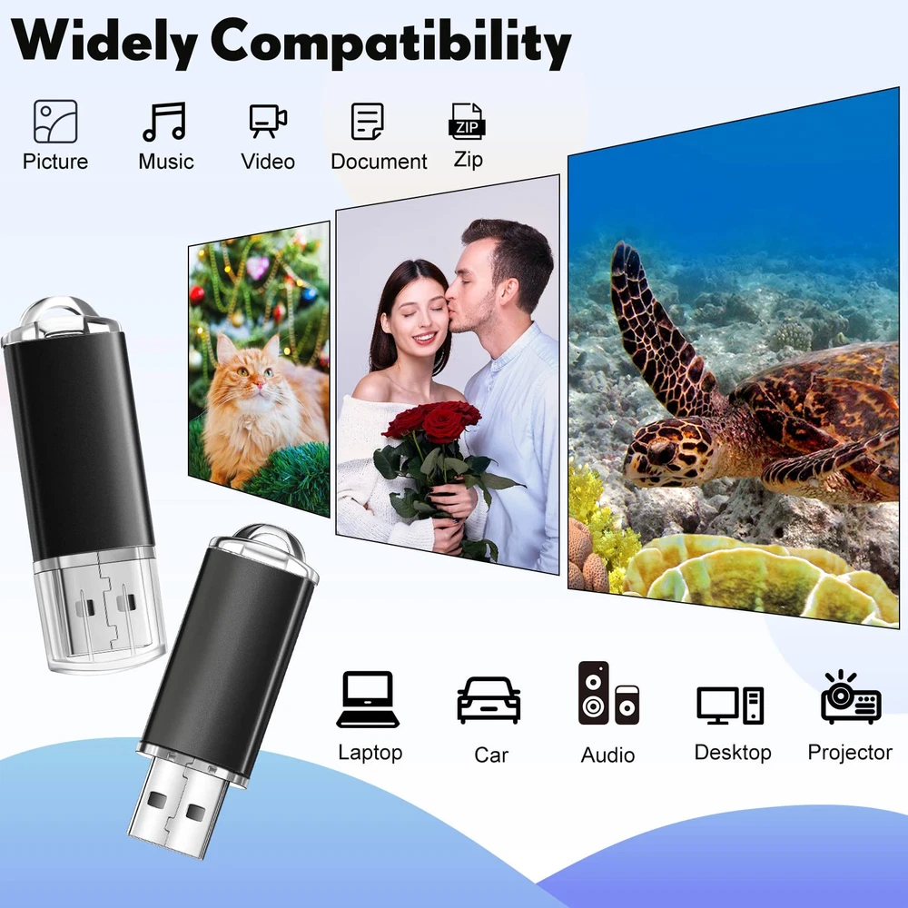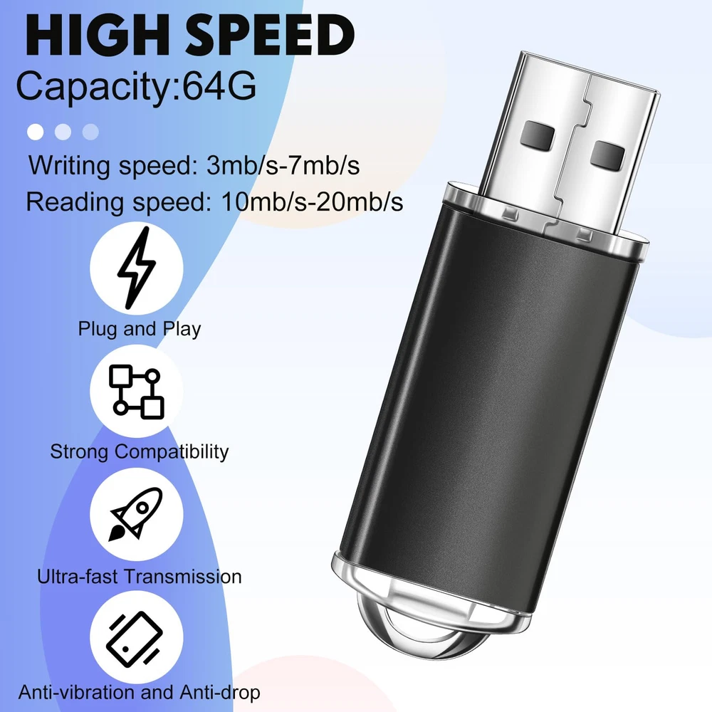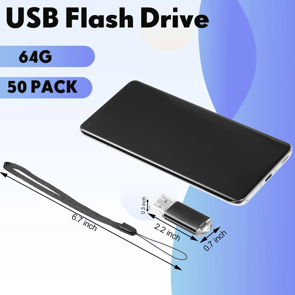 Feature: Widely applied: the computer flash drives can help you identify, mark and store different content. Digital data storage, transfer and sharing for school, business, university, commercial, photographic and other uses. Lightweight and Portable: the mini flash drive has a delicate and compact appearance, with a mini size of 2.2 x 0.67 x 0.3 inches, plus a black lanyard, it is convenient for the USB thumb drive to be at your service at any time. Versatile: USB thumb drives store data for school, car music, business or daily usage. The data includes music, video, photos, movies, manuals, software, etc. Specifications: Material: plastic Color: black Size: about 2.2 x 0.67 x 0.3 inches (5.6 x 1.7 x 0.8 cm) Chip: flash memory chip Interface: USB 2.0 compatible Writing speed: 3mb/s-7mb/s Reading speed: 10mb/s-20mb/s Package include: 50 x 64GB USB flash drives Capacity standard: Flash memory producers are using decimal arithmetic: 1KB = 1000Bit, 1MB = 1000KB, 1G = 1000MB Calculated, the operating system using binary arithmetic: 1KB = 1024Bit, 1MB = 1024KB, 1GB = 1024MB So the actually capacity is 64GB=approximately 58.5GB Warm notes: Please allow slight size error due to manual measurement. The colors may exist slight difference due to different screen. Bulk Flash Drive: you will get 50 pieces of 64GB USB 2.0 flash drives and 50 lanyards, to meet your daily storage and transfer needs for music/video/photos/files/compressed packages; Small and light body, easy to carry and use Safe and Reliable: the USB 2.0 thumb drive adopts flash memory chip, which makes the data transmission and storage process more secure and stable, with faster speed and better compatibility; 64GB flash drives compatible with USB2.0 backward USB 1.1, no need to install additional drivers Plug and Play: USB drives bulk do not need to install any software, just simply plug into the USB port; When the zip drive is working, the red LED will light up, quickly read data files in different formats, improve your work efficiency Portable Flash Drives: the shell of the flash drives is designed with a hat, which can provide effective protection for your USB port, and the end of the drive has a ring for a lanyard or key ring, and a lanyard for you, which is more convenient to carry around Widely Compatible and Plug and Play: compatible with USB 2.0/1.1/1.0, without any software, can be applied for PC, TV, speaker, computer, notebook, car audio and other USB devices; An ideal choice for companies, schools, weddings, customers, or a good choice for business gifts