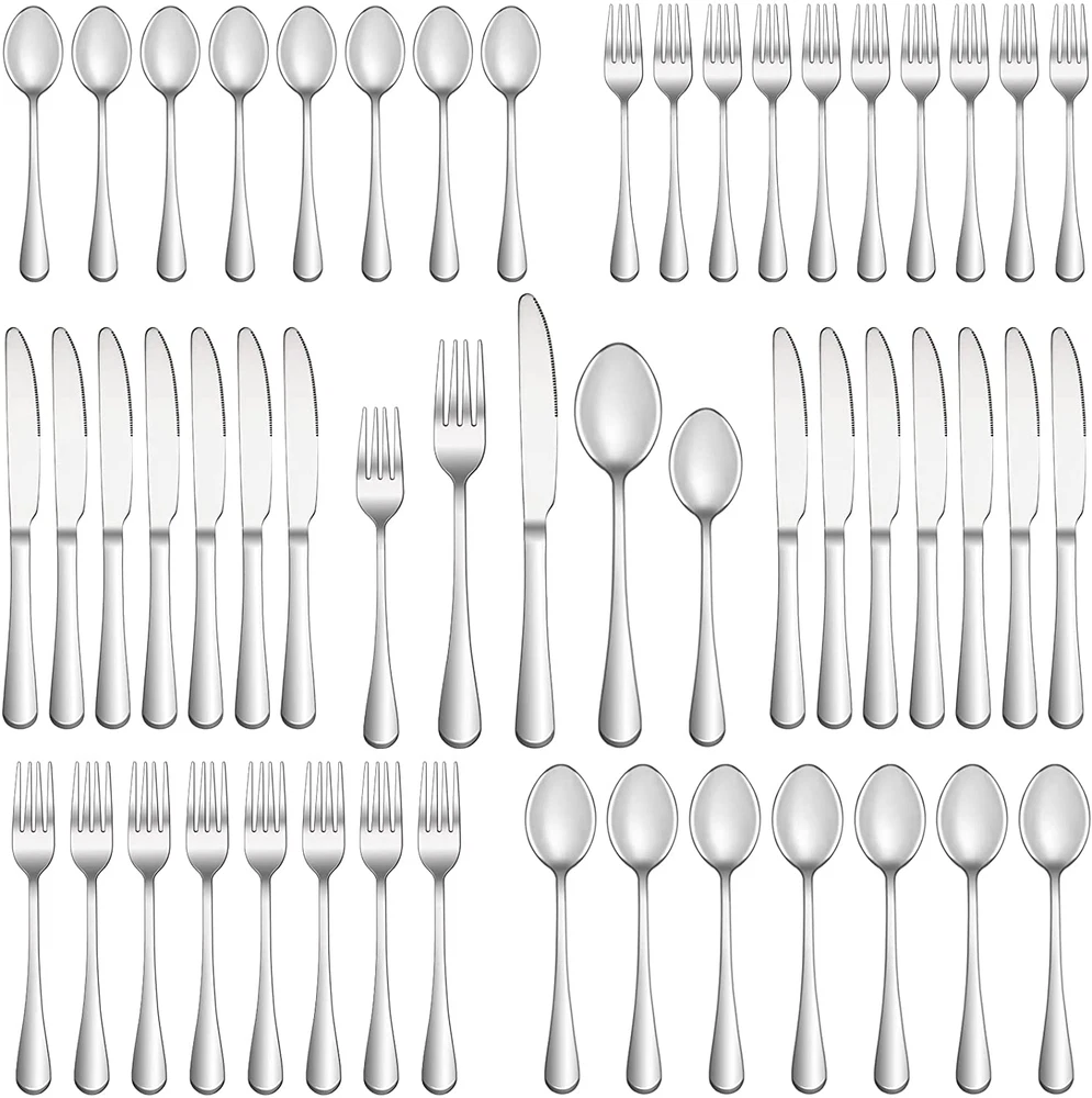 50 PCS SILVERWARE SET SERVICE FOR 10: This silverware set comes with 10 Dinner Forks, 10 Dinner Spoons, 10 Dinner Knife, 10 Salad/Dessert Fork and 10 Dessert/Tea Spoons, essential for families or restaurants. The set is also an irreplaceable dining tool whether it is for daily use or for preparing dinners or parties. PREMIUM STAINLESS STEEL: This flatware set is made of high quality food grade stainless steel which is very durable, rust-proof, corrosion resistant, non-toxic, BPA free, no metal aftertaste. Meanwhile, its sturdiness ensures that it will not bend easily providing you with long - term use. Most importantly, they’re dishwasher safe. PROPER WEIGHT AND COMFORTABLE HANDLE: Unlike other brands, the curvature of our utensil handles is designed according to the posture of the hand, and the appropriate weight and perfect balance are added to ensure maximum comfort during use that avoids you feel tired. Moreover, the smooth edges ensure safety and no scratches. EXQUISITE WORKMANSHIP AND ELEGANT SHAPE: Highly mirror polished, smooth edges that ensures the safety of your lips. Our silverware set designed to seamlessly add more elegance and class to your table. It has a classic design allows for mix and match with your existing silverware to elevate everyday meals into a fine dining experience. MULTIPLE USES: Choosing a good set of cutlery is not only for everyday use, but also for upcoming holiday parties, gatherings, weddings, camping and entertainment, or for buffets and banquets at restaurants or hotels. It’s also a wonderful choice as a gift. Product Description Specification: Material: food grade stainless steel Package includes: 9" Dinner Knife x 10 8" Dinner Spoon x 10 8" Dinner Fork x 10 6.7" Salad Fork x 10 6.7" Teaspoon x 10 Using instruction: 1.Please wash the silverware set before first use to make sure no manufacturing residue. 2.Please clean the silverware set after using and dry the pieces for their durability. 3.Please do not use iron wire to scratch the pieces to keep their smooth surface. 4.The silverware set is Dishwasher Safe so you can run it in dishwasher to save your labor. Multi polished, our silverware set have very smooth edge, which couldn't hurt you when used. Specially treated surfaces, our silverware set could stay shiny after years used. These tableware have proper thickness and uniform weight distribution, so that it has a good balance, which makes it more comfortable to use and not easy to feel fatigued. Also suitable for teenagers and young people. The curvature of our tableware handle is designed according to the posture of the hand, which makes it more comfortable to hold and will not feel tired after long-term use. The handle has some thickness, so it is comfortable to grip, and is strong enough not to bend or break.