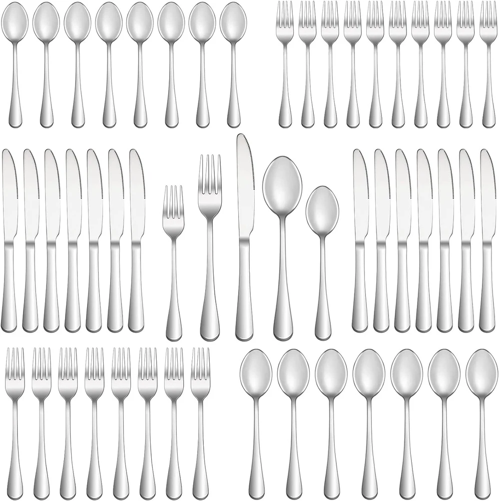 50 Piece Silverware Set Service for 10,Premium Stainless Steel Silver Product Details Brand: MUTNITT Number of Pieces: 50 Material: Stainless Steel Color: Silver Product Care Instructions: Dishwasher Safe Recommended Uses For Product: Indoor Special Feature: Mirror Polished, Durable, Rust Resistant Finish Type: Polished Included Components: 10 Dinner Knives, 10 Dinner Spoons, 10 Dinner Forks, 10 Salad Forks, 10 Teaspoons Style: Tableware Is Stain Resistant: Yes Is Dishwasher Safe: Yes Manufacturer: MUTNITT Package Dimensions: 9.65 x 5.8 x 2.09 inches Item Weight: 4.94 pounds Item model number: MUTNITT 50 PCS SILVERWARE SET SERVICE FOR 10: This silverware set comes with 10 Dinner Forks, 10 Dinner Spoons, 10 Dinner Knife, 10 Salad/Dessert Fork and 10 Dessert/Tea Spoons, essential for families or restaurants. The set is also an irreplaceable dining tool whether it is for daily use or for preparing dinners or parties. PREMIUM STAINLESS STEEL: This flatware set is made of high quality food grade stainless steel which is very durable, rust-proof, corrosion resistant, non-toxic, BPA free, no metal aftertaste. Meanwhile, its sturdiness ensures that it will not bend easily providing you with long - term use. Most importantly, they’re dishwasher safe. PROPER WEIGHT AND COMFORTABLE HANDLE: Unlike other brands, the curvature of our utensil handles is designed according to the posture of the hand, and the appropriate weight and perfect balance are added to ensure maximum comfort during use that avoids you feel tired. Moreover, the smooth edges ensure safety and no scratches. EXQUISITE WORKMANSHIP AND ELEGANT SHAPE: Highly mirror polished, smooth edges that ensures the safety of your lips. Our silverware set designed to seamlessly add more elegance and class to your table. It has a classic design allows for mix and match with your existing silverware to elevate everyday meals into a fine dining experience. MULTIPLE USES: Choosing a good set of cutlery is not only for everyday use, but also for upcoming holiday parties, gatherings, weddings, camping and entertainment, or for buffets and banquets at restaurants or hotels. It’s also a wonderful choice as a gift.
