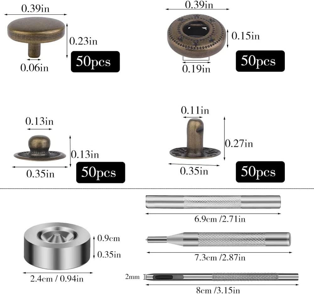 Store New Arrivals Add to Favorite View Feedback Contact 50 Sets Leather Snap Fasteners Kit 10Mm Bronze Metal Snap Buttons Kit Stainless Steel with 4Pcs Snap Fastener Installation Tools for Sewing Clothing, Bracelets, Jackets, Bags Belt, DIY Crafts Description Item model number 01 Unit Count 50.0 Count Style Bronze Color Bronze Material Stainless Steel Country of Origin China Item Weight 5.4 ounces Head Style Button Model Name Leather Snap Recommended Uses For Product Belt Product Dimensions 1.97 x 1.18 x 0.79 inches Manufacturer 01 Snap Button Kit Includes: 50 pairs of snaps kits, each pair has 4 small parts, caps, washers, sockets and studs, also comes with 4 installation tools. These will be packaged in a transparent plastic box, convenient for your storage and use. High Quality Material: The snap button is made of alloy, high quality and not easy to rust, long service life, suitable for indoor and outdoor use, even in wet environments. Simple Installation: This metal snap button kit is very easy to install and use, after you are familiar with the 4 installation and punching tools, you only need to tap hard, even a beginner can easily learn to use it. Precautions: Snaps are suitable for thick to medium weight fabrics, not for thicker or denser fabrics or silks. The snap fasteners cap has a diameter of approximately 10mm/0.39 inches. Please refer to the dimensional diagram to confirm that the snap button is the size you need. Wide Range of Applications: These leather snaps can be used to make leather handicrafts, clothes, shoes, hats, canvas, belts, backpacks and more, can fulfil your various leather decorative demands or clothing repair supplies. Product Description Set Includes: 50 Sets Leather Snap Fasteners Kit, 1 * Punch Tool, 1 * Double-sided Base, 1 * Concave Installation Tool, 1 * Pointed Installation Tool Features: Snap fasteners made of metal materials, hard, sturdy and durable, will not easy to get erosion and rust. These buttons are widely used, you can apply them in jackets, backpacks, hats, suits, trousers, shirts, sweaters, belts, jeans, etc. Please Note: These buttons are small items, please keep them away from children to avoid suffocation by misuse. Complete Snap Installation Tool: Made of durable solid steel with high hardness and good wear resistance. An ideal complete multi-tool for all your needs for quick and easy drilling and snap fit. 1 * Punch Tool 1 * Double-sided Base 1 * Concave Installation Tool 1 * Pointed Installation Tool How to Use: 1. Measure the hole location and mark it on the fabric with a pencil. Use the provided punch tool to punch a hole at the mark. 2. From the front of the fabric, thread the tube of the button through the hole you just punched and snap the stud onto the tube of the button. 3. Using the concave tool, tap it vertically so that the snaps engage the fabric. 4. Using the hole punch tool on the other fabric, make a new hole. 5. From the front of the fabric, thread the tube of the button through the hole you just punched and snap the female stud onto the tube of the button. 6. Using a pointed tool, tap it vertically so that the snaps engage the fabric. 7. Check that the snaps are securely installed. ABOUT US We offer the best prices around on high quality products. Our E-store includes media such as books, movies, music and games while offering electronics, toys, sporting apparel, clothing, tools, general home, garden items and more. SHIPPING We are always working hard to ensure your package arrives as soon as possible. Please understand that some factors like weather, high postal traffic, and the performance of shipping companies are outside of our control. We offer free shipping to the lower 48 states and ship within 2 business days of payment, usually sooner. We do not accept P.O. Boxes. Please provide a physical address. RETURNS We offer a 30-Day Return Policy on items which you are not completely satisfied with. You have the option for a full-refund or an exchange of the item. No returns are available on items shipped outside of the USA. PAYMENT We accept PayPal. CONTACT US This page content is yet to come Please ad us to your favorite seller and visit again later Thank You CUSTOMER SATISFACTION We try our very best to make sure every customer is completely satisfied. If there's a problem, message us! We're happy to help