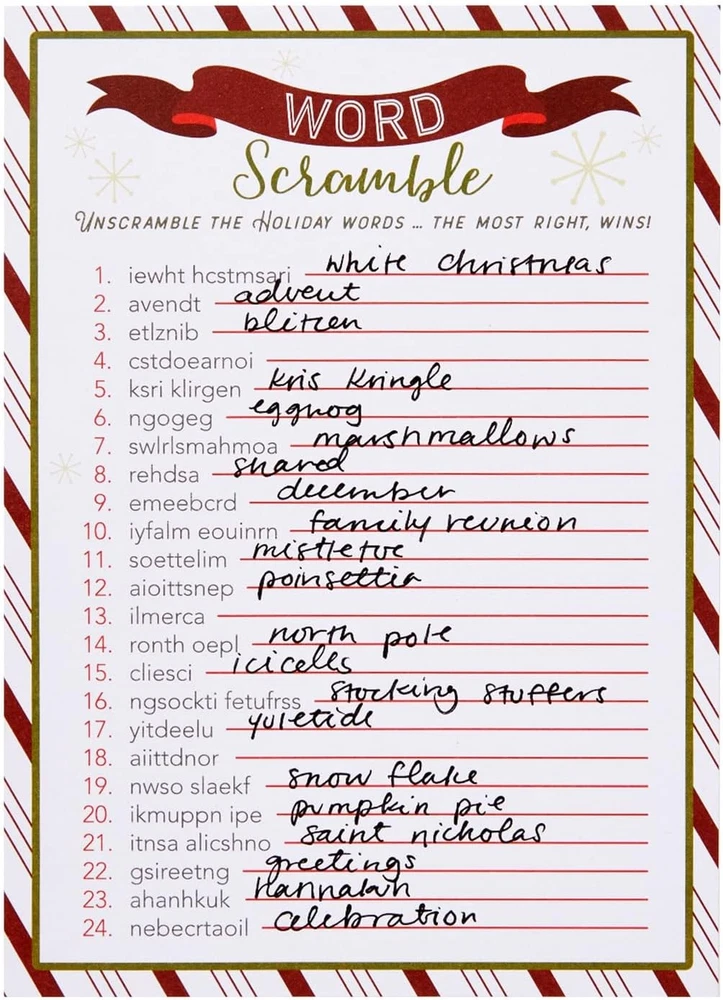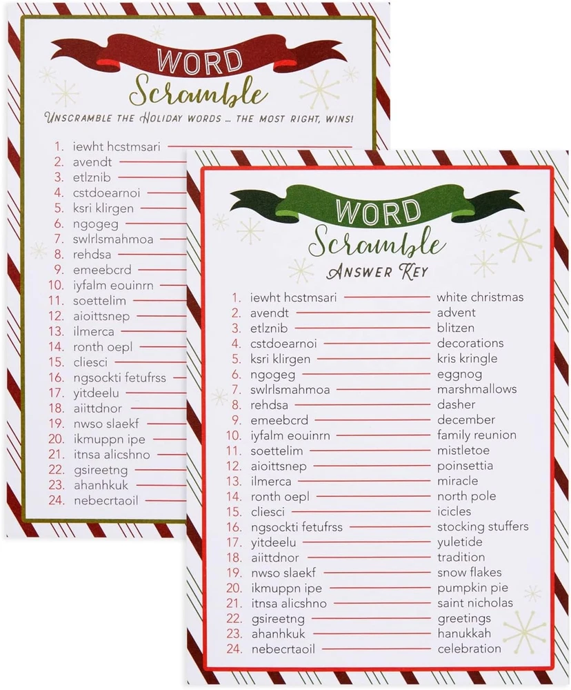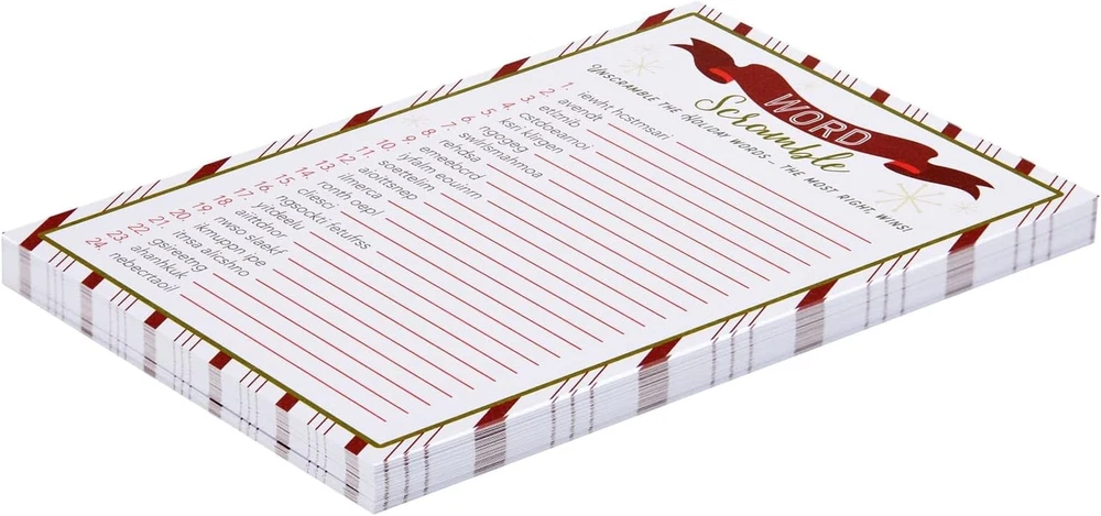 Store New Arrivals Add to Favorite View Feedback Contact 50 Sheets Christmas Word Scramble Game, Holiday Party Activity for Family, Fun Festive Adult Christmas Party Games for Xmas Celebrations Gatherings at Home or Office (5 X 7 In) Description Item Weight 7.5 ounces Item model number CHGYI Is Discontinued By Manufacturer No Package Dimensions 7.13 x 5.04 x 0.51 inches Christmas Games for Party: This holiday games kit includes 50 word scramble cards and 2 answer keys with classic holiday designs; light up your festive celebration with these fun game cards Holiday Party Supplies: Bring holiday cheer to your gathering with the christmas party games for family! Ideal for groups, they’re easy to play, spark friendly competition, and add a lighthearted, festive touch to any celebration. 50 Sheets: Get ready for festive fun with our holiday party games! Each pack includes 50 sheets, perfect for gatherings—making sure there’s enough for everyone to join the holiday cheer! Dimensions: Each Christmas word scramble card is a festive 5x7 inches, perfectly sized for holiday fun! With a beautiful design and challenging seasonal words, the christmas activities family is a must-have. Comes With: Get 50 fun word scramble sheets and 2 answer keys in the christmas party activities kit– ideal for lively holiday gatherings! Perfect for Christmas party games, adding a festive challenge for groups this season. Product Description ABOUT US We offer the best prices around on high quality products. Our E-store includes media such as books, movies, music and games while offering electronics, toys, sporting apparel, clothing, tools, general home, garden items and more. SHIPPING We are always working hard to ensure your package arrives as soon as possible. Please understand that some factors like weather, high postal traffic, and the performance of shipping companies are outside of our control. We offer free shipping to the lower 48 states and ship within 2 business days of payment, usually sooner. We do not accept P.O. Boxes. Please provide a physical address. For shipping outside of the continental USA, we only use eBay's Global Shipping Program.The item is shipped to KY and then sent to the rest of the world. International customers are responsible for all duties and taxes. Continue to check out in order to calculate costs for shipping the item to your country. Messages regarding eBay's Global Shipping Program MUST be directed at eBay EXCLUSIVELY. RETURNS We offer a 30-Day Return Policy on items which you are not completely satisfied with. You have the option for a full-refund or an exchange of the item. No returns are available on items shipped outside of the USA. PAYMENT We accept PayPal. CONTACT US This page content is yet to come Please ad us to your favorite seller and visit again later Thank You CUSTOMER SATISFACTION We try our very best to make sure every customer is completely satisfied. If there's a problem, message us! We're happy to help. WE ACCEPT Copyright © 2021 AutoDS. | All Rights Reserved