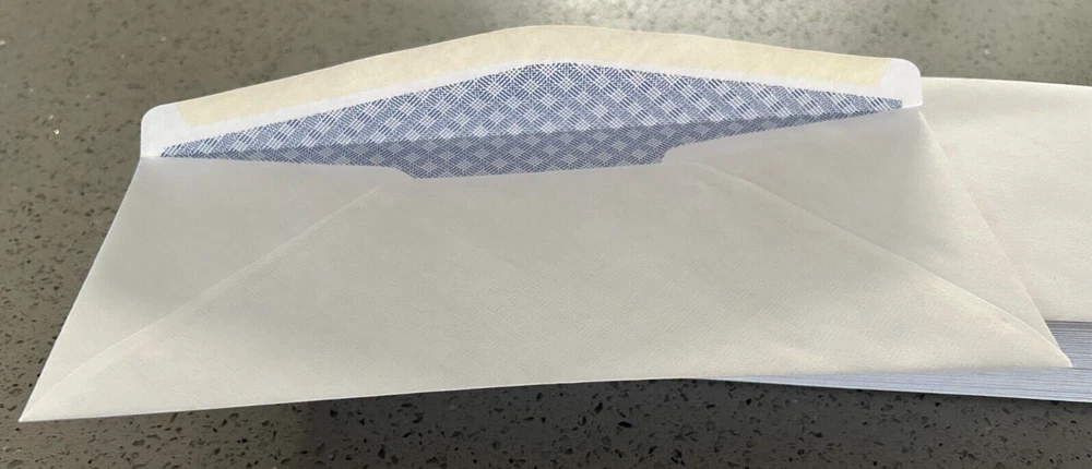 Lot of 50 white window security envelopes #10, 4 1/8 in x 9 1/2in, gummed closure.