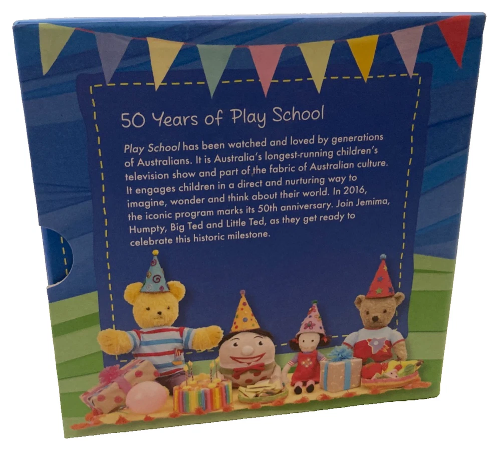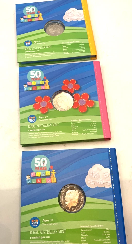 50 Years Play School Three Coin Set RAM 2016 DESCRIPTION Official Royal Australian Mint commemorative three-coin set celebrating 50 Years of Play School. Presented in themed display packaging featuring Big Ted, Little Ted, Jemima and Humpty. Buyer feedback on this set: “Excellent quality, couldn’t ask for better condition or value.” DETAILS • Issuer: Royal Australian Mint (RAM) • Theme: 50 Years of Play School • Year: 2016 • Set Includes: Three commemorative coins • Characters Featured: Big Ted & Little Ted, Jemima, Humpty • Packaging: Original presentation folders and outer sleeve • Manufactured by the Royal Australian Mint under licence from the Australian Broadcasting Corporation • Made in Australia CONDITION • Very good pre-owned condition • Coins appear well preserved in original holders • Packaging shows light storage and handling wear • Complete with outer sleeve and internal folders • Refer to photos for exact condition SHIPPING • Carefully packed to protect packaging and coins