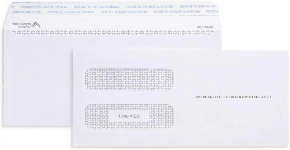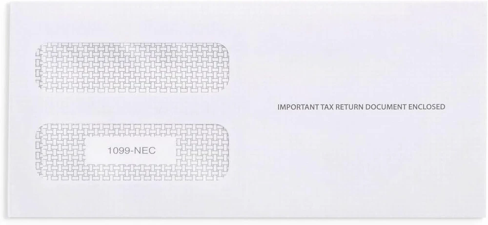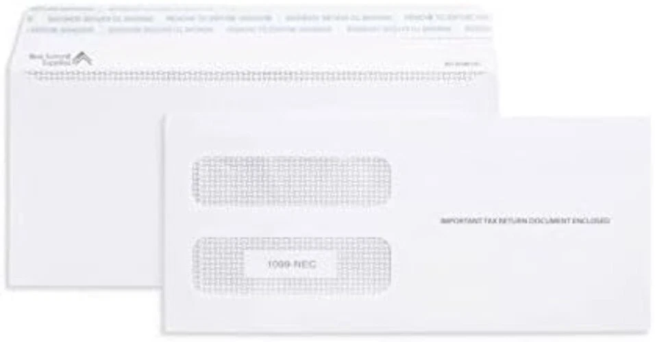 500 1099 NEC Tax Form Envelopes, Fits 3 Part 1099 NEC 2024 Forms, 3 13/16’’ x 8 3/8’’, Peel and Seal Our 2024 1099 NEC envelopes will perfectly fit computer printed 3-part 2024 tax forms. 1099 NEC forms are formatted 3 per page for 2024, and these new small 1099 form envelopes will fit the 3 up forms perfectly. Your pre printed 1099 NEC laser forms will line up perfectly in the windows of our 1099 envelopes when printing from QuickBooks or similar accounting software. Recipient and return will align perfectly in the window, with no worry about the personal information showing through the envelope windows Enjoy complete tax form security with our black security tint design. Sized at 3-13/16 inches x 8-3/8 inches, your 1099 NEC three part forms will slide into our envelopes with ease and not shift during transit. Your contents will stay sealed and secure during transit thanks to the permanent peel and seal glue closure that make it easy to close each envelope without the need for licking or moistening the flap. Simply pull the strip away and press to seal. Ensure the recipients don’t throw away this important mail thanks to the preprinted envelope that states, “IMPORTANT TAX RETURN DOCUMENT ENCLOSED” on the front of the envelope, and prevent confusion with other envelopes during tax season thanks to the “1099-NEC” label printed inside the window. Your 2024 1099 NEC Forms Will Line Up Perfectly 1099-NEC forms are now printed 3 to a page, so your NEC forms will no longer fit in the old 1099 envelopes for 2-up forms. This pack of new 500 NEC form envelopes will fit your pre-printed 3 part 2024 1099-NEC forms perfectly. Envelope dimensions of 3-13/16” x 8-3/8” designed to fit 1099 NEC forms printed with QuickBooks or other accounting software Top window measures 3-3/8” x 7/8” and placement is 1/2" from left edge of envelope, and 2-1/16” from the bottom edge Bottom window measures 3-3/8” x 1-1/16”, with placement 1/2" from the left edge and 11/16” from the bottom edge Tapered peel and seal flap measures 1-3/16” deep for a strong and secure seal, no licking or moistening required thanks to the permanent glue strip under the protective tape that is easy to peel away Strong Security with a Professional Look It can be frustrating to purchase envelopes only to find them flimsy enough to have you worried about their durability during transit. Our envelopes are made of 24 LB White wove paper that will provide a professional look from the box all the way to your destination, while our dark black security tint lining will protect the contents from prying eyes.