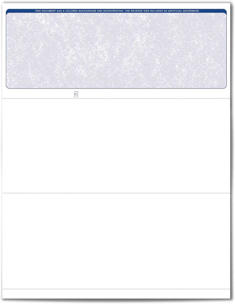 Blank Security Check Paper for Business Checks that comply 100% with ANSI X9 banking standards Contains 8.5" x 11" letter-size 24lb security blank check sheets, one BUSINESS-size CHECK ON TOP, two stubs below Compatible with: VersaCheck, QuickBooks, Quicken, Sage Microsoft GP, NetSuite, MAS 90, MAS 200, XERO and more Security features include erasure protection, micro print lines, security screens, and artificial watermarks VersaCheck ValueChex Blank Check Paper - Form #1000 Business Voucher Check on Top complies 100% with ANSI X9 banking standards. Compatible with: VersaCheck, QuickBooks, Quicken, Sage Microsoft GP, NetSuite, MAS 90, MAS 200, XERO and more. This package contains letter-size 24lb security blank check sheets, each sheet (8. 5" x 11") includes one check on the top third of page, two stubs below, micro-perforated at 3. 5", 7" and 10. 5" from top edge. Security features include erasure protection, micro print lines, security screens, and artificial watermarks. Blank check paper offers extra storage security and the convenience of updating checking information at anytime. For automated check clearing to comply with bank regulations please use Versaink or VersaToner in your inkjet or laser printer.