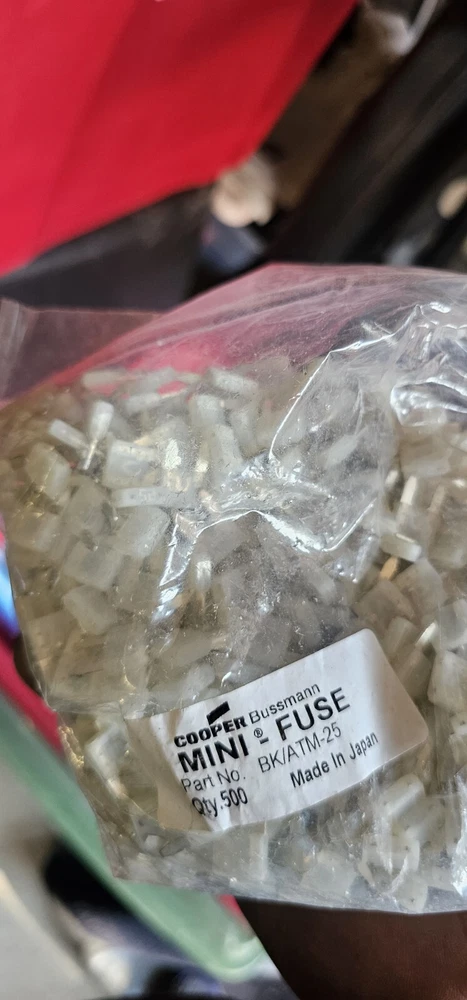 I have 3 unopened bags. This losting is for 1 bag of 500ea This Cooper Bussmann mini-fuse blade is a reliable and efficient choice for your electrical needs. With a maximum amperage of 25 and voltage range of 11-20 V, it is suitable for a variety of applications, including automotive. The fuse body type is blade and it is of the mini bk/atk type, making it easy to install and handle. The brand name speaks for itself, ensuring you get a quality product that will meet your expectations. Whether you are a professional or a DIY enthusiast, this electrical fuse is a great addition to your collection. Don't miss out on this opportunity to upgrade your electrical equipment and supplies.