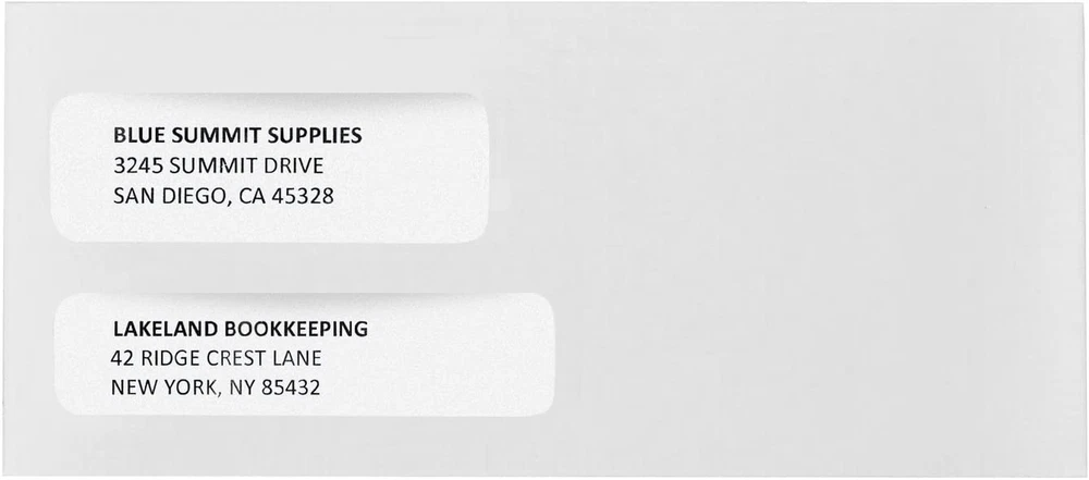 Perfectly fits QuickBooks Invoices and business statements: sender and return address will be visible on your QuickBooks invoices and monthly bills through our unique double window design. Quickly and easily stuff our wide envelopes with several invoices or business statements Provides complete business mail security: your invoices and statements will be completely hidden with our dark security tint design Save time with easy to use flip and seal self-seal design; With no need for licking or moistening, our self seal design allows for sending hundreds of invoices quickly and easily and is guaranteed to stay sealed with no need for tape or glue sticks. Maintains professional look and feel throughout transit with our durable 24 LB white wove envelope paper Product Description #9 Business Envelopes with Security Tint and Secure Seal A standard security envelope that’s ideal for everyday business use, our #9 mailer is made from durable 24lb white wove paper and keeps your documents safe and secure with a strong glue seal and dark security tint lining. This envelope is equipped with a low profile flap design, making it easy to fold and stuff up to 10 sheets of standard letter size paper inside with room for a #8 return envelope so your clients can quickly return payments. It can also be used as a return envelope itself when sent inside a #10 envelope, making the #9 one of our most versatile envelope choices, simple enough for everyday letters and statements, yet professional and secure enough for high-profile business communications. Blue Summit Supplies Secure Seal Types Peel & Seal! Simply pull the backing off the envelope's flap to reveal an adhesive strip that can be folded over and pressed down to seal contents safely inside. Gummed! Moisten the strip of adhesive found on the envelope's flap and fold over to seal contents securely inside. Flip & Seal! No moisture is required, just flip up the bottom flap, fold over the top flap and press to secure contents safely inside. Secure Closure Types: Gummed, Flip & Seal, Peel & Seal Industry Standard Durable 24lb White Wove Paper Cross-Hatch Security Tint Keeps Contents Concealed Compare Blue Summit Supplies #9 Business Envelopes