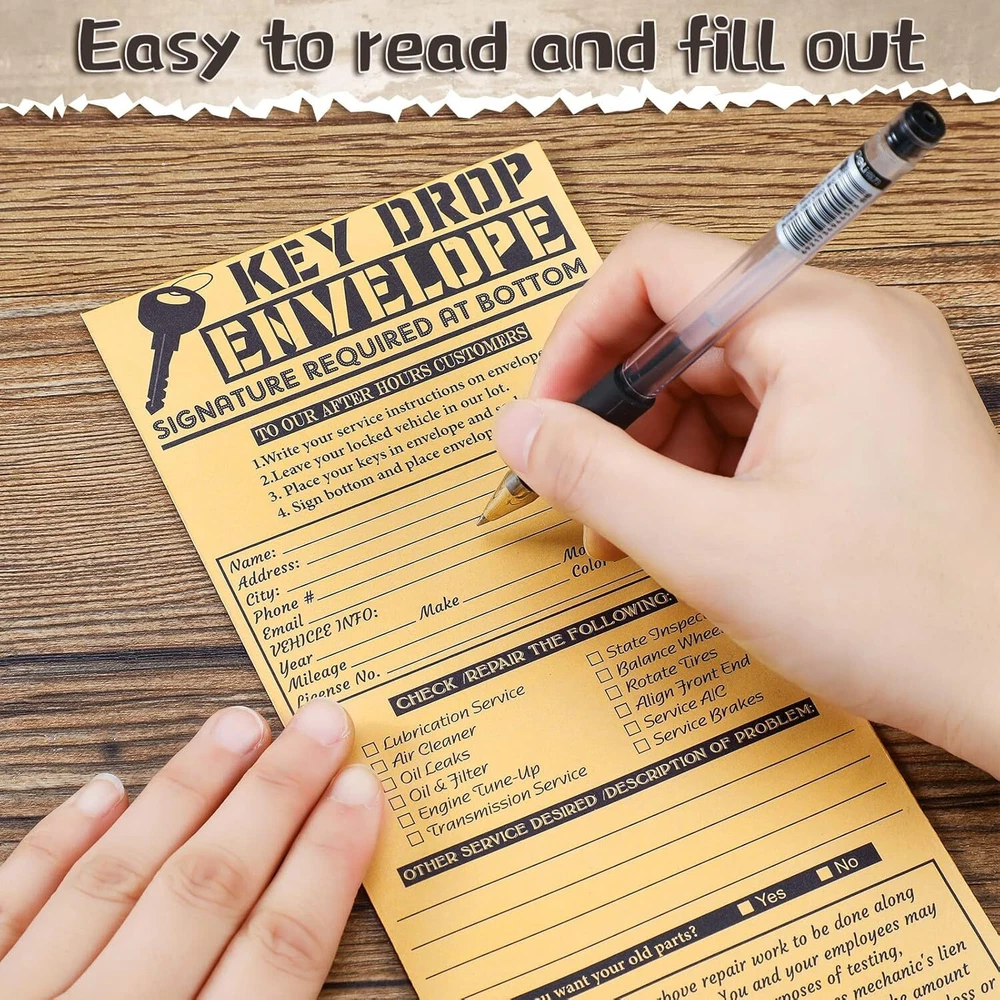 500 Pcs Drop Key Envelopes Auto Shop Repair Service Drop Box Self Adhesive Envelopes for Auto Repair Shops and Mechanics Kraft 4.125 x 9.5 Inches(Classic) Sufficient to Meet Your Needs: you will get 500 pieces of drop key envelopes, you can use them to hold your cards; Sufficient quantity will meet your using needs, and you can share them with your family Reliable Material: our self adhesive envelopes are made of reliable kraft material, safe and sturdy, there is adhesive on the back, will help you seal the envelope and keep the item from getting lost; And their reliable material will serve you for a long time Portable Design: overnight drop box envelopes have proper size in approx. 4.125 x 9.5 inches/ 10.48 x 24.13 cm, can hold your keys, cash, and other items; And you can put them into the mailbox, which will bring you convenience in using Useful and Practical: our overnight envelopes are designed in black font, including lots of information, like name, address, service details, date, signature, etc., print clearly for easy reading, will give you a good using experience Easy to Use: each key drop envelope has the clear template, convenient for you to record maintenance and other work details; It is light and portable, won't take up too much space, you can put it into your bags, and you can carry it to other places easily Color Black Closure Type Self-Seal Occasion Auto Repair Shop Material Paper