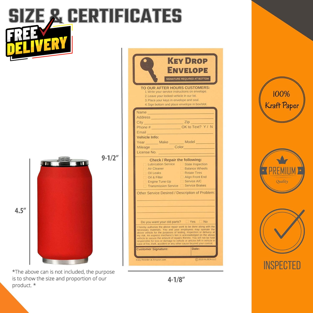 Store New Arrivals Add to Favorite View Feedback Contact 500 Key Drop off Envelopes for after Hours Auto Shop Repair/Service Drop Box O.. Description 500 AFTER HOURS KEY DROP ENVELOPES- night drop envelopes are ideally made in Number 10 Envelope Size measuring 4 1/8 inches Wide and 9 1/2 inches Long with a Peel and Seal closure flap ALL INCLUSIVE EARLY BIRD ENVELOPES-Our early bird drop off envelopes include Customer Drop Off Instructions, Personal Information, Checklist for Requested Repairs/Services, Blank Space for Additional Information, Terms, Signature and Date CUSTOMER CONVENIENCE & SAFETY–Our night key drop box envelopes are made with strong 28lb Kraft paper and may also be used as cashier envelopes, safe drop envelopes for money, cash deposit envelopes or money drop envelopes EASY TO USE REPAIR ENVELOPES-Each overnight key drop box comes with a neatly pre-printed checklist to check off the desired repair Closure Self-Seal Closure Type Self-Seal Style 500 Pack Number of Items 500 Color Kraft Material Paper Material Type Paper Manufacturer Part Number kde Item Weight 6.91 pounds Shape Rectangular Product Dimensions 19.5 x 4.13 x 0.04 inches Size 4. 125 x 9.5 inches ABOUT US Prior to making any purchase from our store, we’d like to introduce ourselves. My name is Shahzad Yaqub , and I am the proud owner of Epic Emporium Deals , located in the great state of Illinois, USA. I have been an active and trusted eBay seller since Jan 14, 2025 . At Epic Emporium Deals , we are committed to offering competitive prices and top-quality products . Our extensive collection features a wide variety of items, including media such as books, movies, music, and games , as well as electronics, toys, sporting apparel, clothing, tools , and general home and garden essentials —and much more! If you have any questions or require assistance, please don’t hesitate to reach out. Your satisfaction is our priority, and we look forward to providing you with an exceptional shopping experience. SHIPPING We are always working hard to ensure your package arrives as soon as possible. Please understand that some factors like weather, high postal traffic, and the performance of shipping companies are outside of our control. We offer free shipping to the lower 48 states and ship within 2 business days of payment, usually sooner. We do not accept P.O. Boxes. Please provide a physical address. For shipping outside of the continental USA, we only use eBay's Global Shipping Program. The item is shipped to IL and then sent to the rest of the world. International customers are responsible for all duties and taxes. Continue to 'check out' to calculate costs for shipping the item to your country. Messages regarding eBay's Global Shipping Program MUST be directed at eBay EXCLUSIVELY. RETURNS We do not accept returns under normal circumstances. However, we will gladly consider a return if the item is received broken or if the wrong size is sent to you. In all other cases, returns will not be accepted. CUSTOMER SATISFACTION We try our very best to make sure every customer is completely satisfied. If there's a problem, message us! We're happy to help.