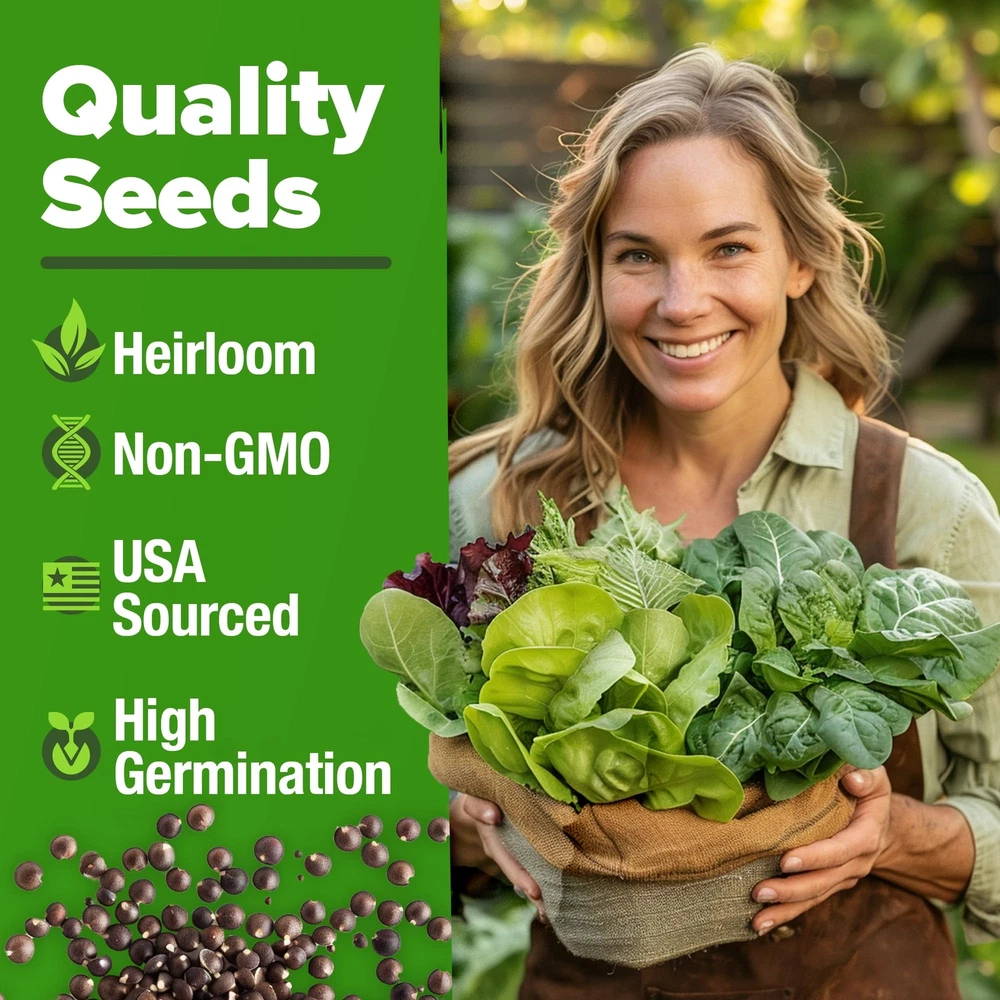 Included in each pack: Varieties - Counts (estimated) Total: ~1500 Paris Island Romaine Lettuce Seeds ~ 150 Buttercrunch Lettuce Seeds- 150 Red Oak leaf Lettuce Seeds - 150 Iceberg - 150 Prizehead Lettuce Seeds- 150 Bibb Lettuce - 150 Dwarf Siberian Kale Seeds - 150 Nobel Giant Spinach Seeds - 150 Arugula Seeds (Roquet) - 150 Swiss Chard Seeds - 150 10 ea Plant Markers 1 ea Planting Guide Our heirloom Non-GMO seeds are great for gardeners, survivalist, , and chefs alike. Get yours today! Harvesting Time: Majority of lettuces - 40-60 days Romain - 75-80 days Crisphead - 70-100 days Looseleaf and butterhead - Anytime during development Considered to be a care-free growing crop Ideal growing PH - 6.0 - 8.0 Ideal temp - 80 degrees or warmer for germination Can easily be started indoors and transferred outside or in a hydroponic system 10 MOST POPULAR LETTUCE AND LEAFY GREEN VAULT PLUS BONUS PLANT MARKERS - Start growing your own garden and eating all-natural, healthy, non-GMO lettuce and leafy greens straight from your yard or indoor garden. FALL AND WINTER VEGETABLE PREP - Plant seeds all year indoors and start your own leafy green vegetable garden to enjoy amazing greens and salads all year. These can be used as a indoor garden, gardening kit, or in an outdoor garden bed. Plant more and use as spouts or micro greens. Complement your bugout bag survival kit with ready-to-grow heirloom survival seeds. 5,000 TOTAL SEEDS & DETAILED PLANTING GUIDE - Our assorted heirloom seeds pack have a large variety of seeds and with high germination rates. These make great lettuce seeds for planting indoor, outdoor, or in a hydroponic system like aerogarden. Included as well is a planting guide in each pack. GREAT GIFT FOR GARDENERS - CHEFS - SURVIVALIST - What else is better than giving a gardener a full of collection to have a bountiful vegetable garden. Seeds are contained inside in waterproof resealable mylar pouch to maintain freshness and quality of the seeds. Our collection of lettuce and greens starter seeds make for a great addition to your prepper gear and supplies. PRODUCT OF USA - Our garden seeds are sustainably sourced in the USA. Have confidence about our quality and 100% satisfaction . These seeds can work with aerogarden pods and other hydroponic systems. Visit and for all kinds of vegetable herb and greens seeds to complete your bug out bag supplies.